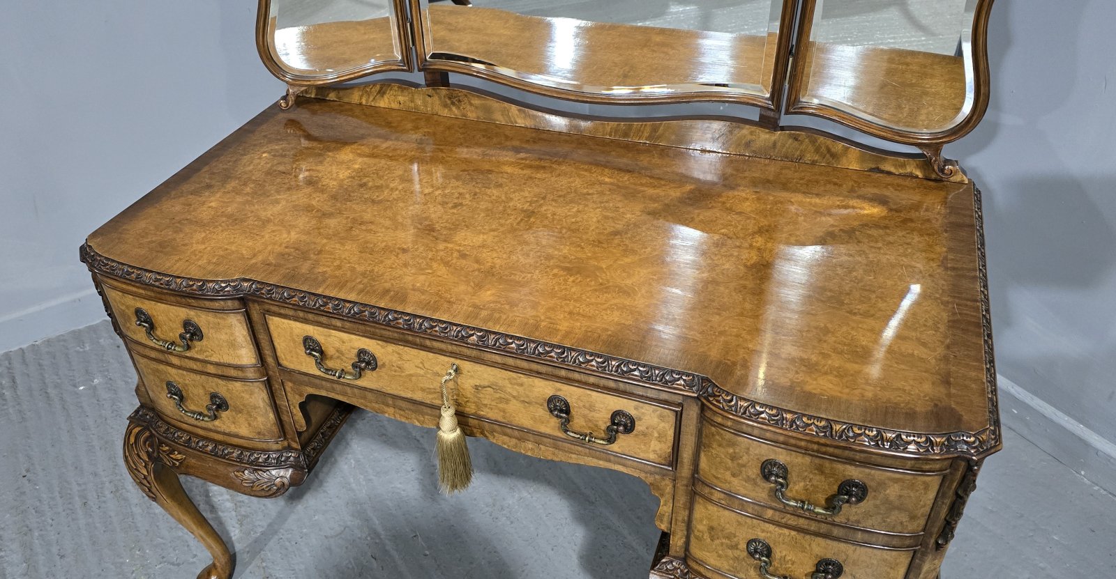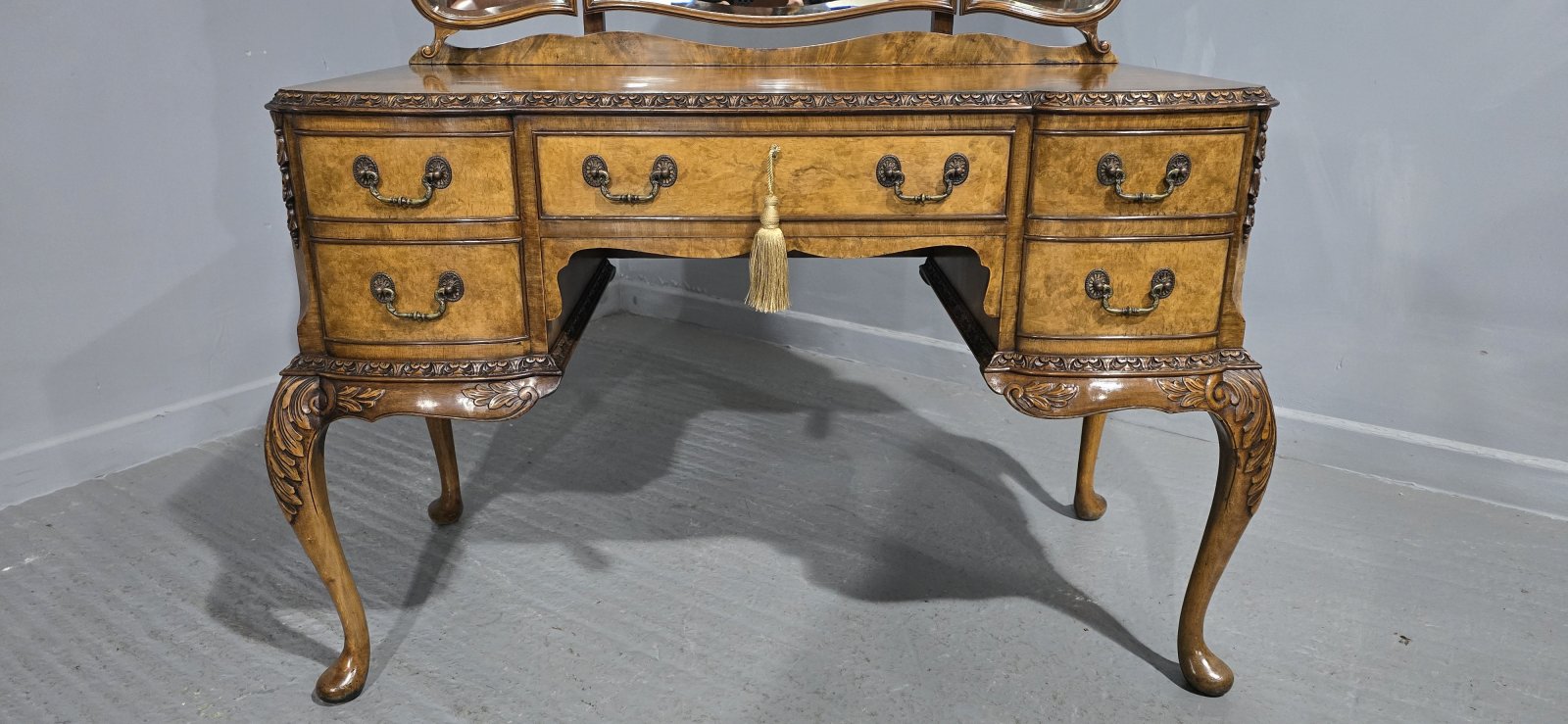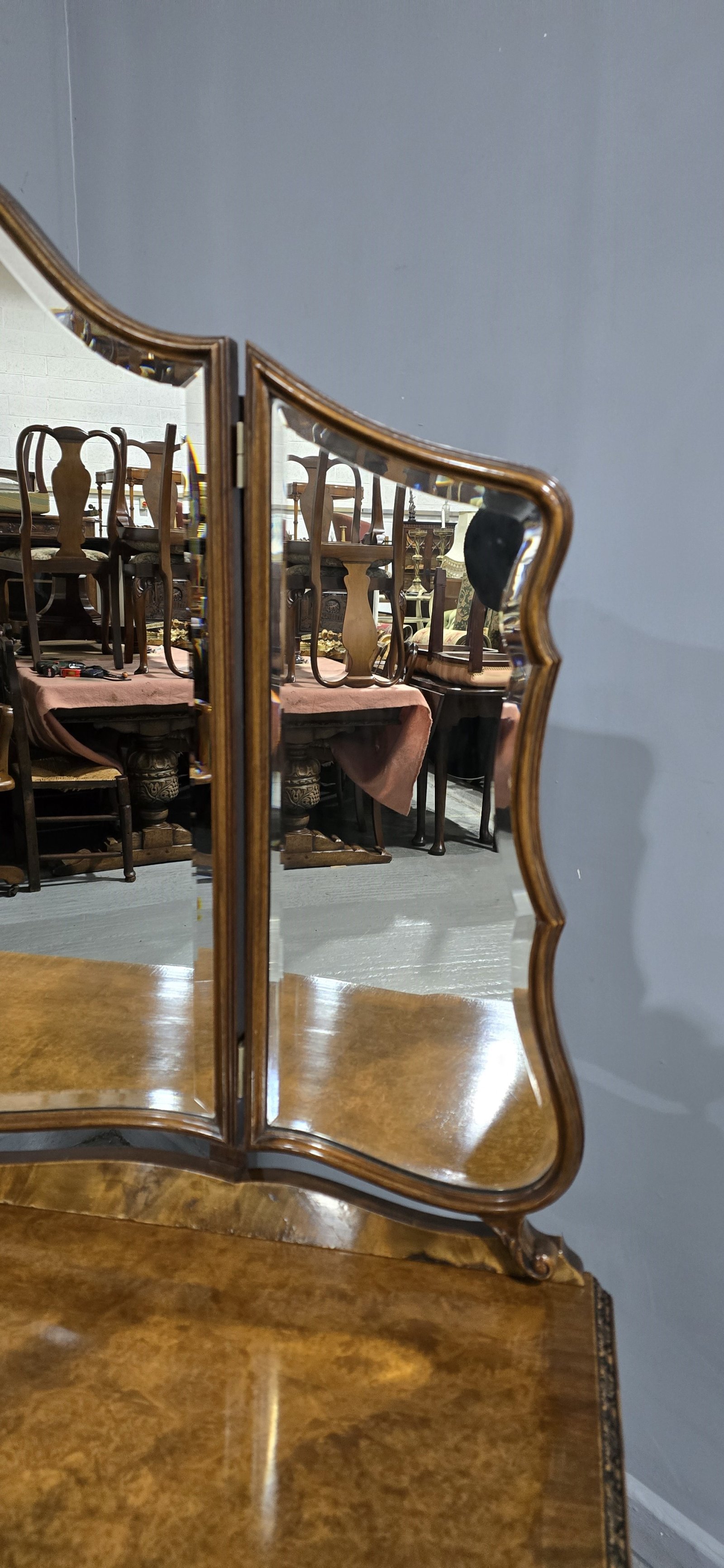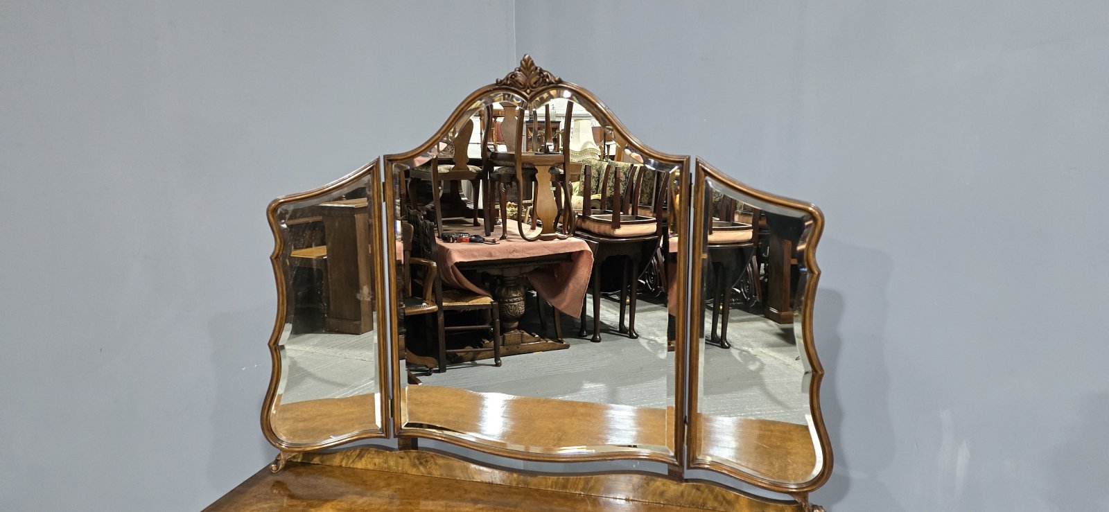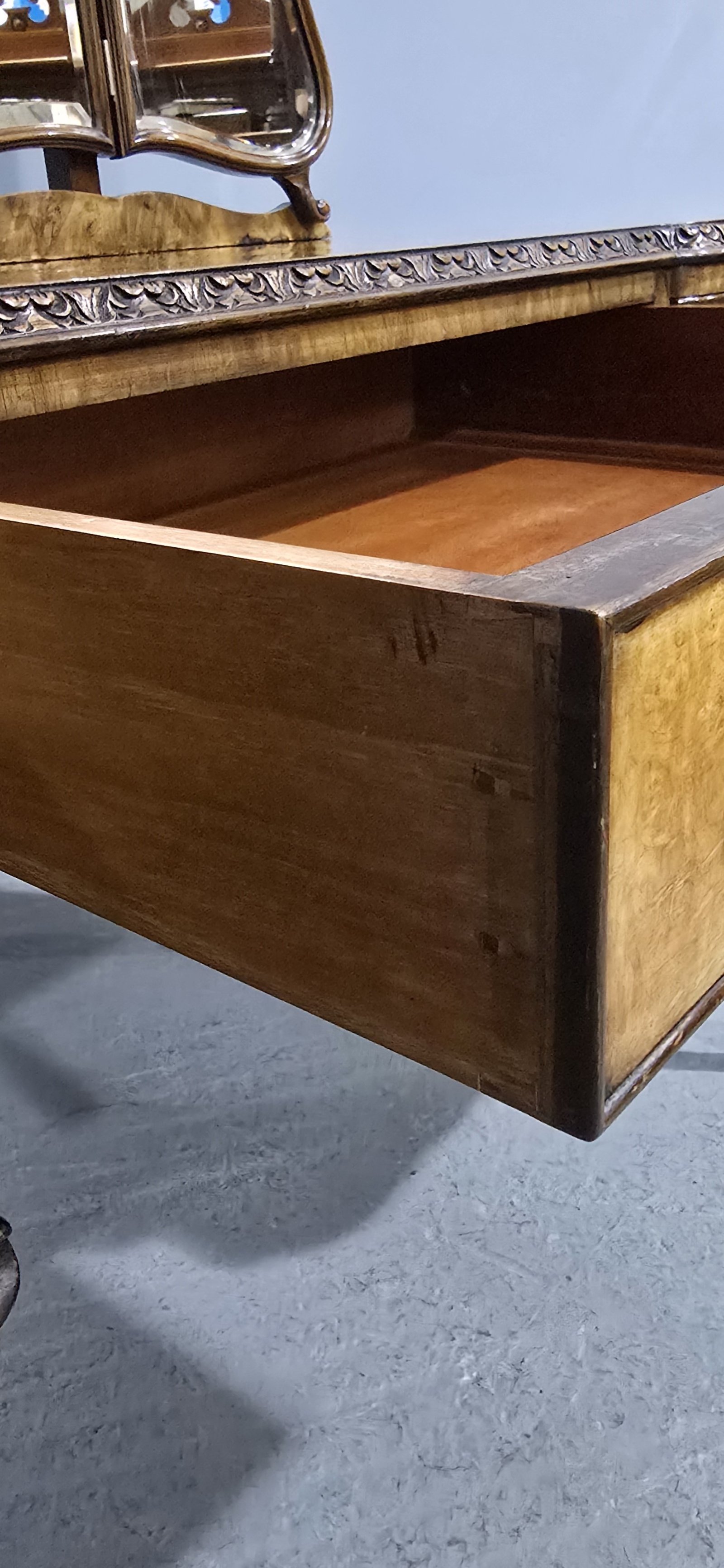 Super quality burr walnut breakfront dressing table with triptych bevelled mirrors, by 'Maples', standing on heavily carved legs and skirt, protective glass for the top and working key, in overall very good home ready condition.