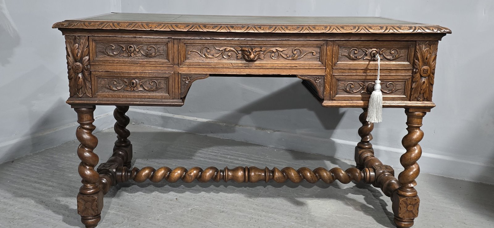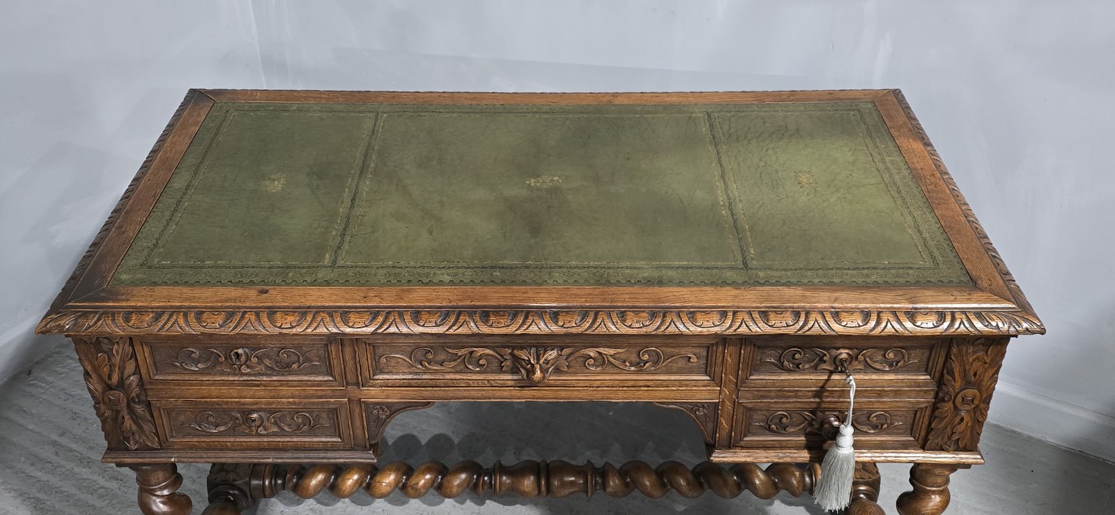A very good green man carved oak desk, twisted legs and stretcher, green tooled leather top, freestanding, in overall very good condition.