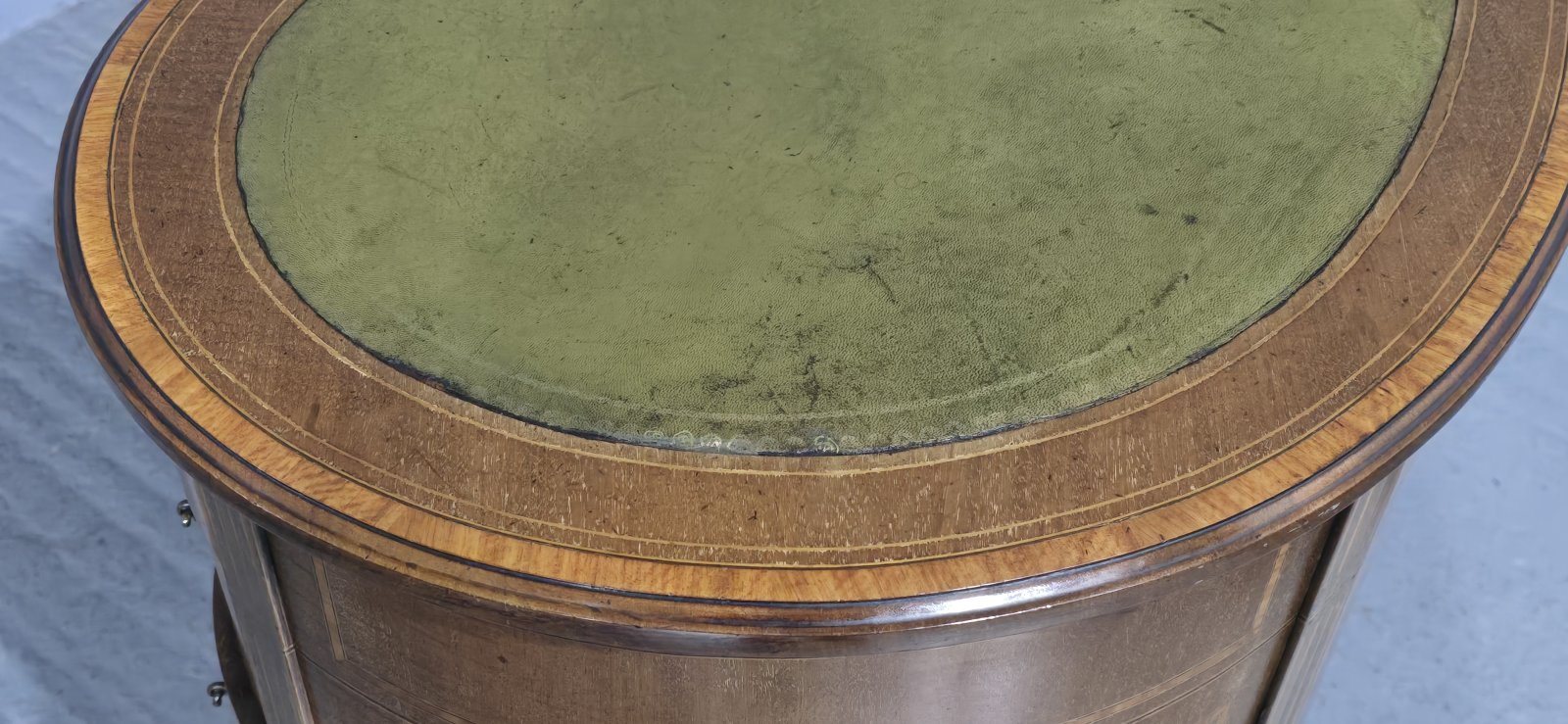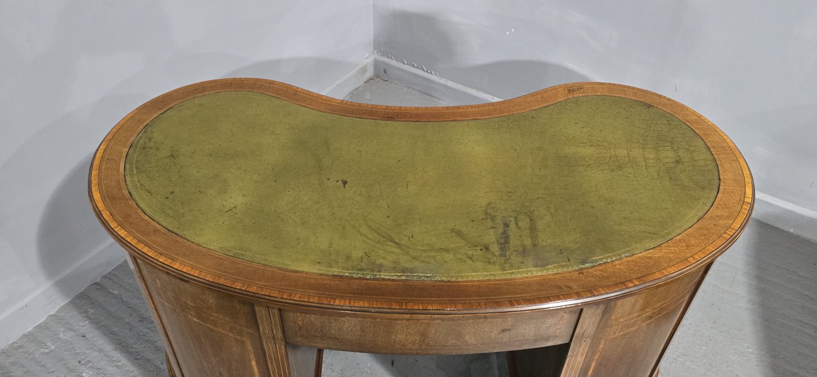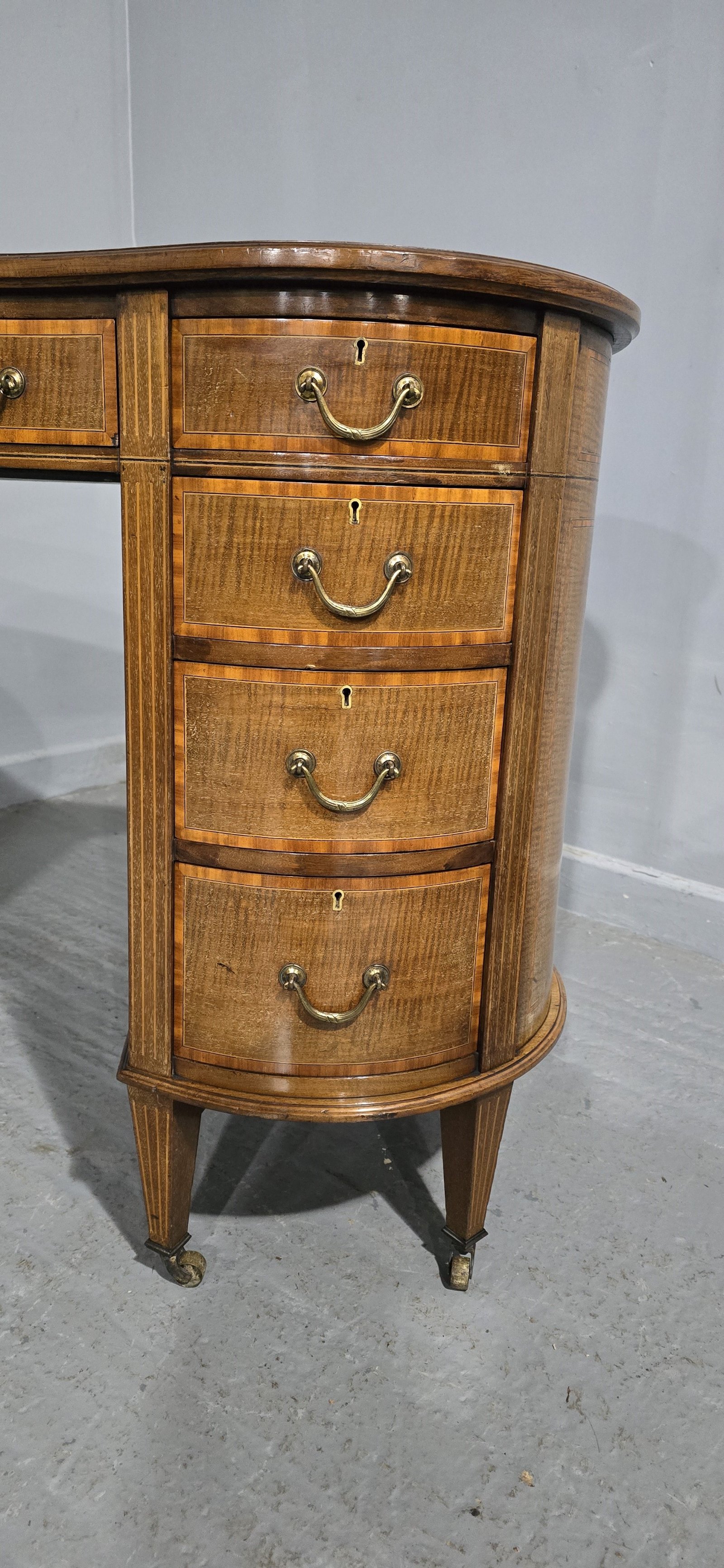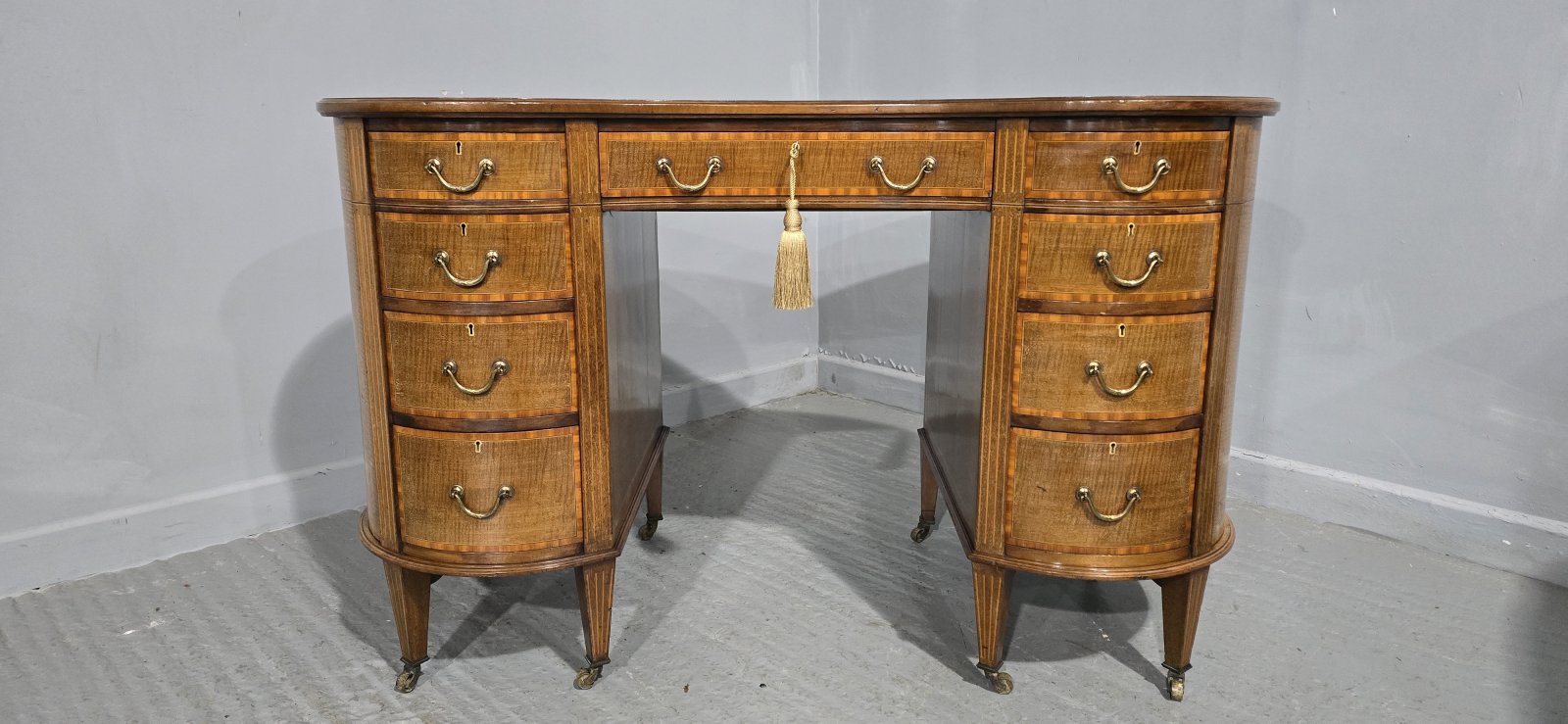 A very nice quality solid mahogany Edwardian serpentine desk with satinwood banding and green leather top, gilded swan neck handles, working locks, in overall excellent original condition.