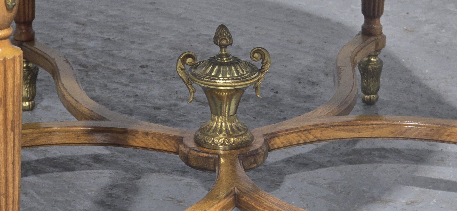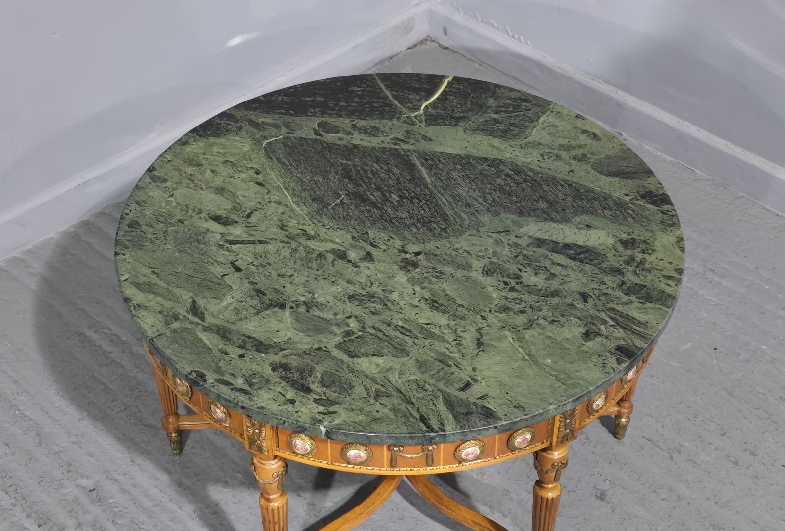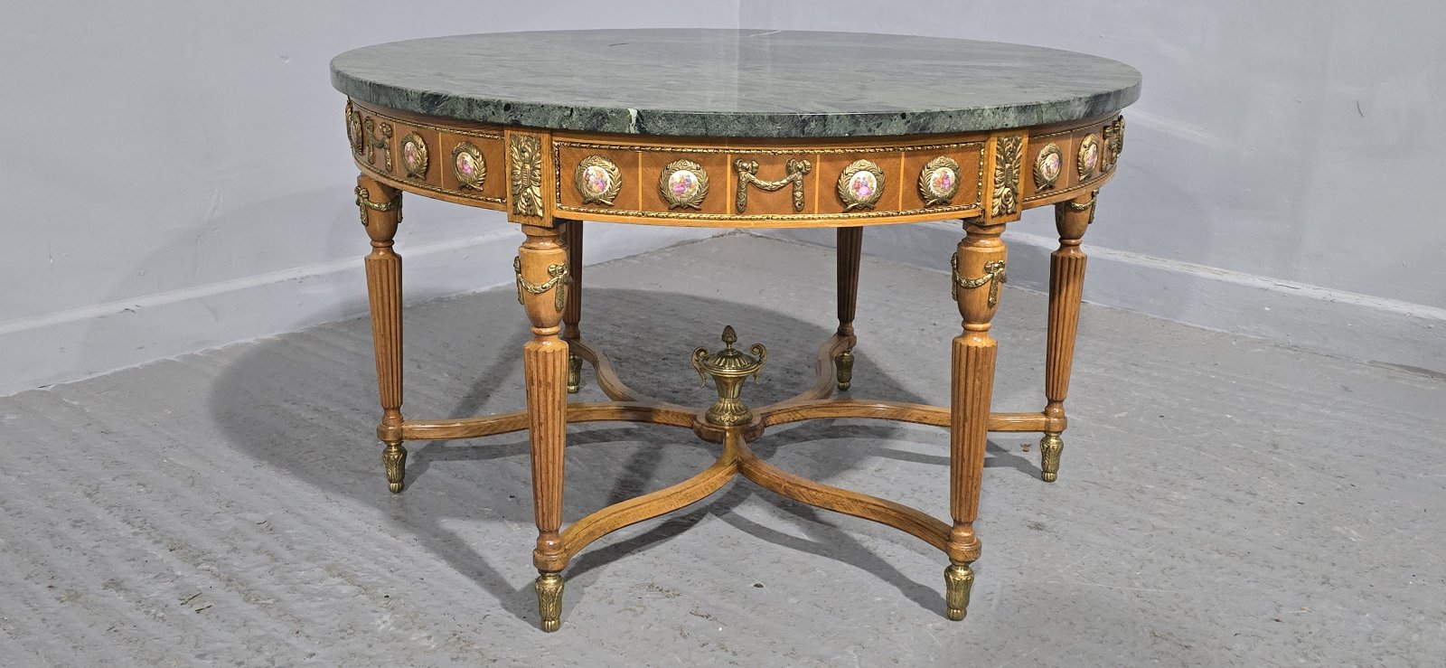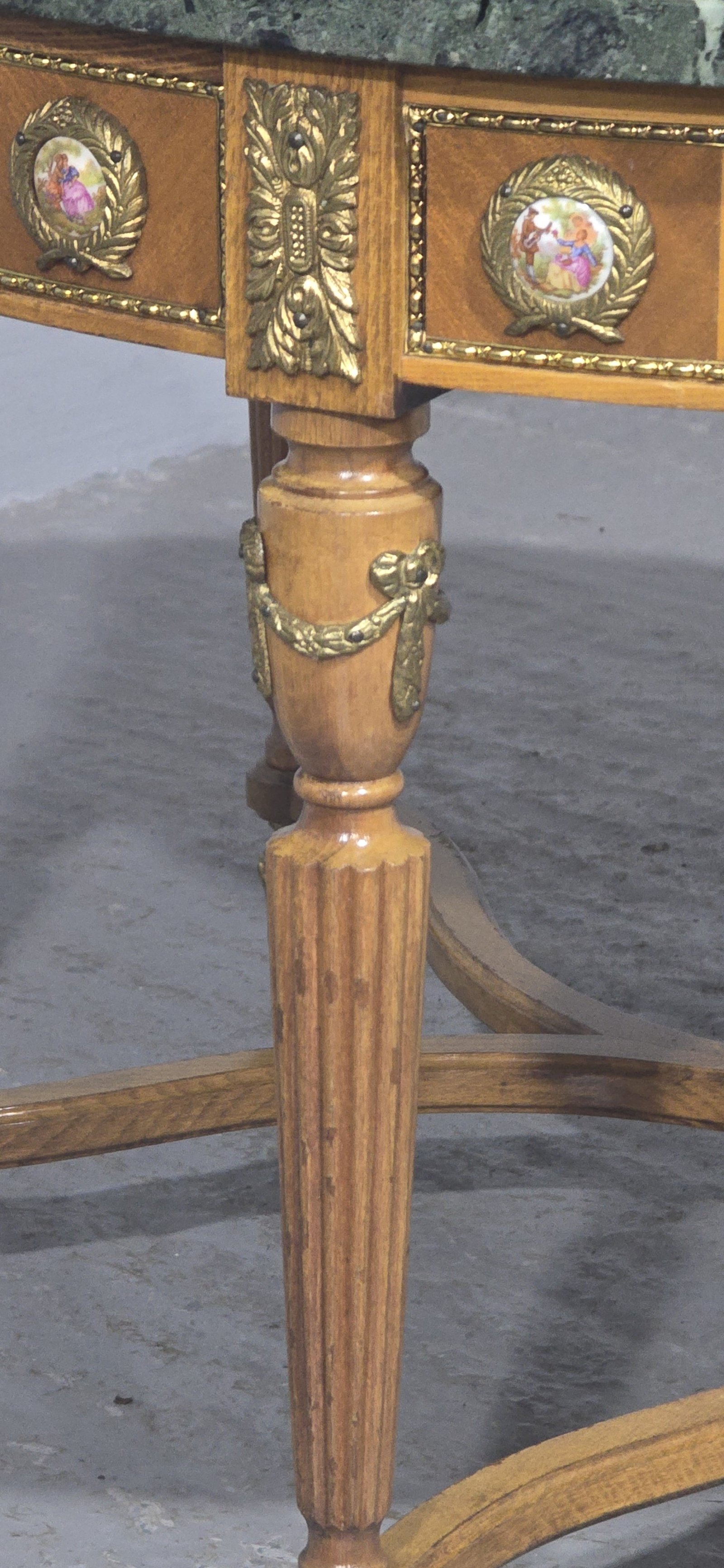 A very pretty six leg walnut coffee table with ormolu feet mounts and urn, 32 ormolu mounted porcelain plaques, and green varigated marble top, in excellent overall condition.