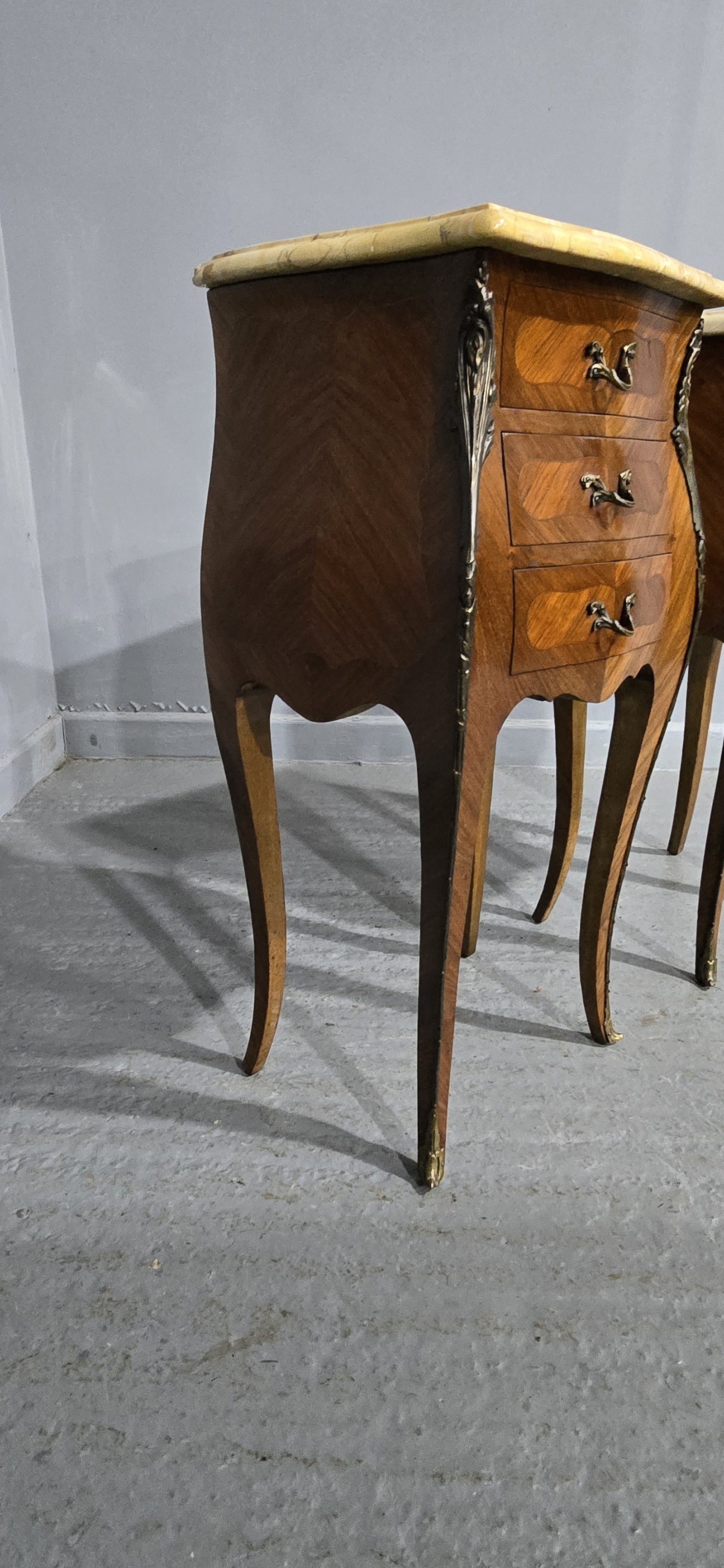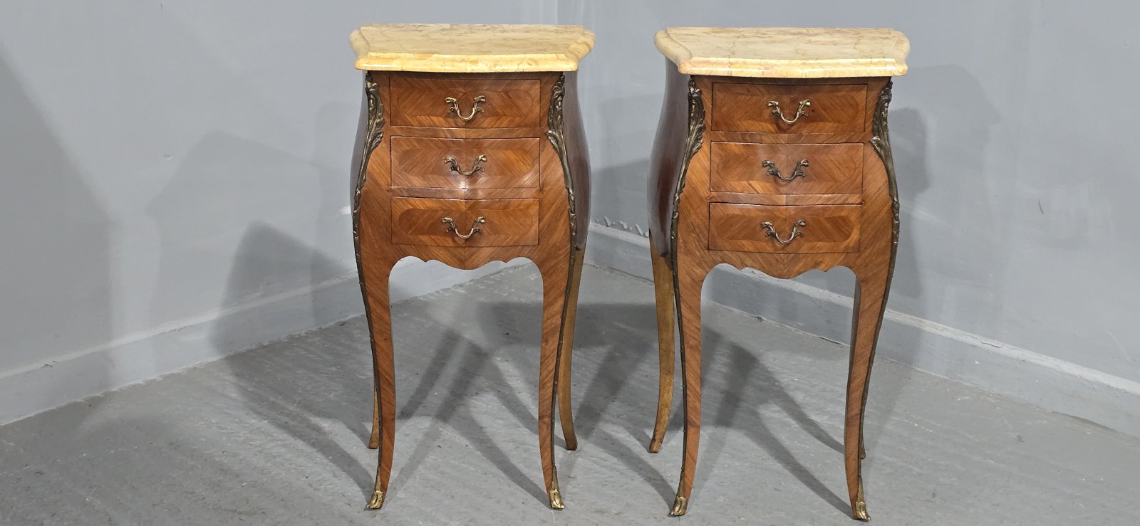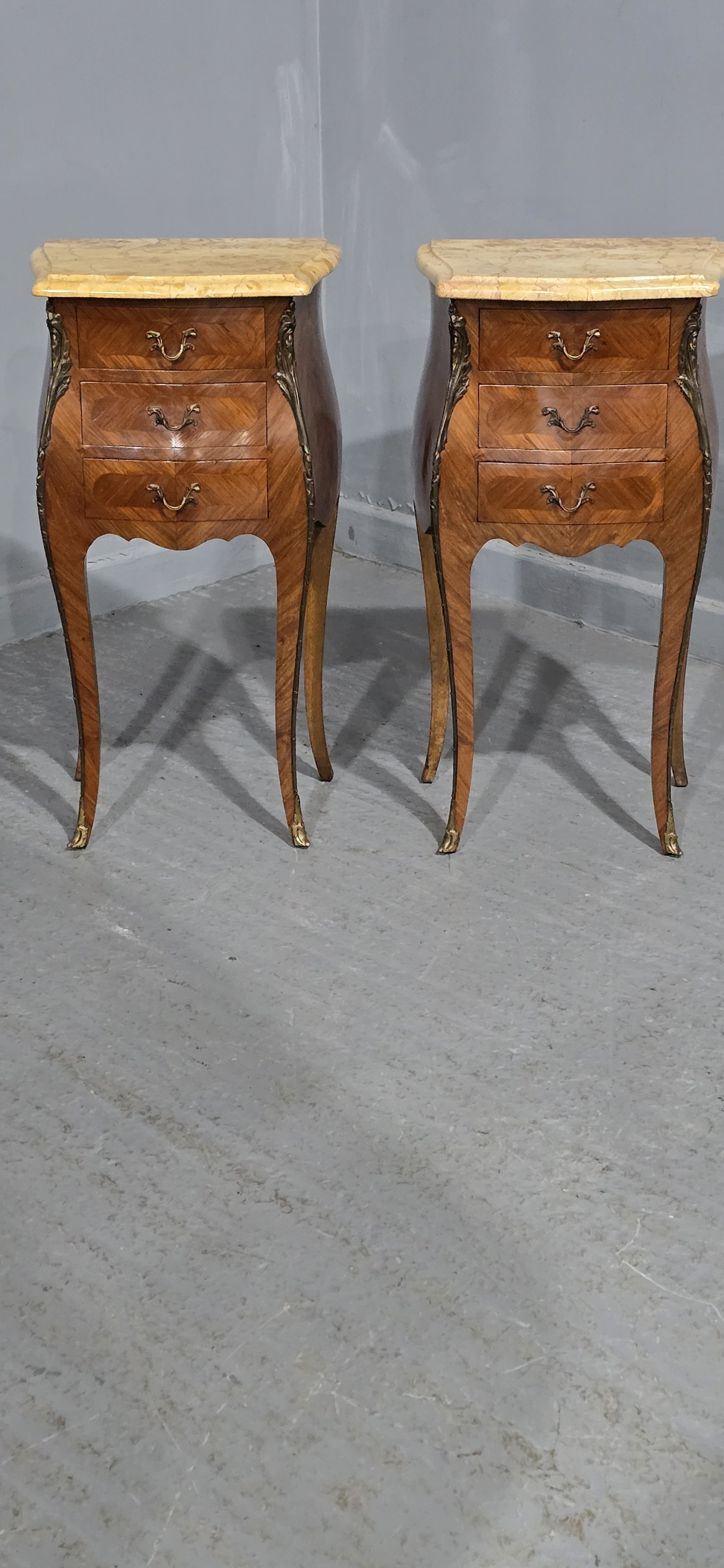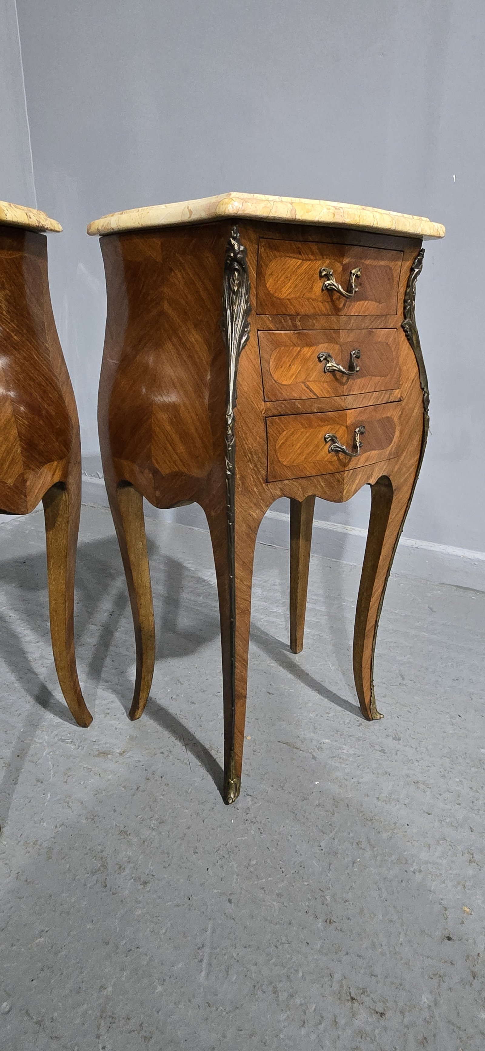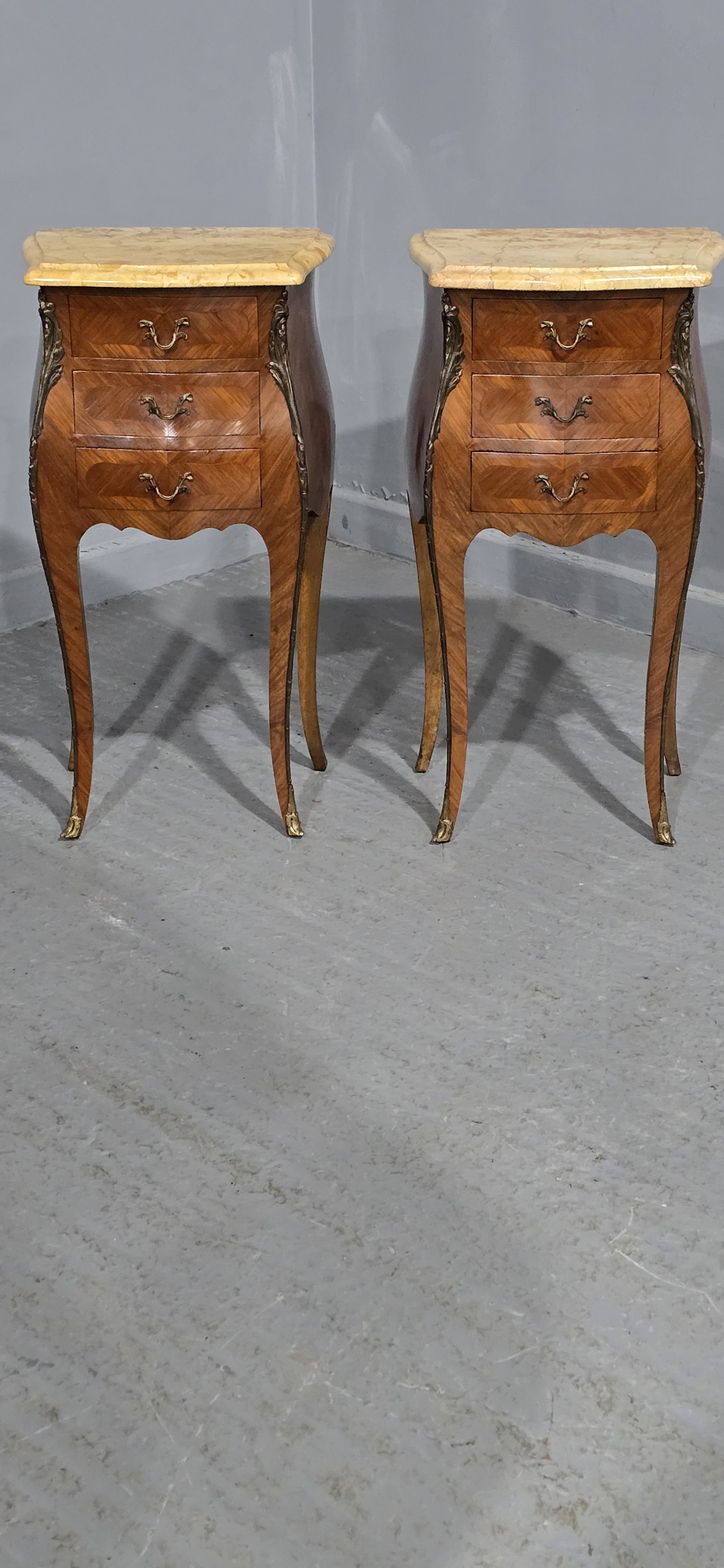 A very good pair of French three drawer bombe shaped tulipwood bedside lamp chests of drawers, with superb marbles, ormolu mounts, oak interiors, in excellent overall condition.
