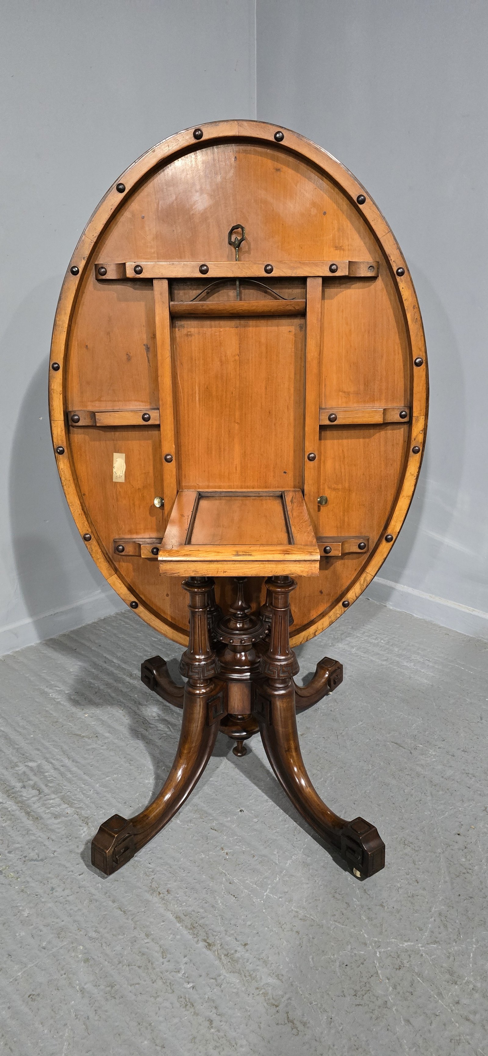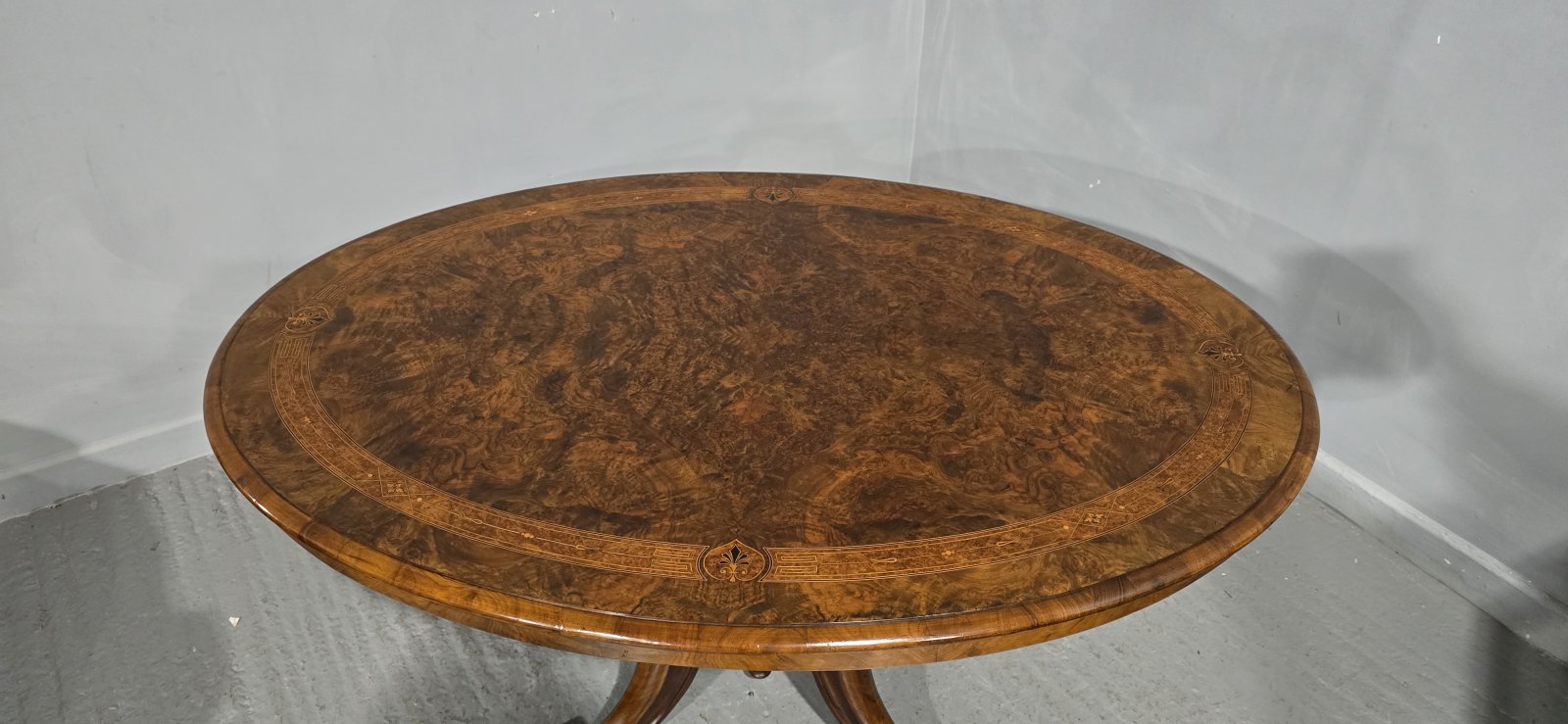 A Victorian burr walnut and marquetry inlaid oval breakfast table, tilting, quarter-veneered top, quatre-column support, sabre legs with origiginal castors, stamped BROs, seats six with ease, in very good original condition.