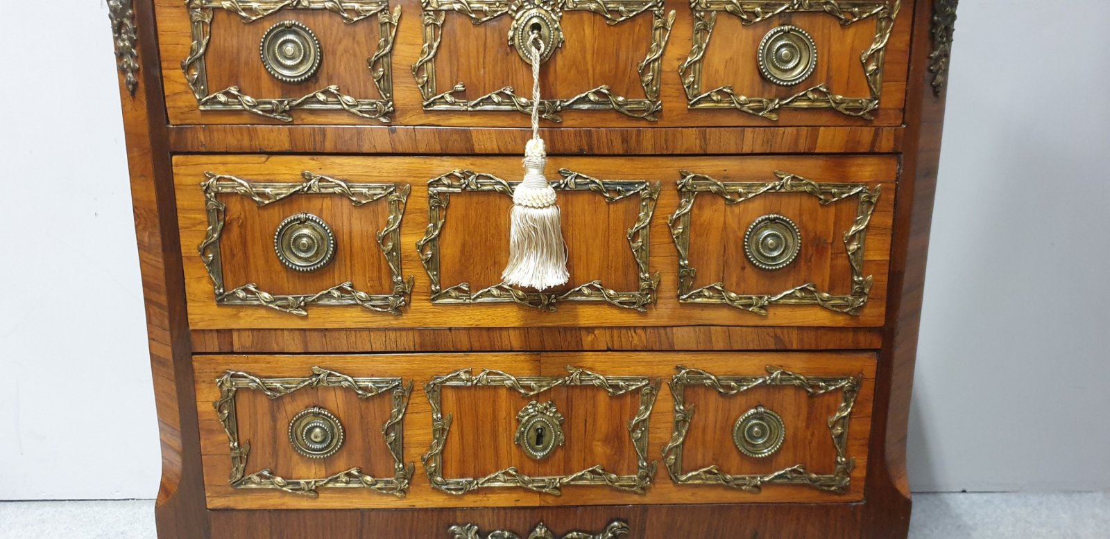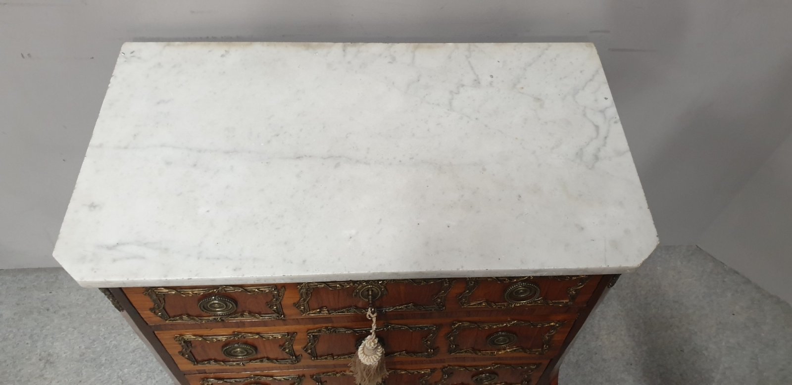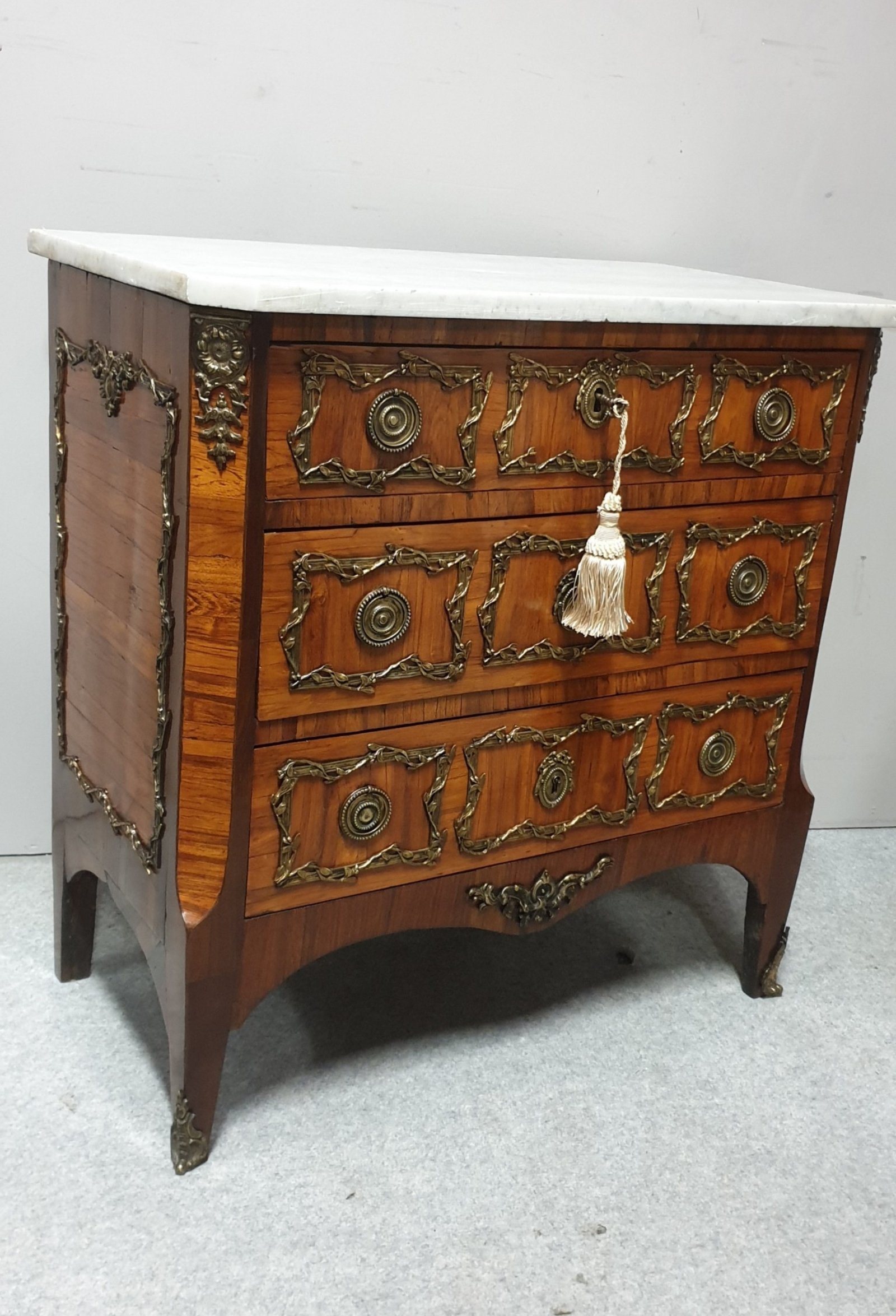 A super c18th French Kingwood commode chest of drawers of small proportions, oak lined throughout, top quality ormolu mounts excellent colour and condition. Carrera marble.