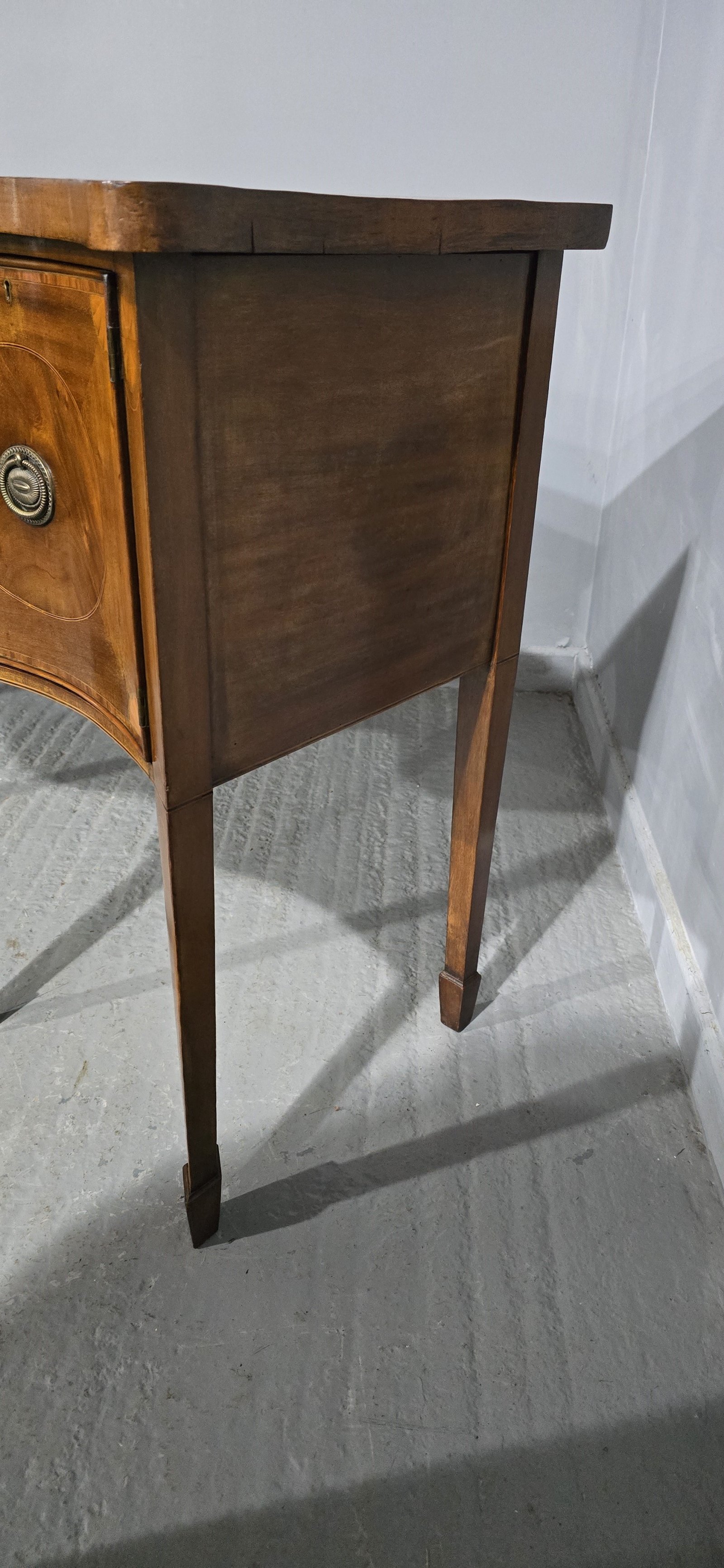 This Edwardian mahogany inlaid sideboard dates from approximately 1900. It features a bow front design and is crafted from mahogany, showcasing intricate inlay work. This piece is suitable for use as a sideboard, chiffonier, credenza, server, or buffet. It originates from England and reflects the design characteristics of the Edwardian period. Excellent quality Edwardian serpentine mahogany sideboard standing on tall tapered legs with spade feet, single drawer with drawers either side, in very good original condition with a wonderful colour.