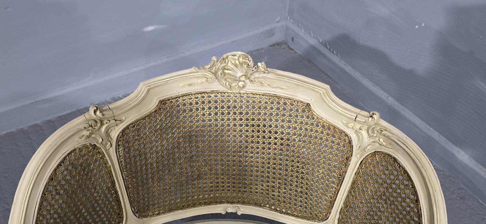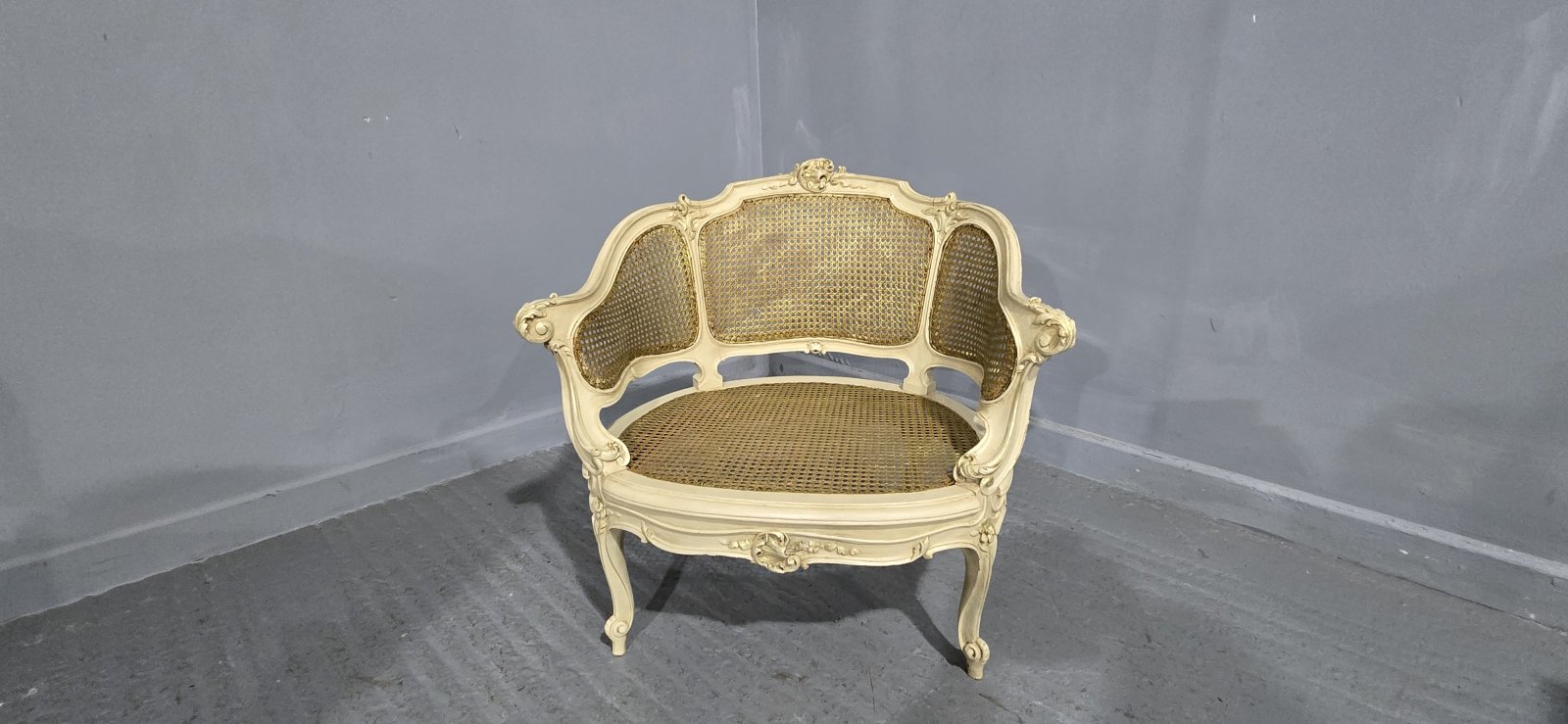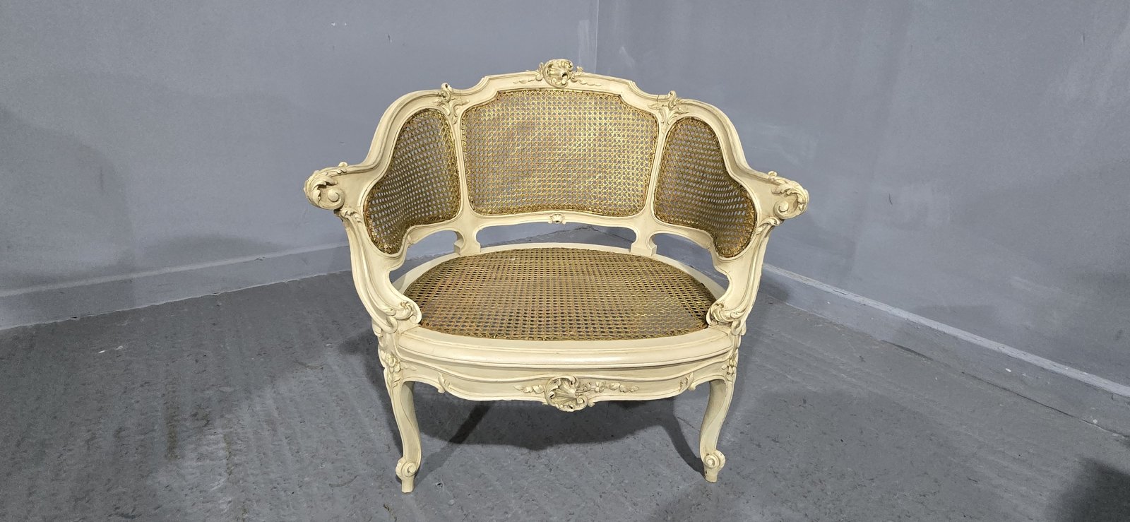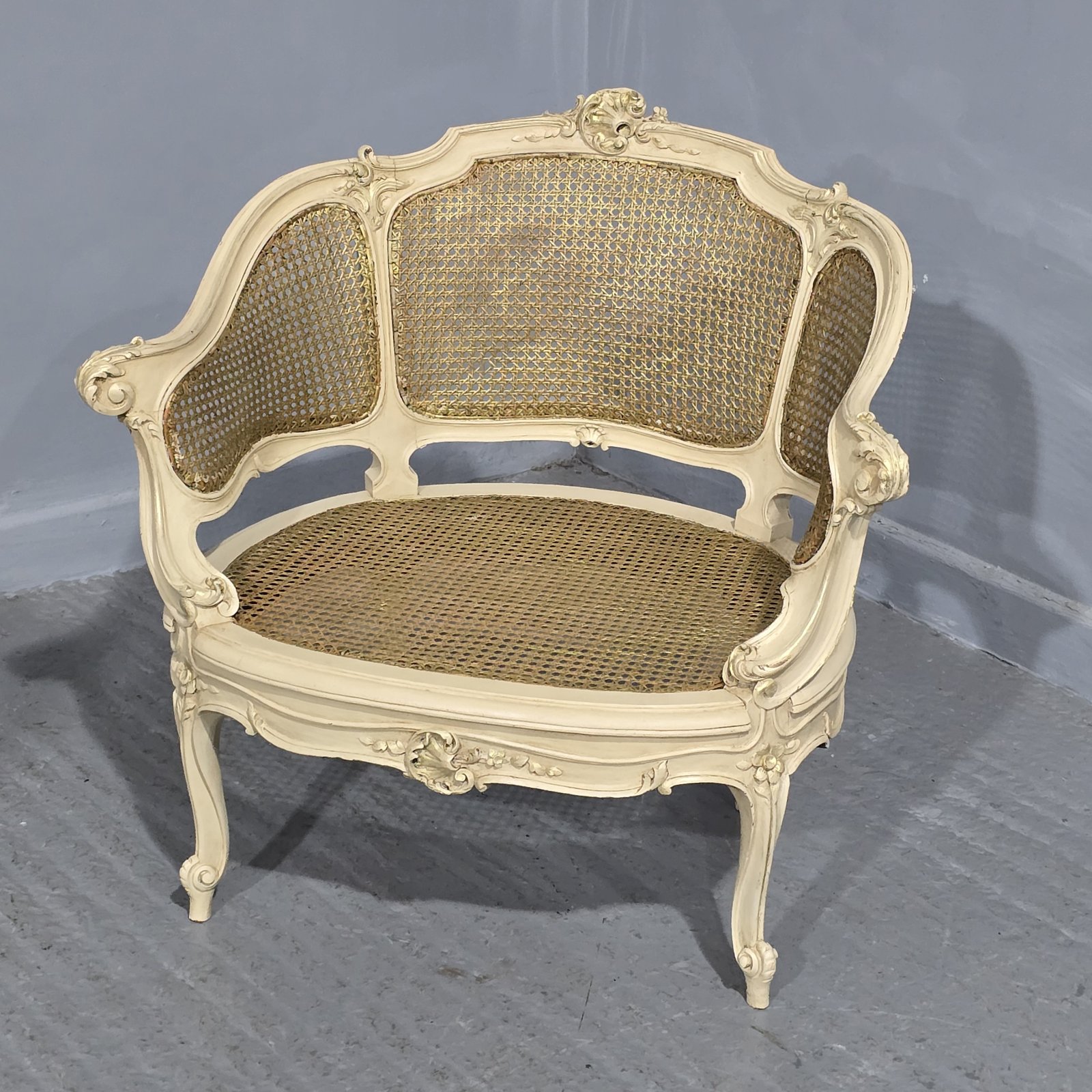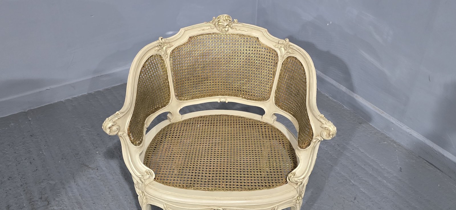 A very good French painted and parcel gilded bergere boudoir tub chair, original bergere in excellent overall condition.