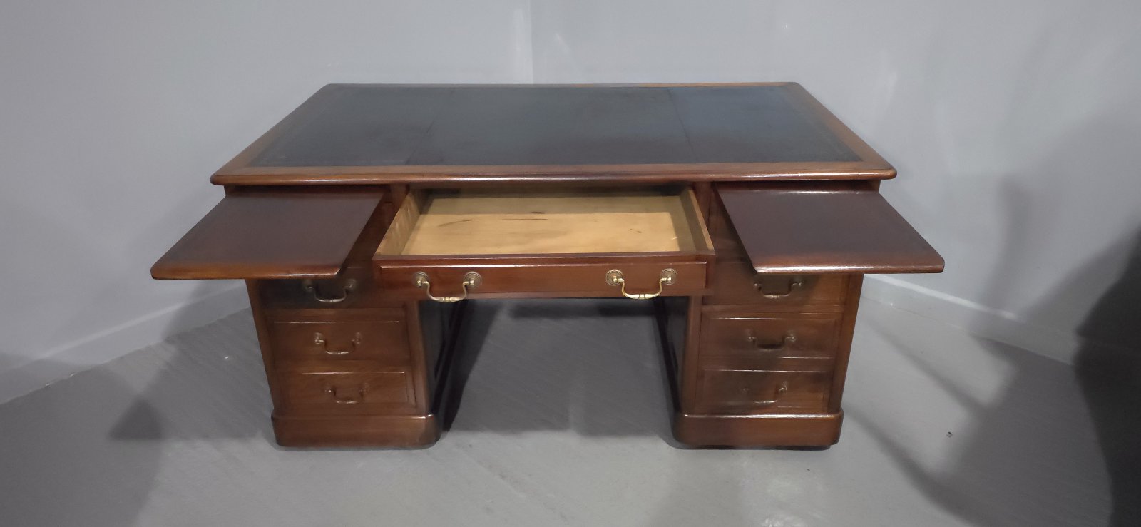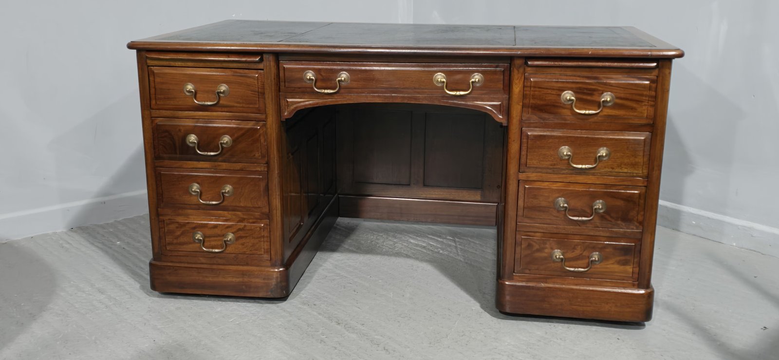 A fine quality solid mahogany double pedestal desk, with curtesy panel, nine drawers with brass swan necked handles, slides above side drawers, panelled sides, blue leather top, in excellent condition throughout.