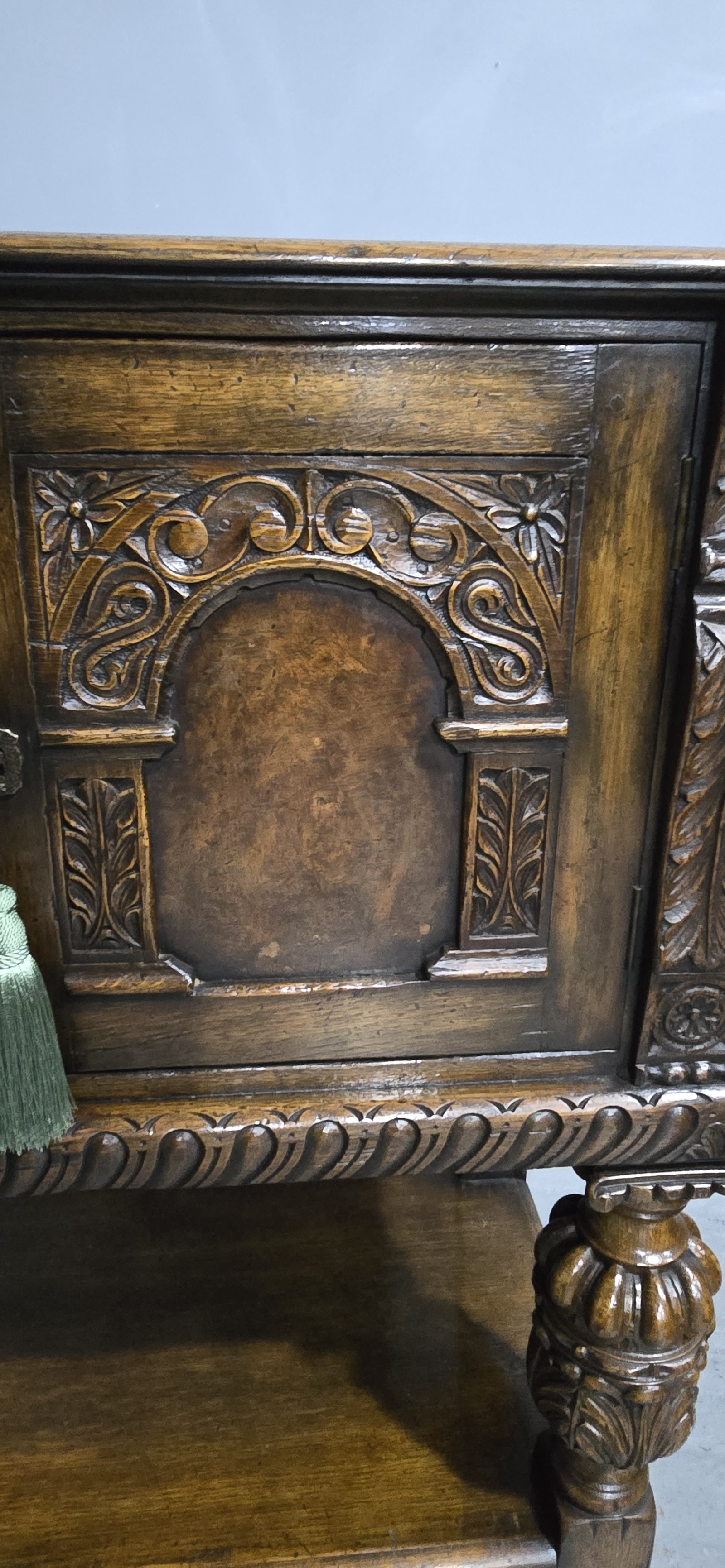Outstanding Elizabethan style oak and burr walnut sideboard, with bulbous legs, oak plank undertier. double doors with two central drawers, in excellent home ready condition.