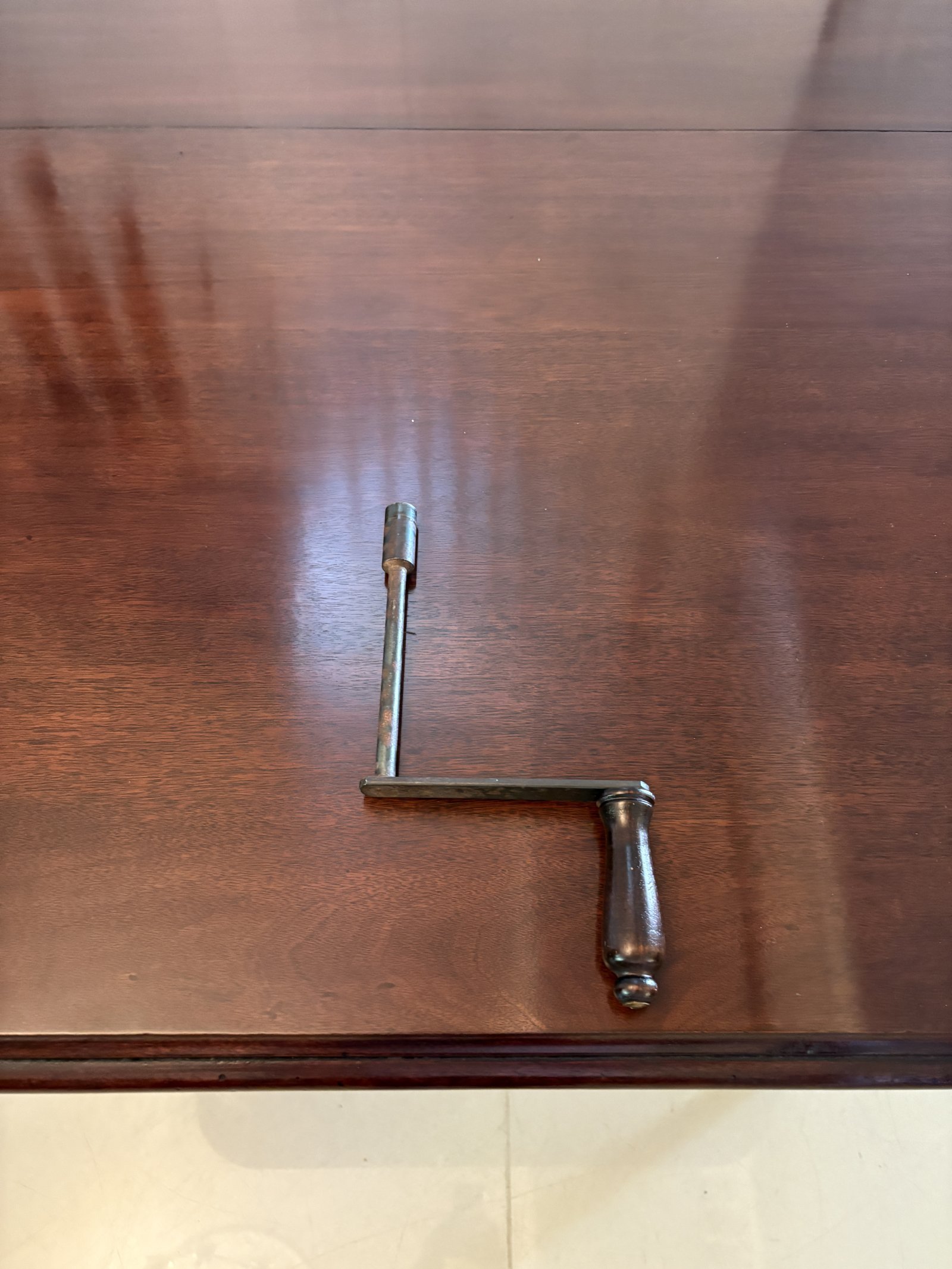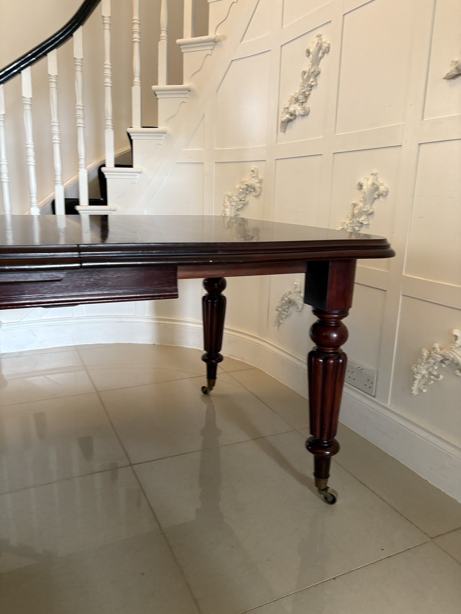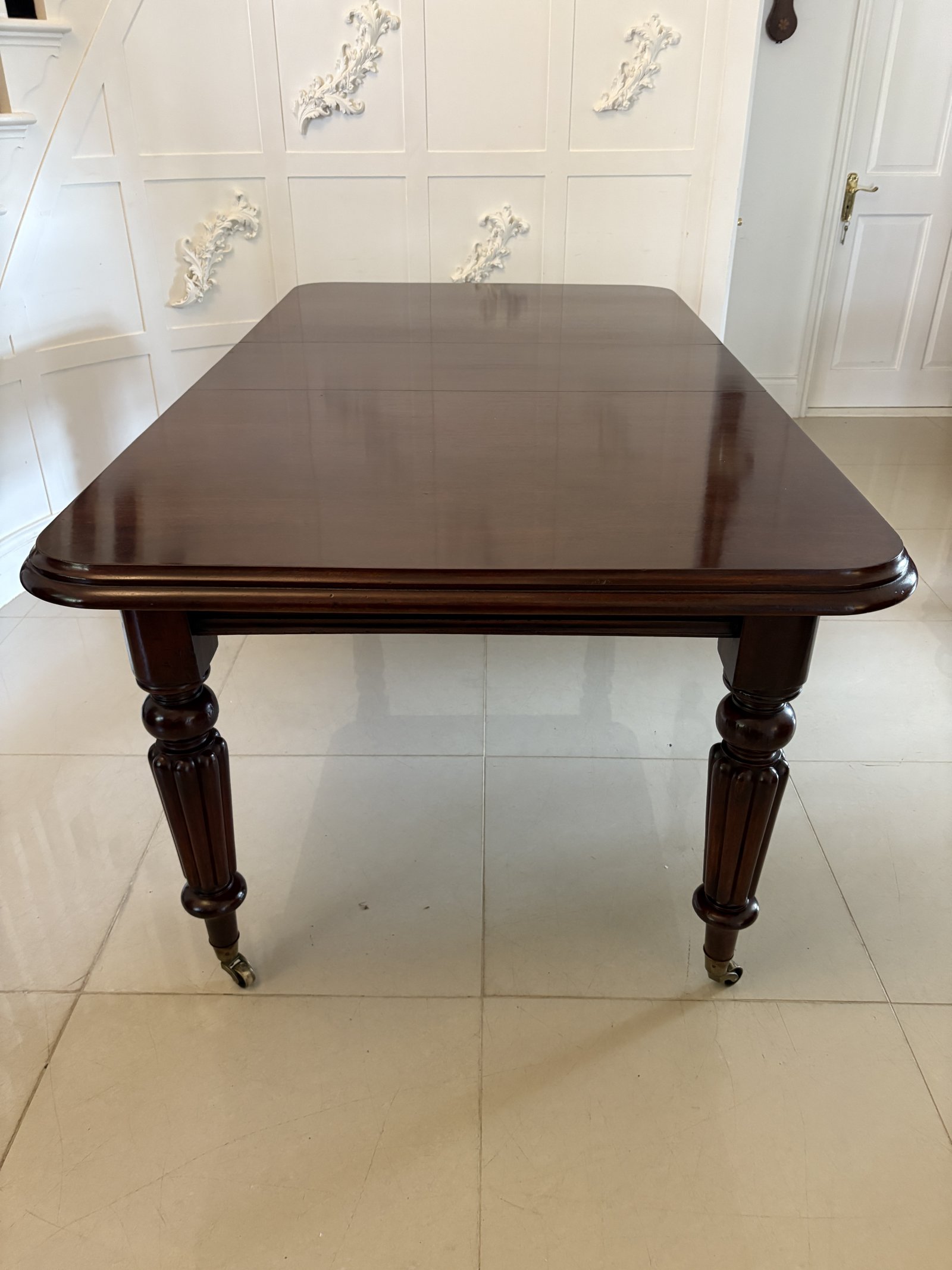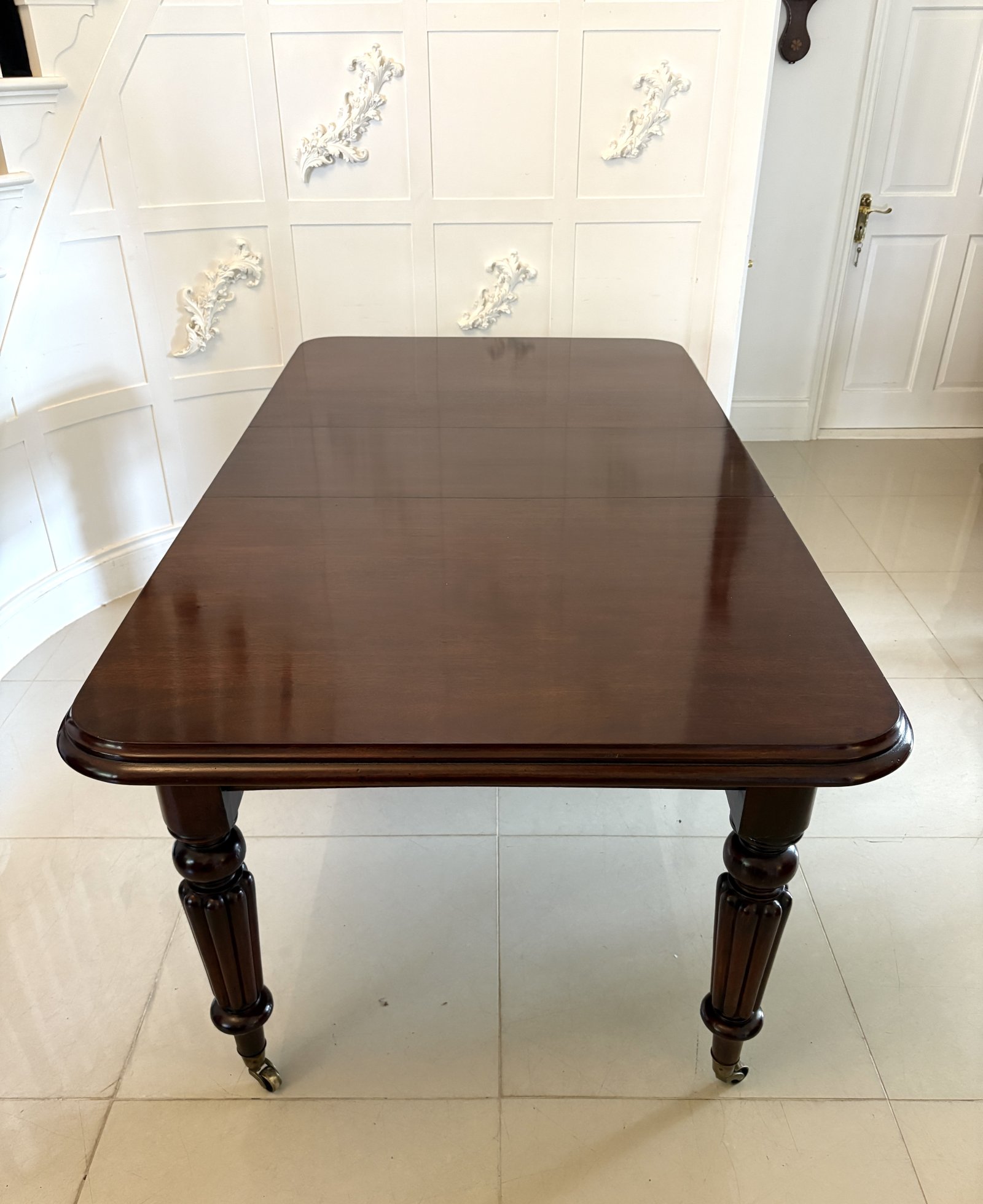Superb quality 8 seater antique Victorian figured mahogany extending dining table having an outstanding quality figured mahogany top with a moulded edge and one original extra leaf, original extending mechanism and winding handle standing on a tapering reeded leg with original cup castors.