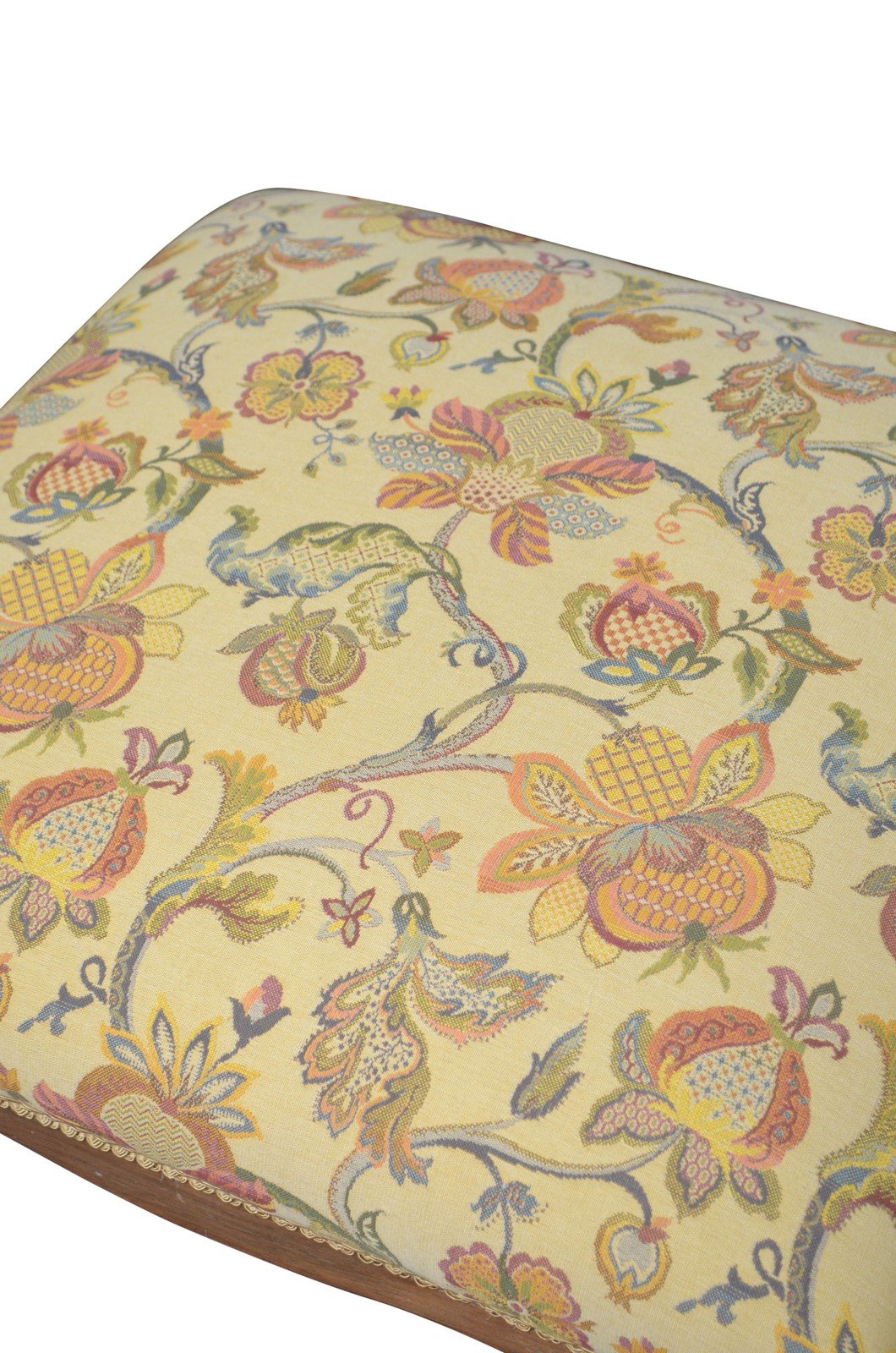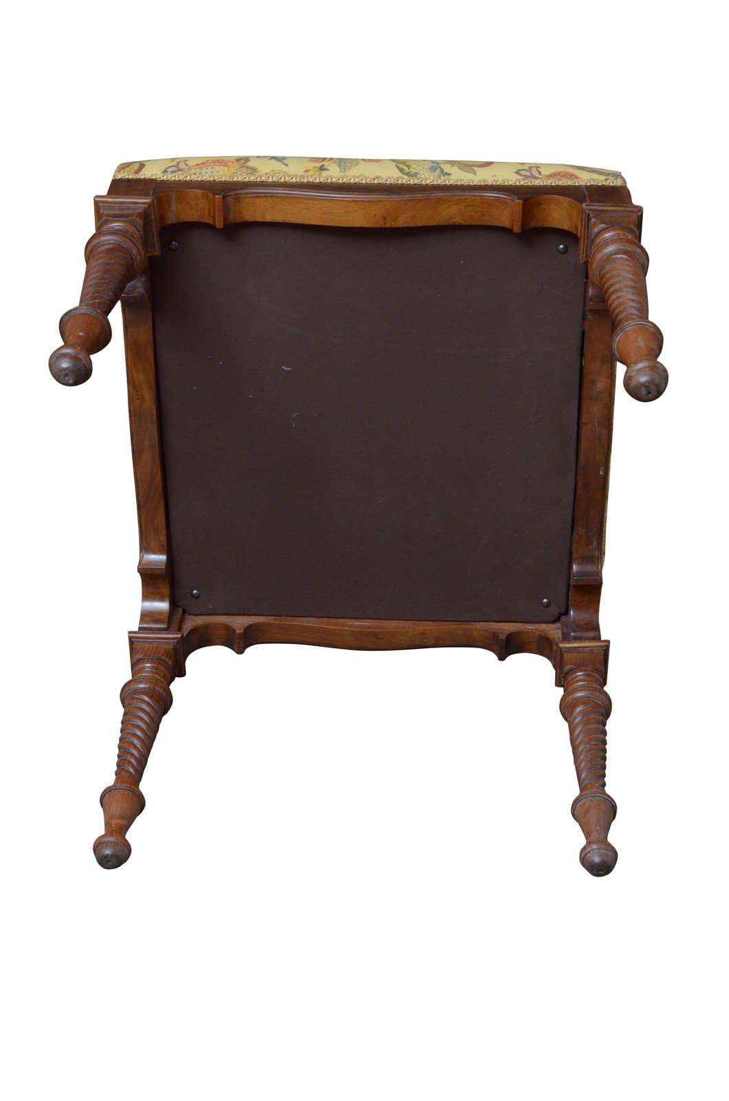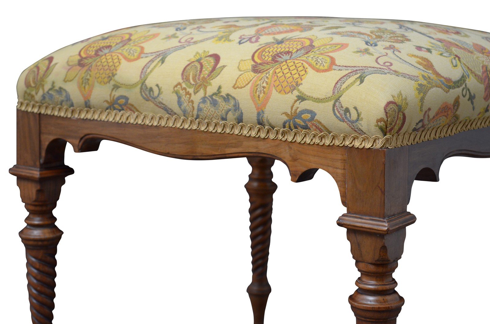 P0250 Superb quality Victorian dressing table stool in walnut, having newly reupholstered seat with attractive top cover above shaped and carved frieze and turned, tapered legs of twisted design terminating in ball feet. This antique stool retains its original finish which has been cleaned, revived and waxed, new upholstery and top cover. The stool is sturdy, wobble and woodworm free, no cracks or breaks, all in home ready condition. c1870