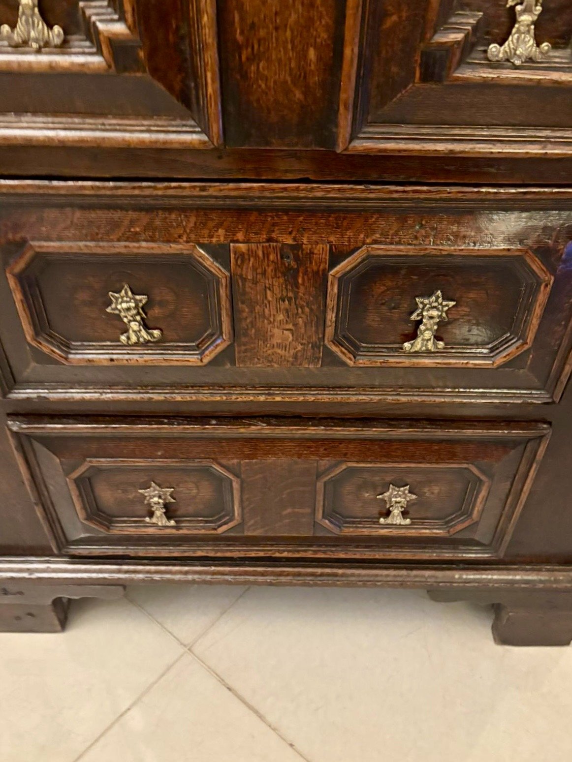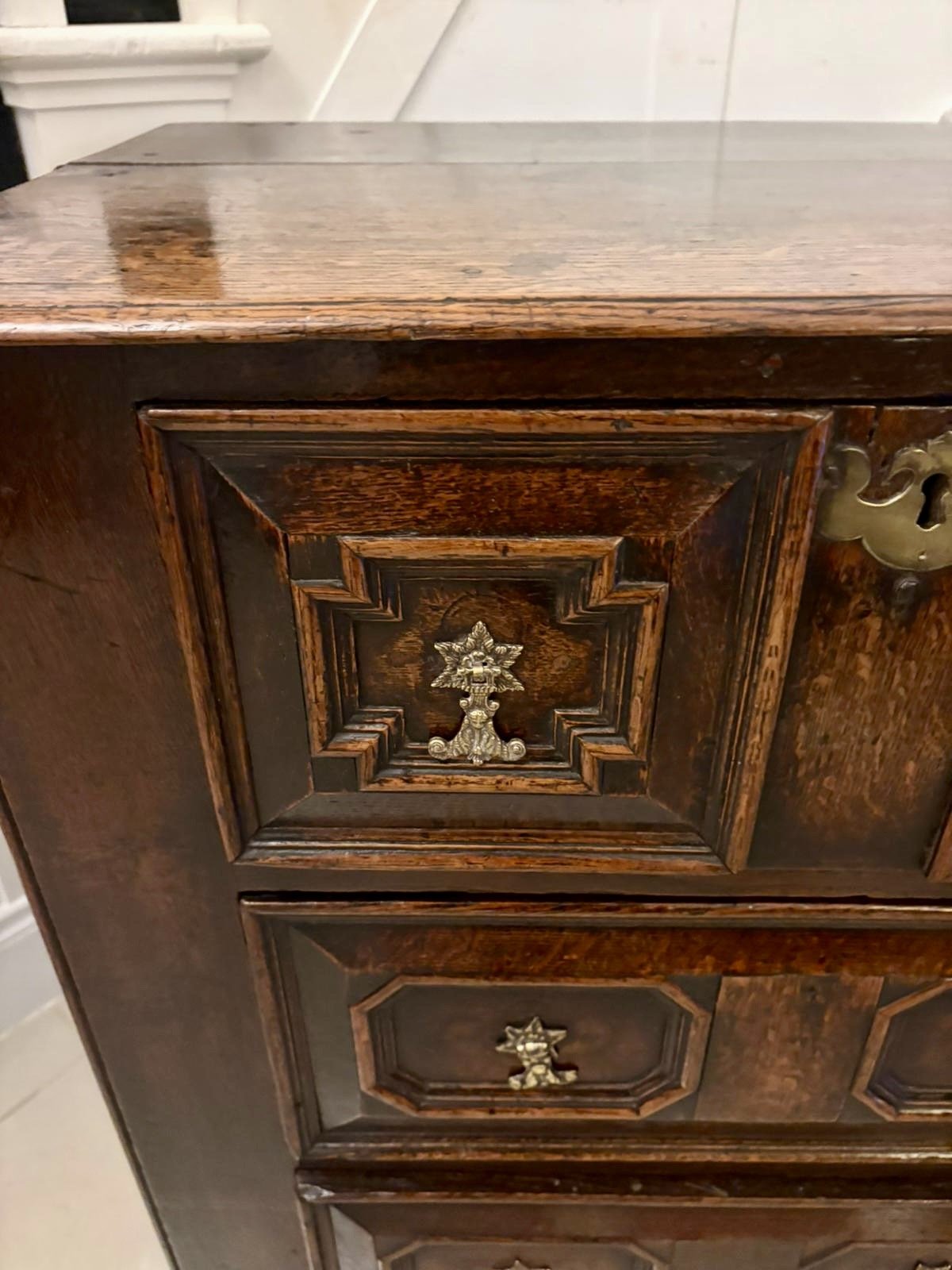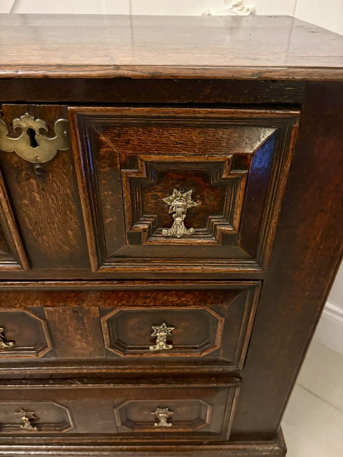 This piece captures the bold architectural form typical of the late 17th century with its strong lines, geometric panels, and richly coloured timber. The fabulous dark oak colour and surface texture enhance its timeless appeal and authenticity.