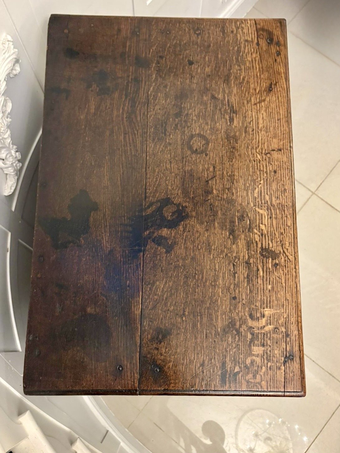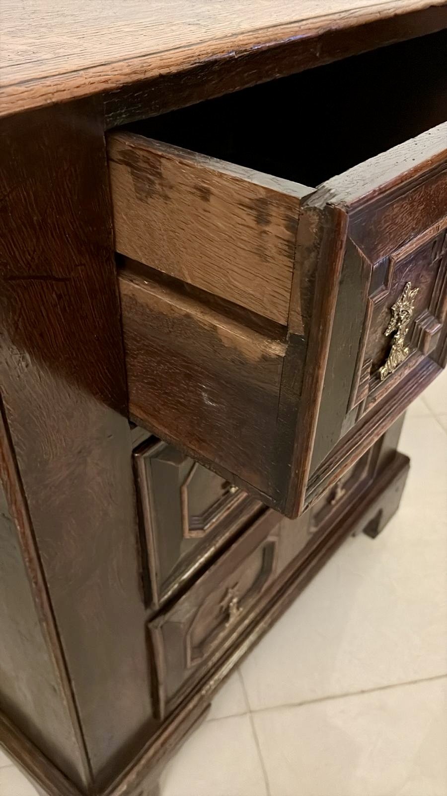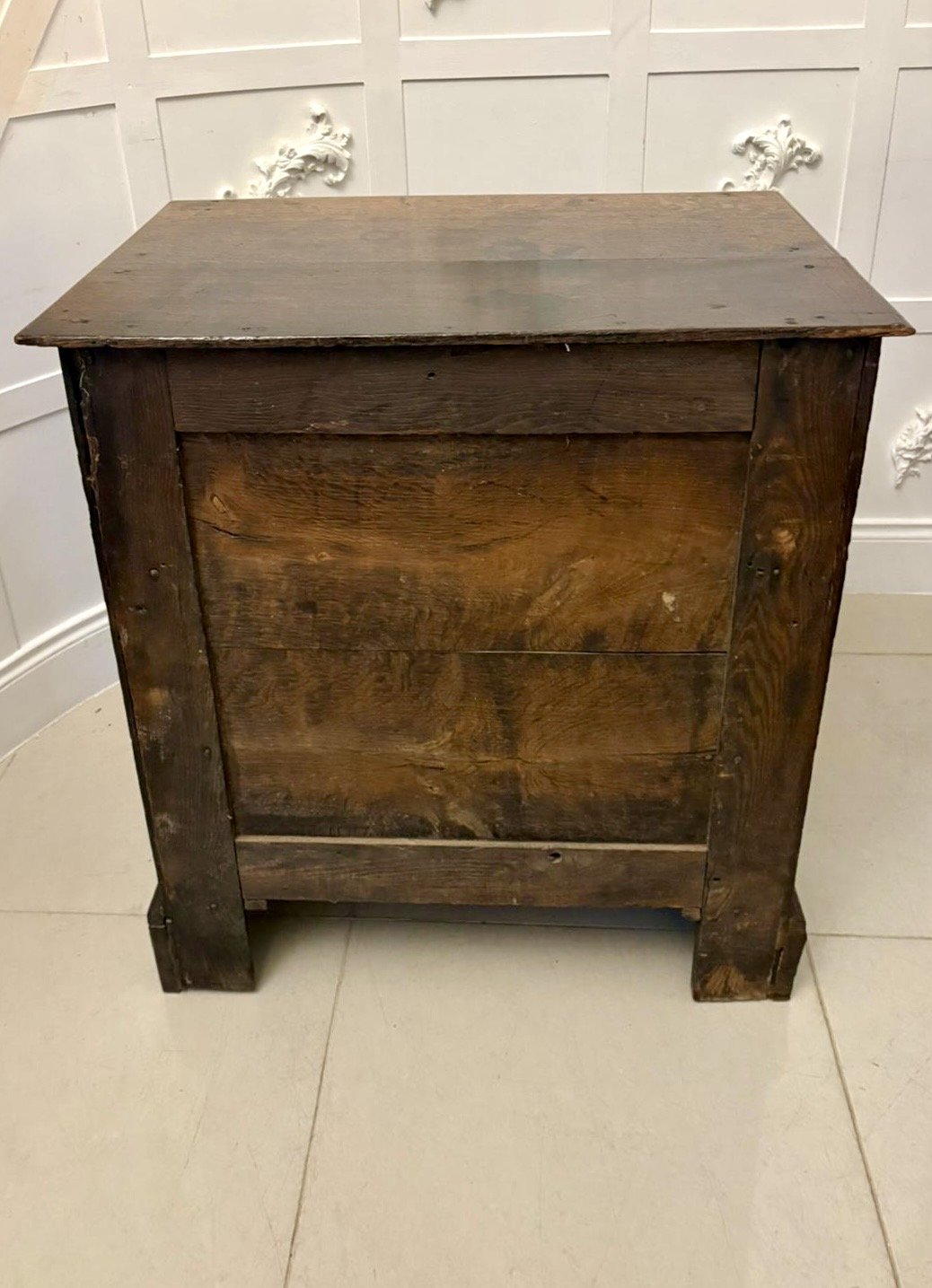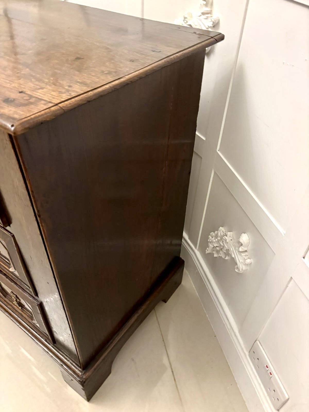The drawers are oak-lined with early dovetail joinery and run smoothly within the carcass which stands on solid bracket feet. The top displays an exceptional patina, showing the deep, lustrous tones and natural wear that only centuries of use can produce.