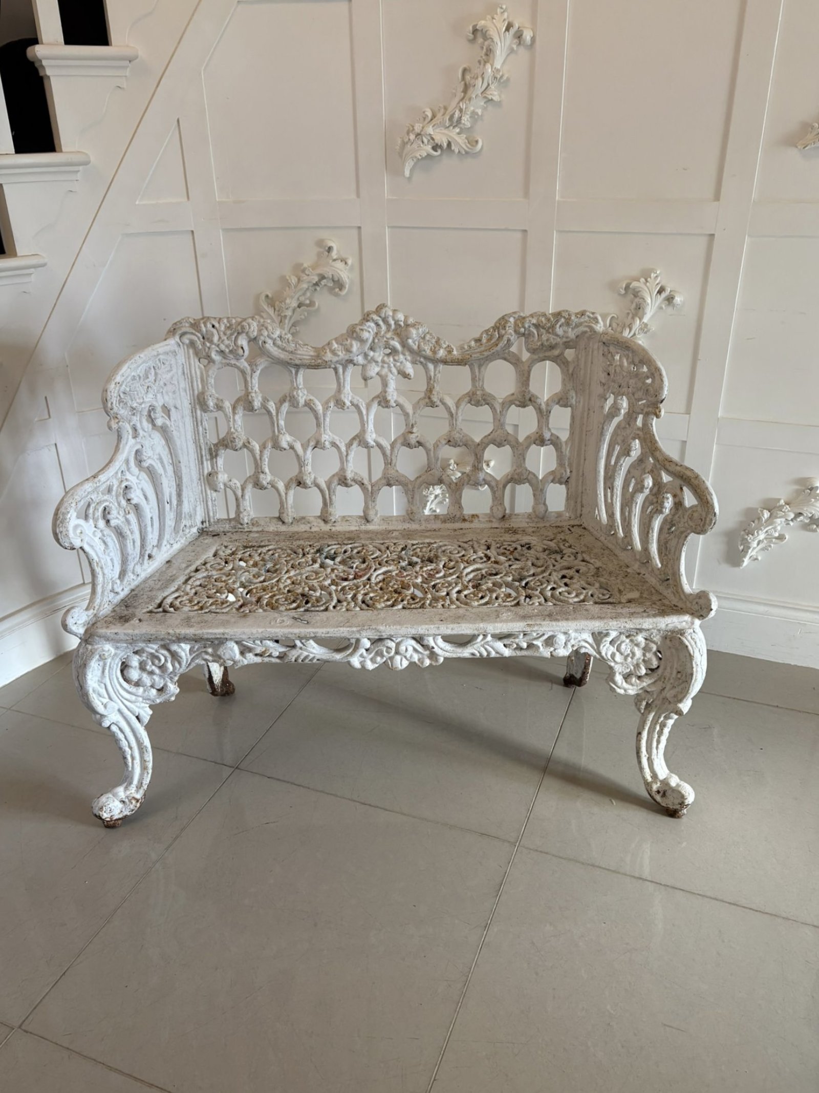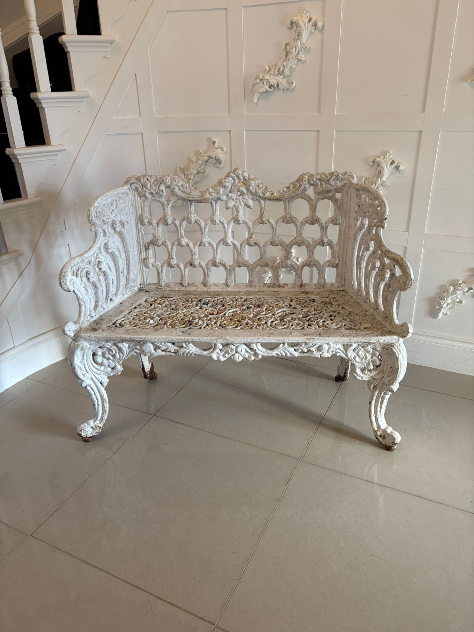 Superb quality antique early Victorian ornate cast iron garden seat having a cast iron shaped back and arms with ornate pierced decoration, fantastic ornate seat with pierced scrolled decoration standing on shaped cabriole legs