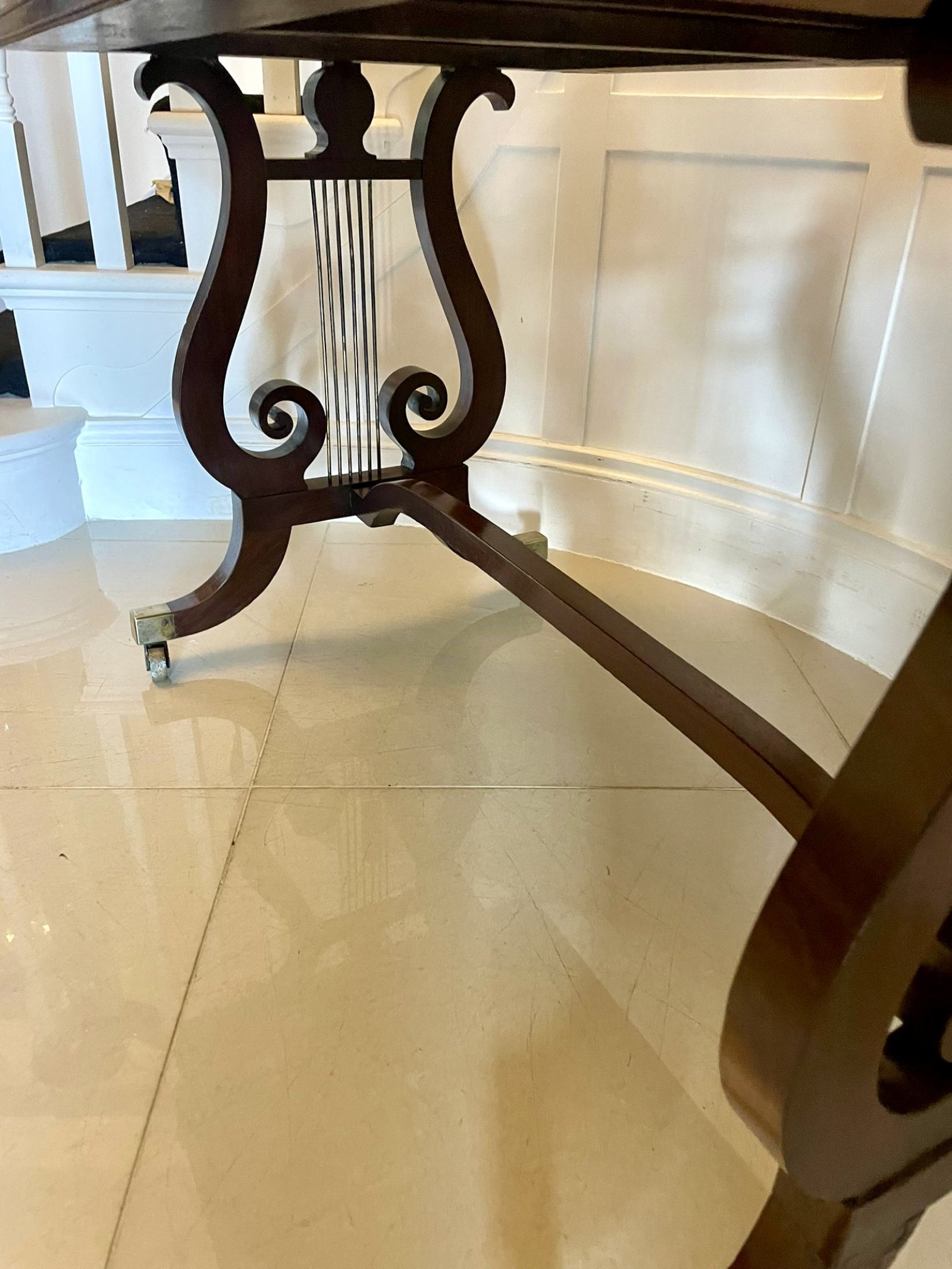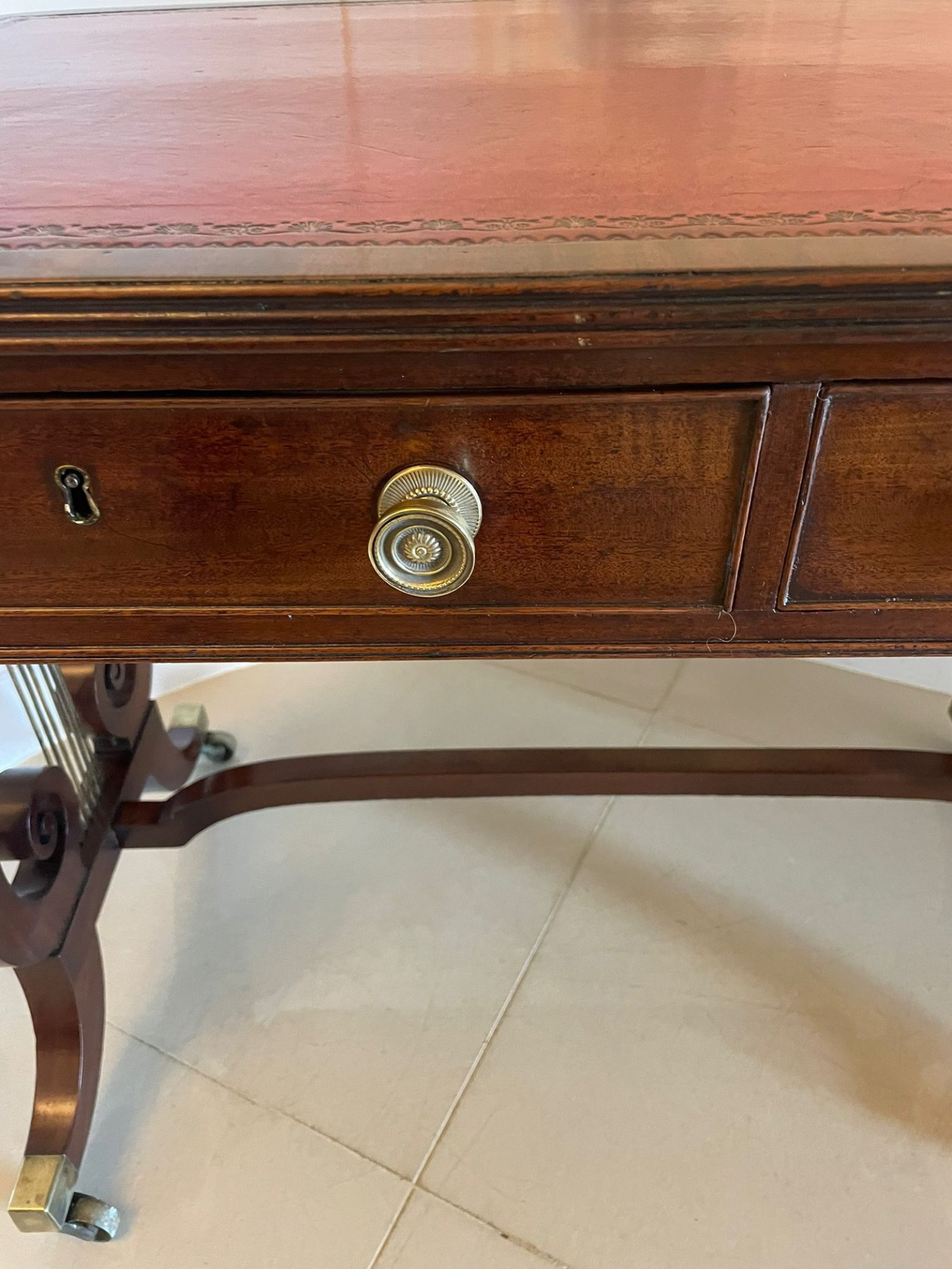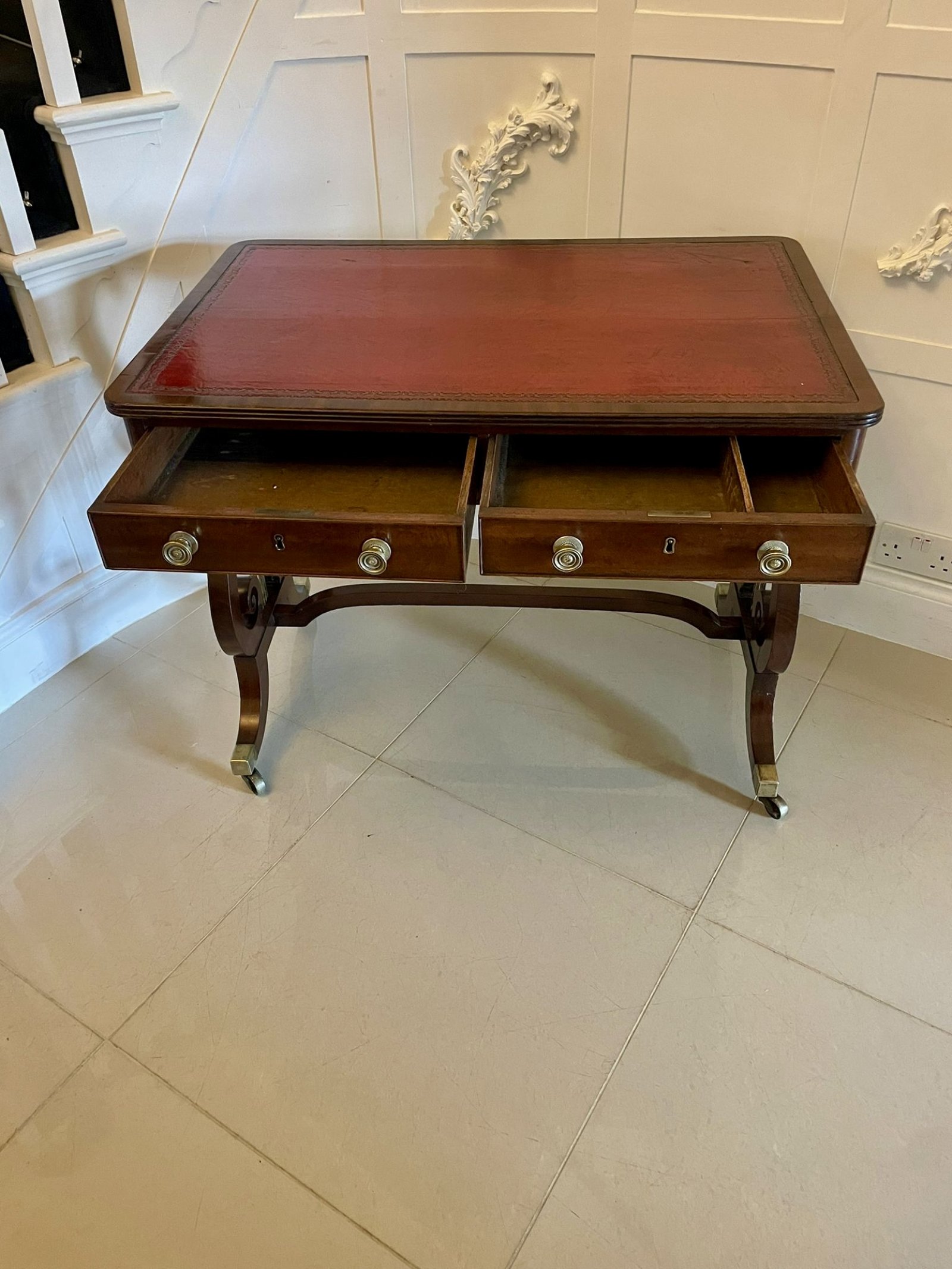 Superb quality antique regency mahogany free standing writing desk having a superb quality mahogany top with a reeded edge and a red leather writing surface above two drawers and two dummy drawers with a cockbeeded edge and original brass knobs supported by fantastic lyre end shaped supports with brass columns standing on shaped sabre legs with original brass cup castors untied by a mahogany stretcher