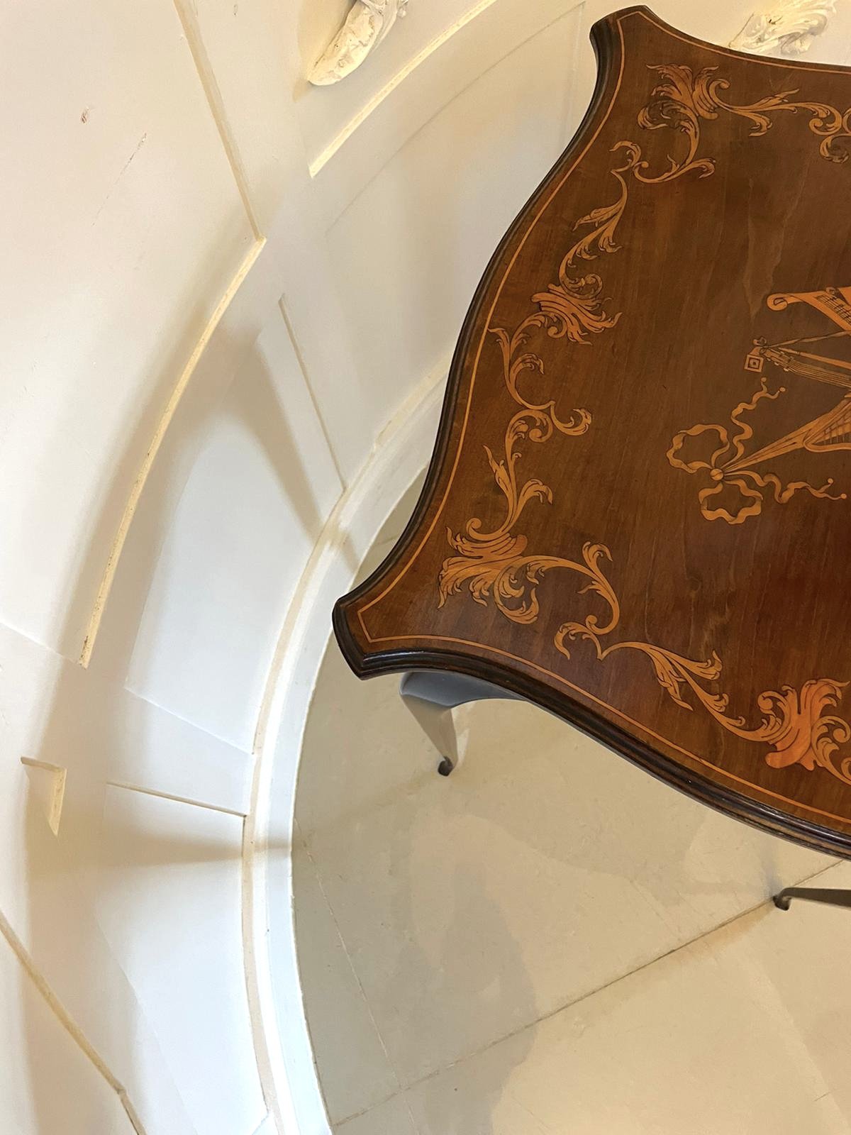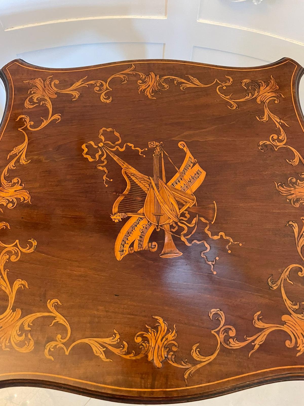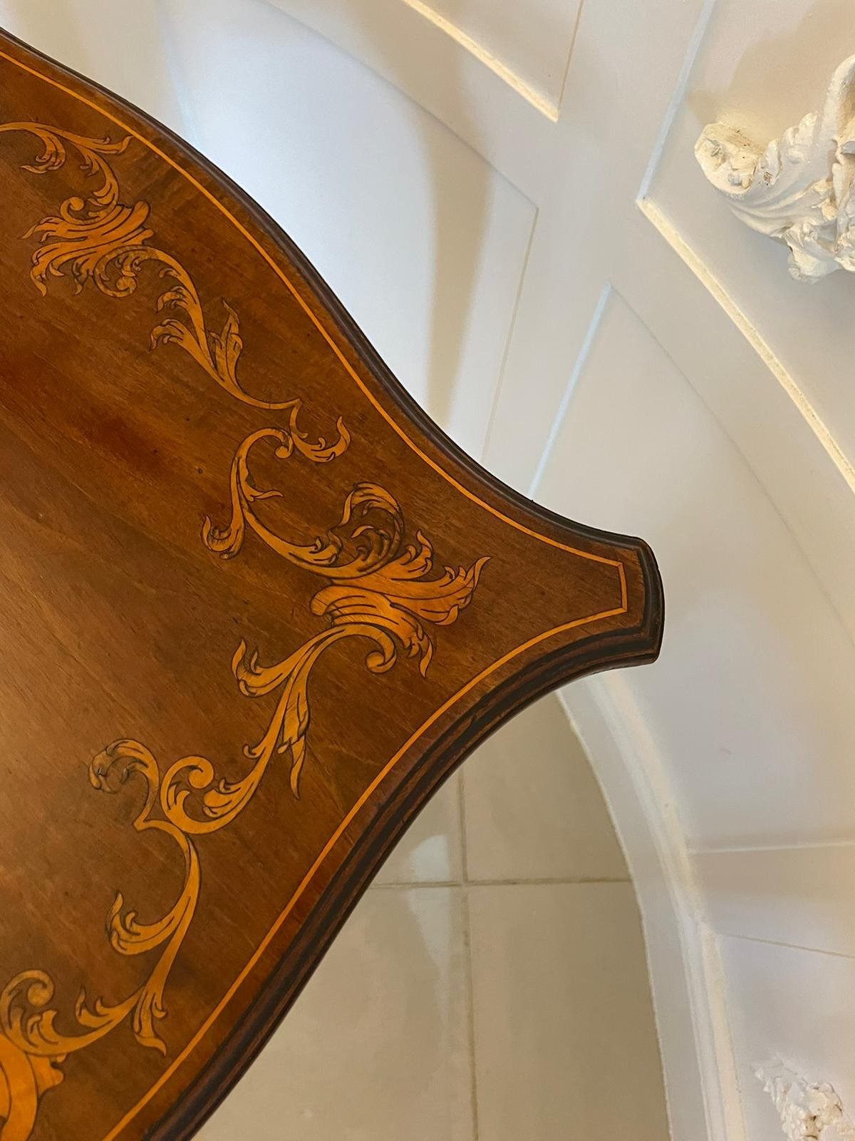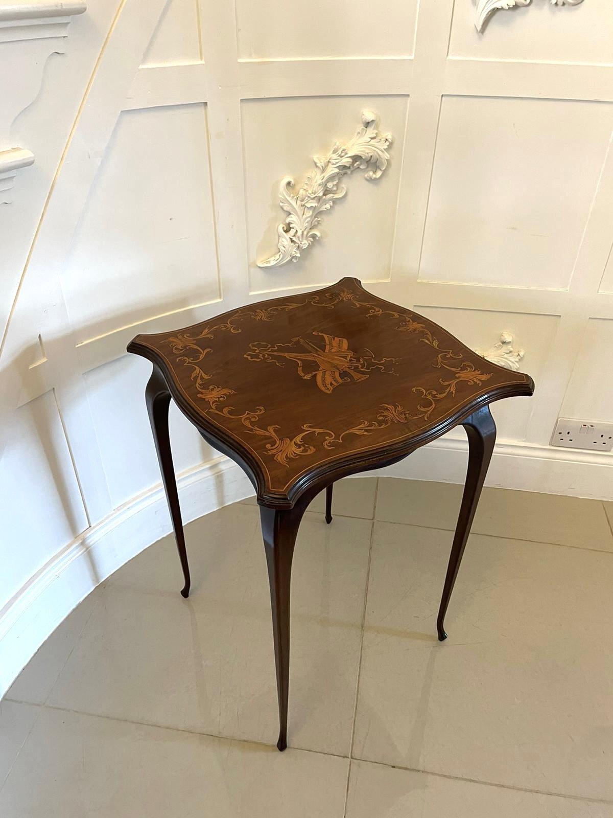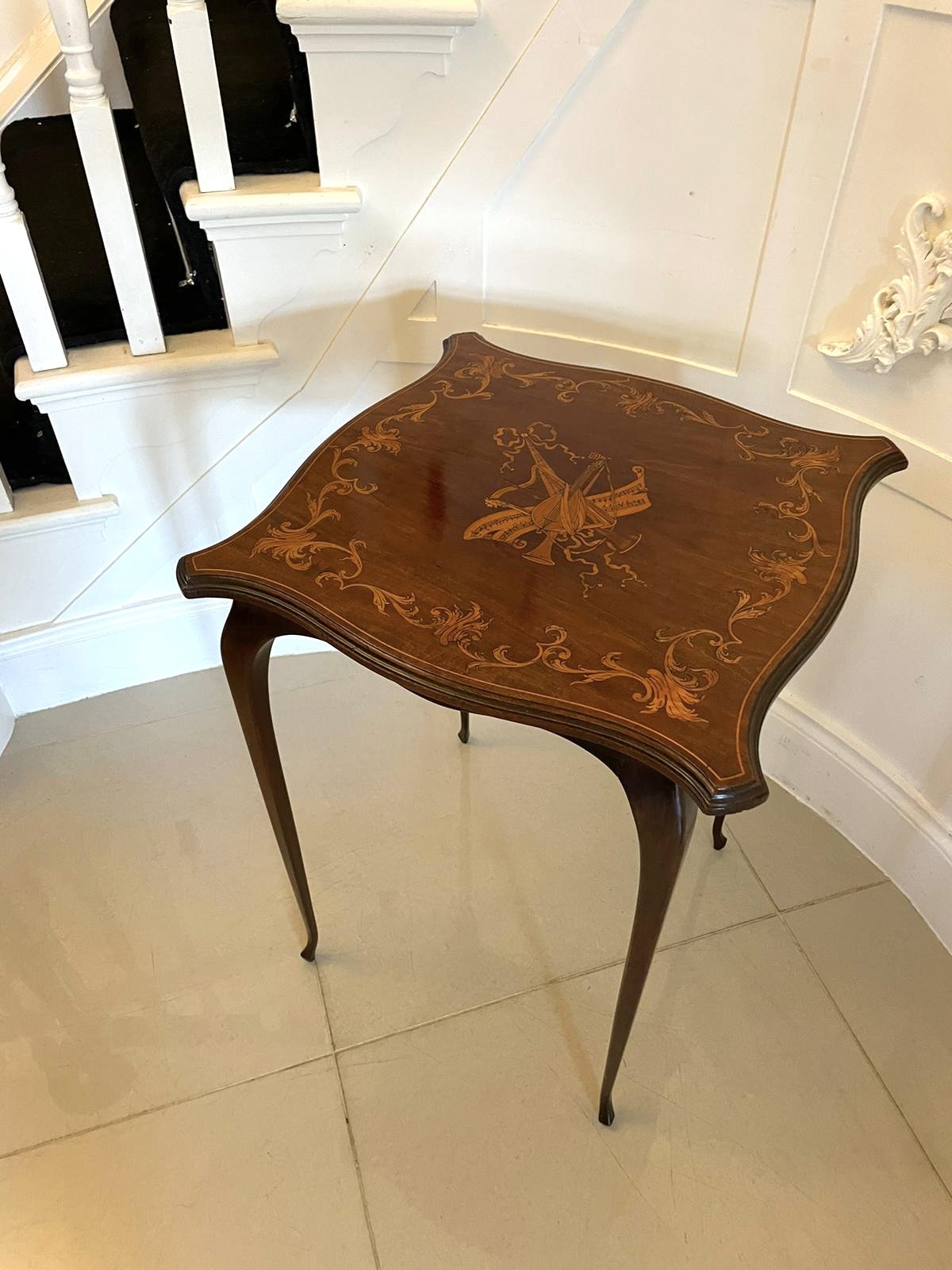 Superb quality antique Victorian marquetry inlaid mahogany lamp table having a superb quality serpentine shaped marquetry inlaid mahogany top with a moulded edge standing on elegant shaped cabriole legs