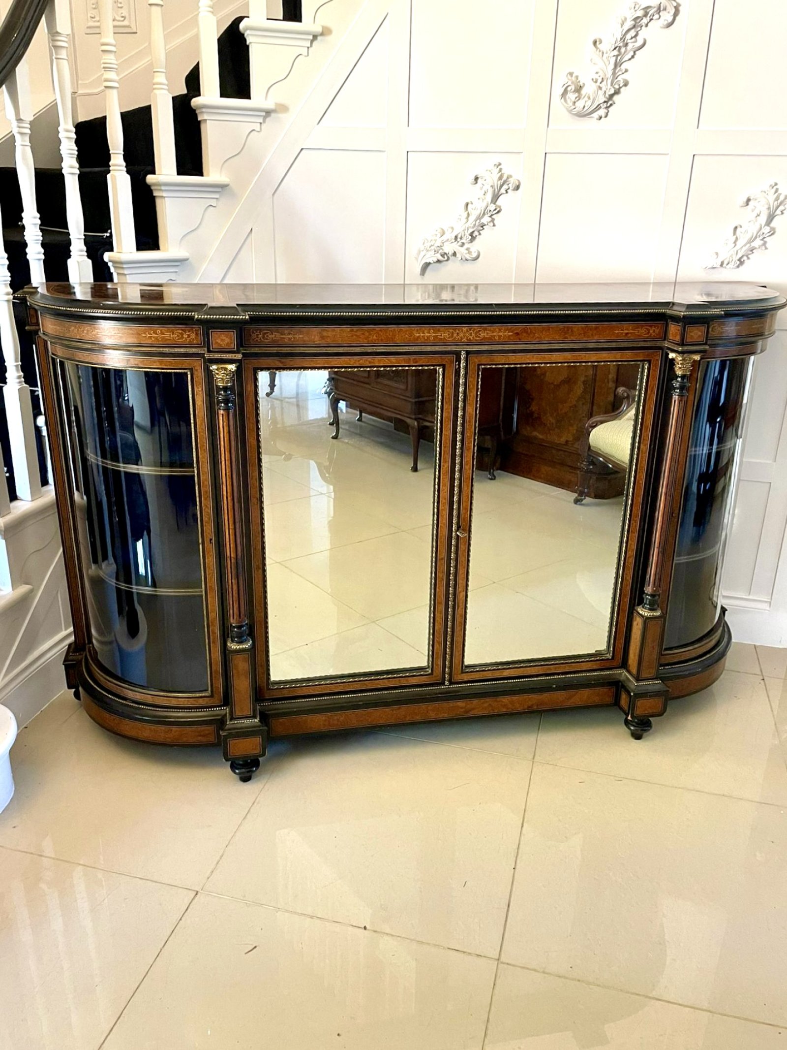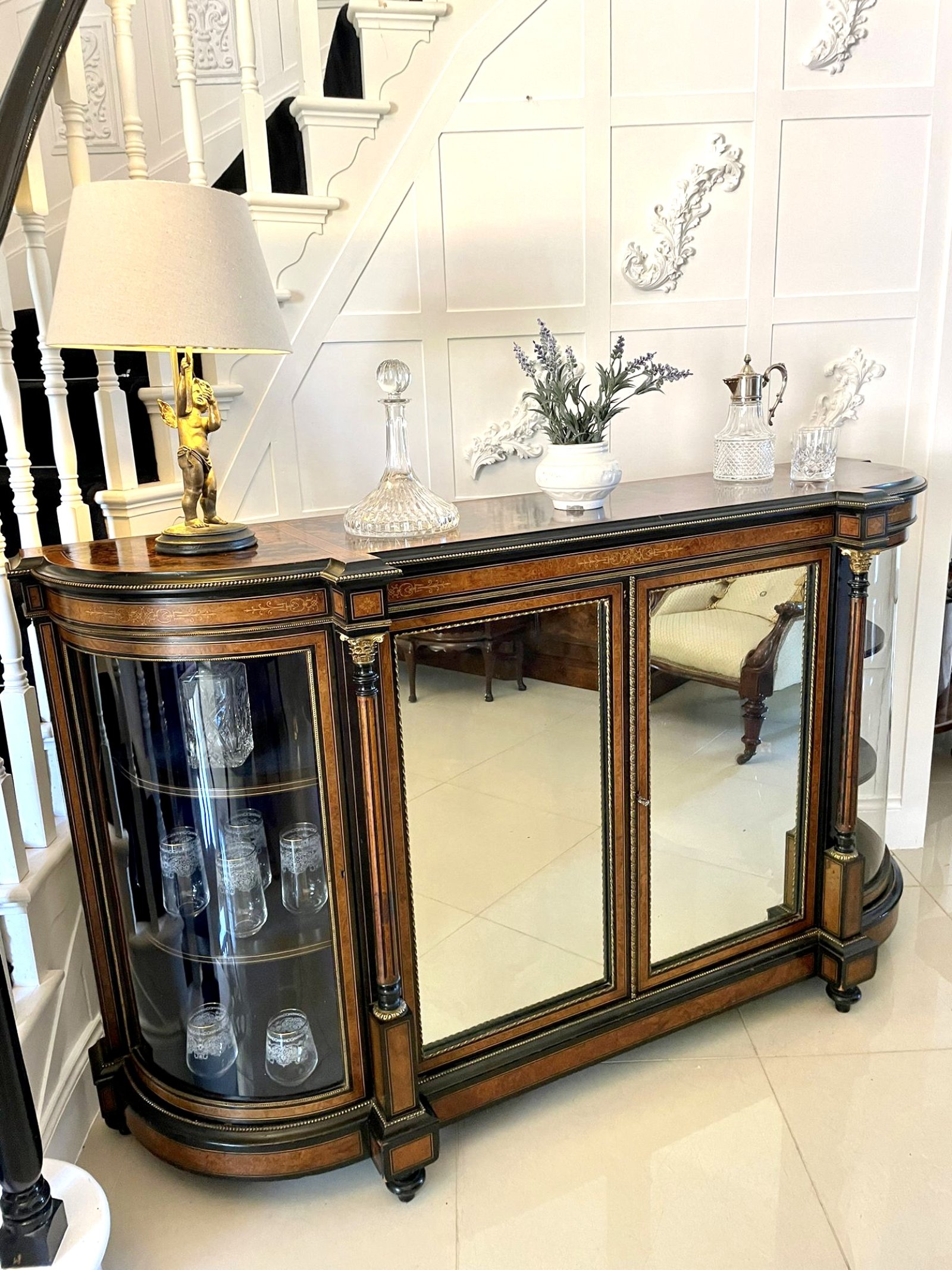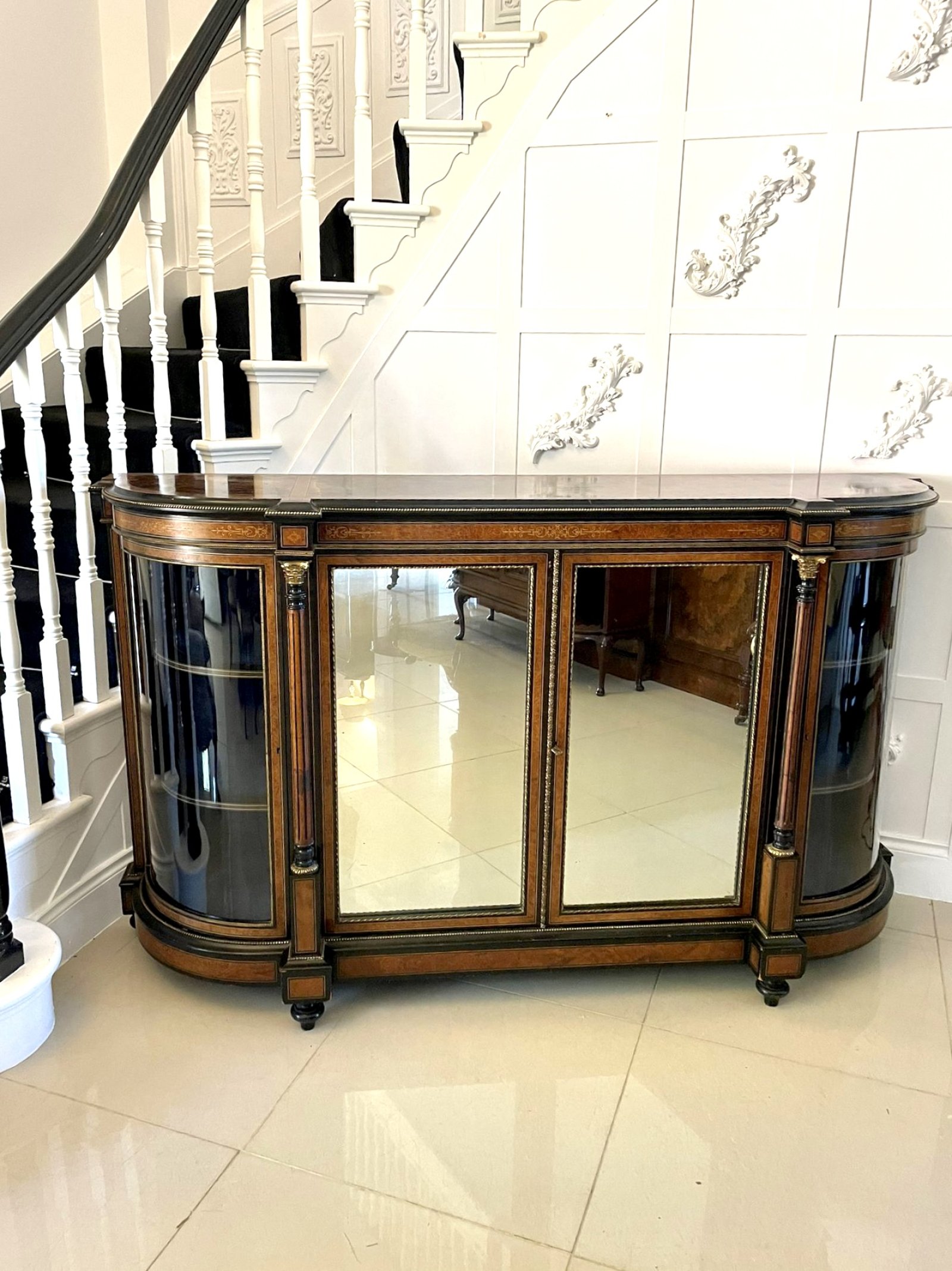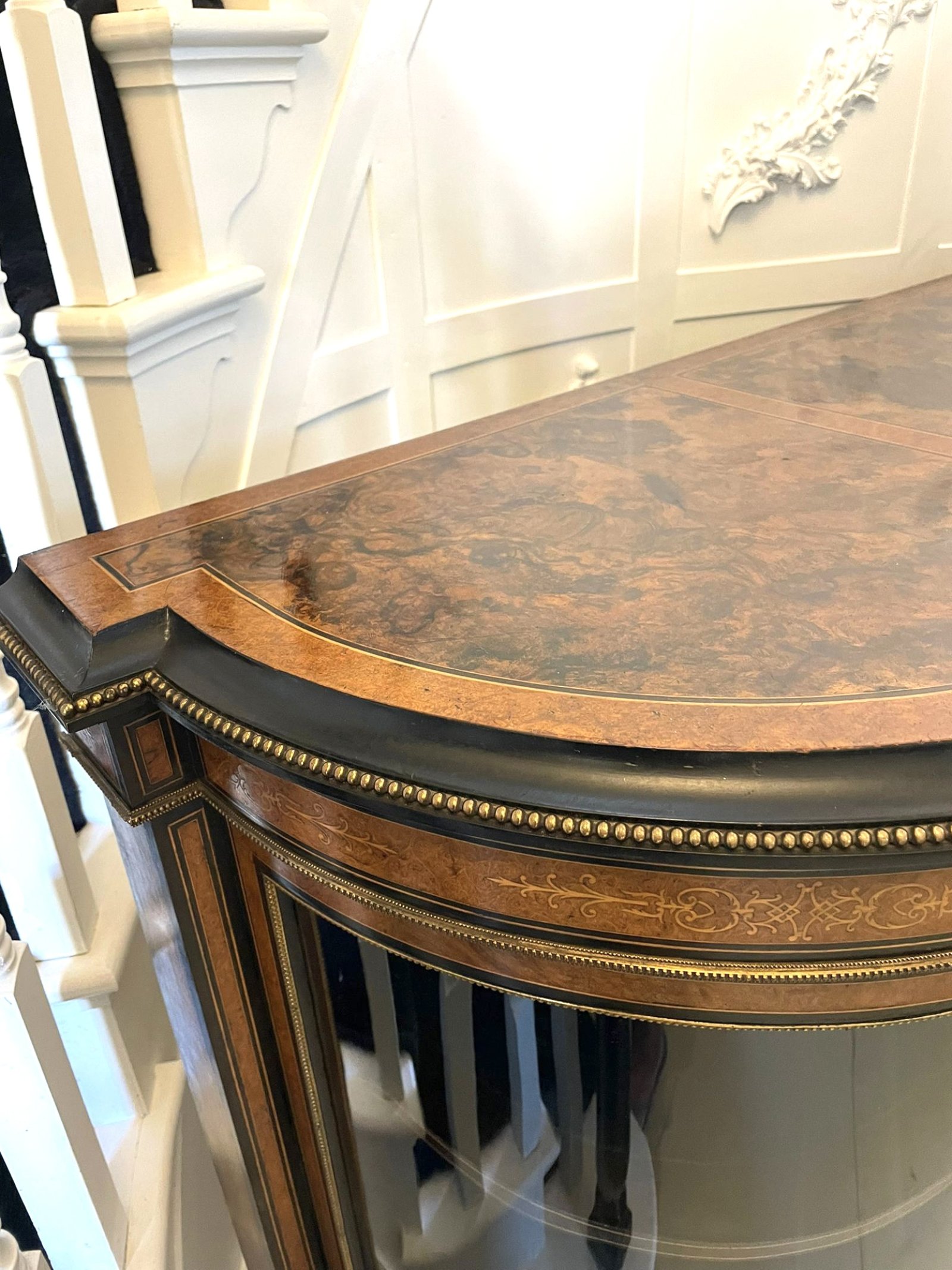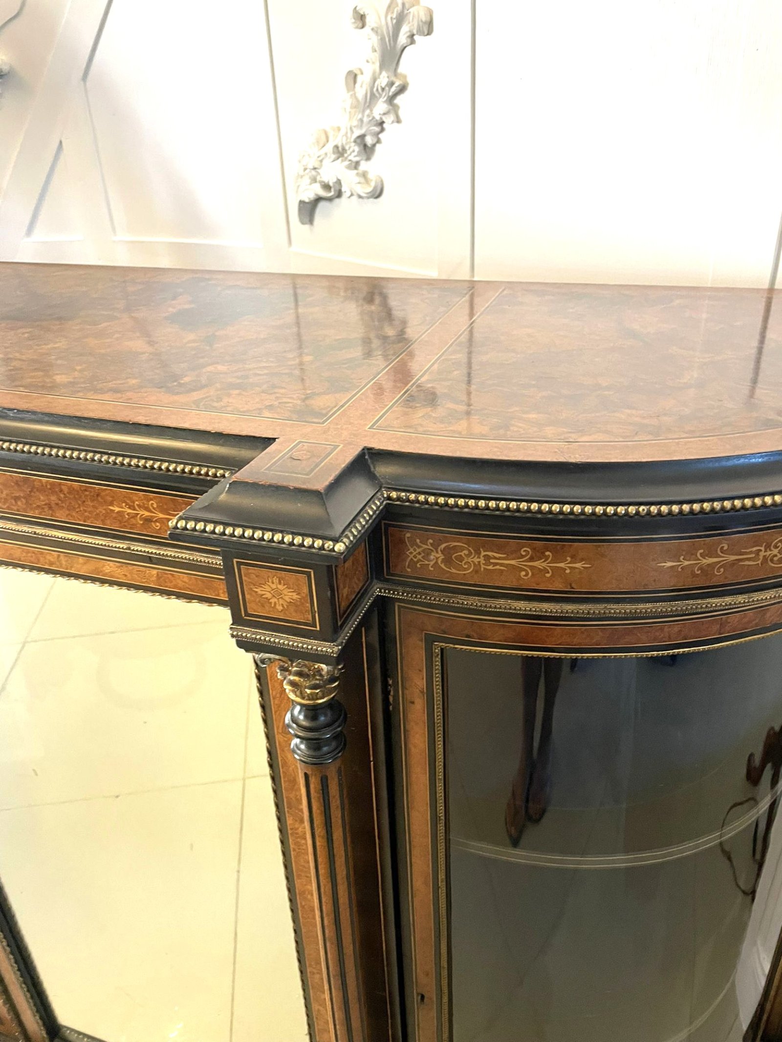 Superb quality large antique Victorian burr walnut and amboyna inlaid credenza having a superb quality burr walnut top crossbanded in amboyna, ebonised thumb moulded edge with brass beading above an amboyna frieze with satinwood inlay above a pair of amboyna doors with original mirrors opening to reveal two fitted shelves with original blue velvet lining. It boasts a wonderful pair of amboyna and ebonised turned columns with ornate ormolu mounts flanked by a pair of bowed glazed doors opening to reveal two fitted shelves with original blue velvet lining standing on an amboyna and ebonised shaped plinth base with a thumb moulded edge and original turned feet