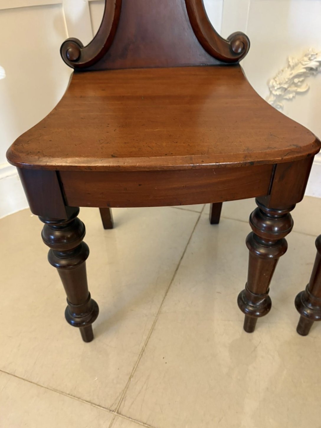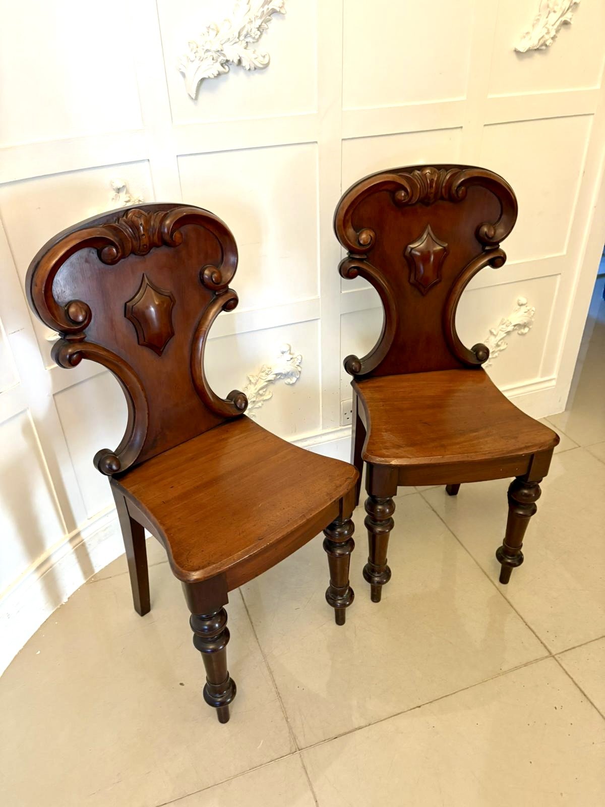 A superb pair of antique Victorian mahogany hall / side chairs beautifully crafted with rich carved detail and elegant sweeping forms—an excellent example of mid-19th-century decorative seating.