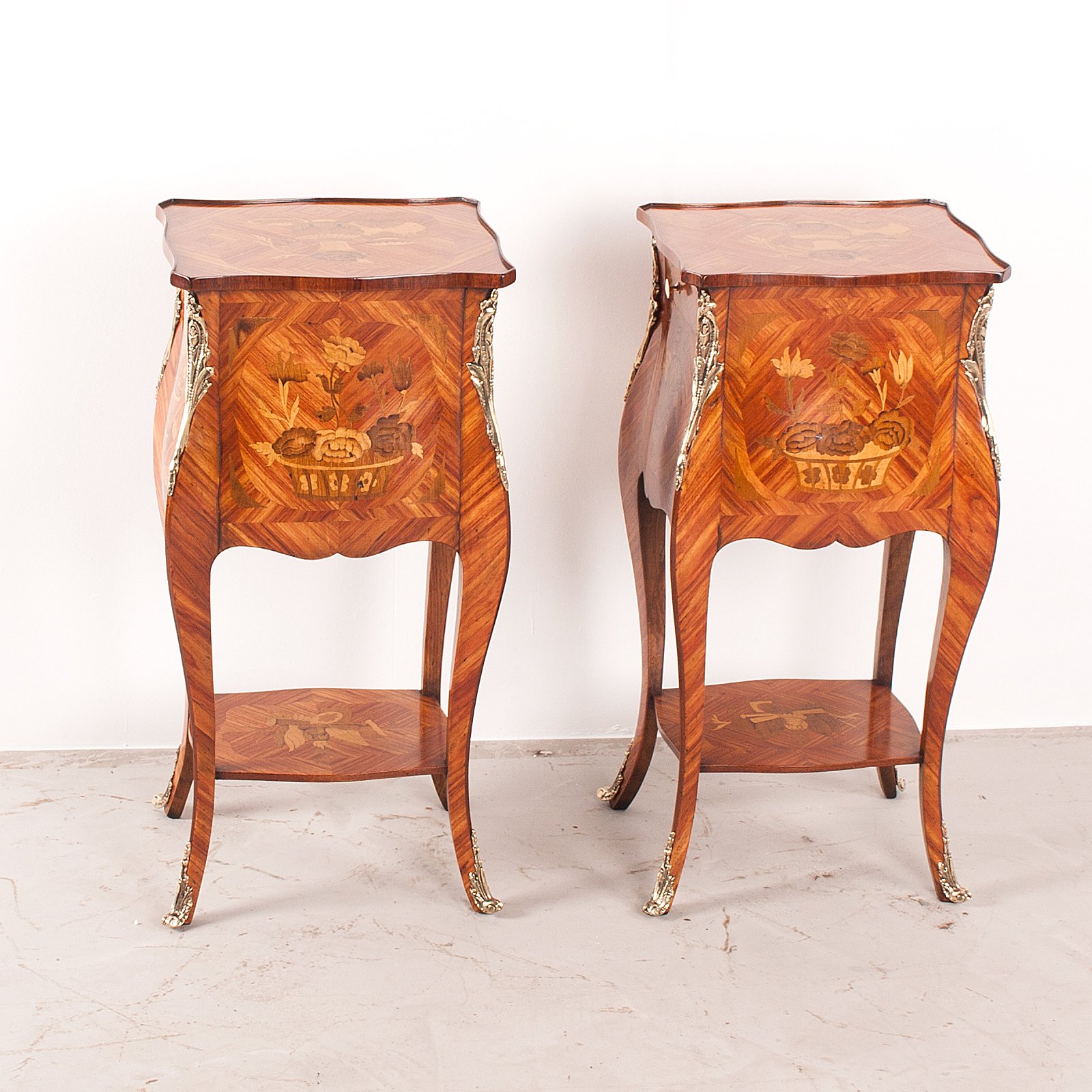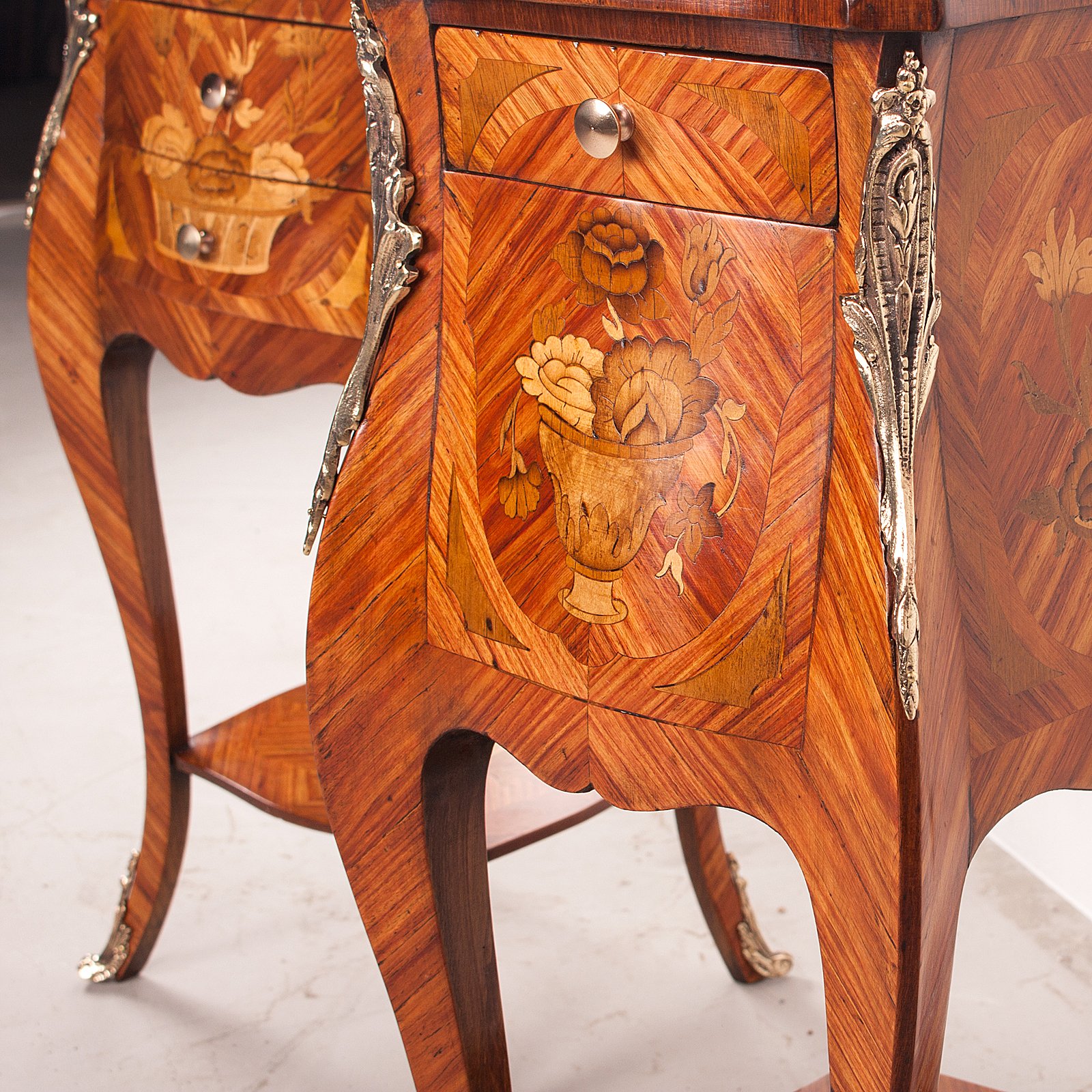 This Superb Quality Pair of French Marquetry Bedside Tables have many decorative details to enjoy. Veneered in Tulipwood with an abundance of marquetry that helps to elevate them immensely. Being of bombé design the curves of the legs and sides flow into each other seamlessly.