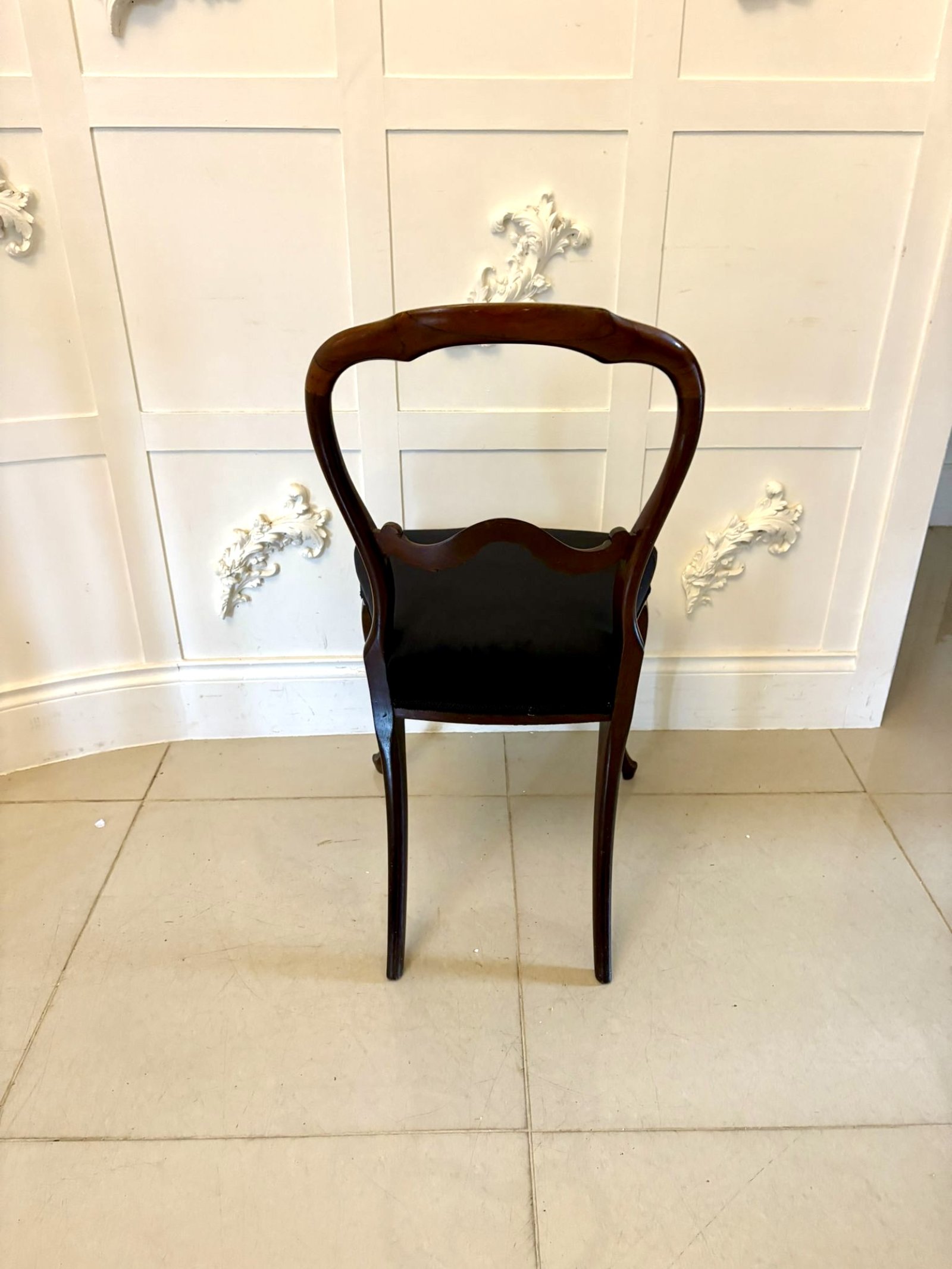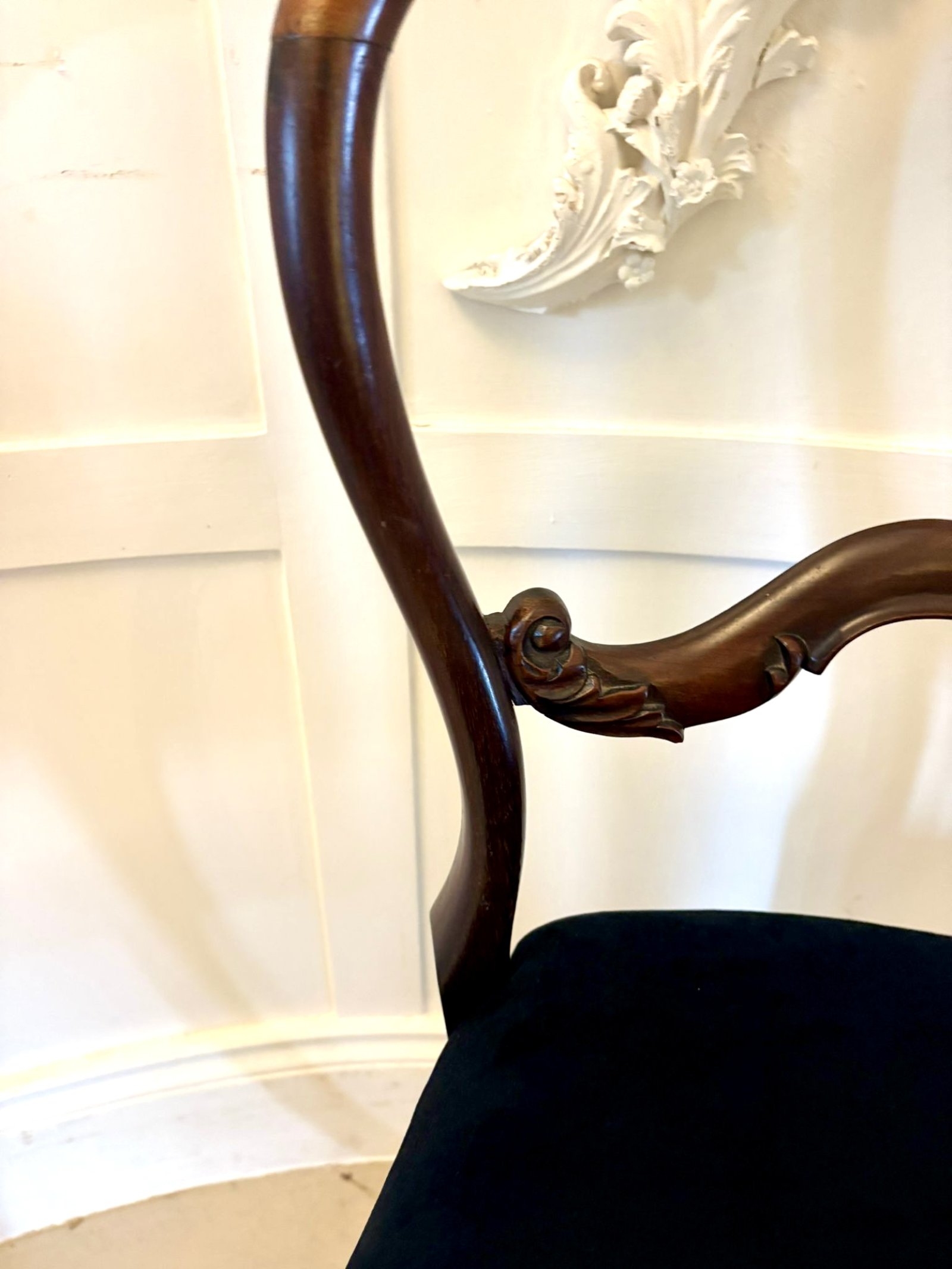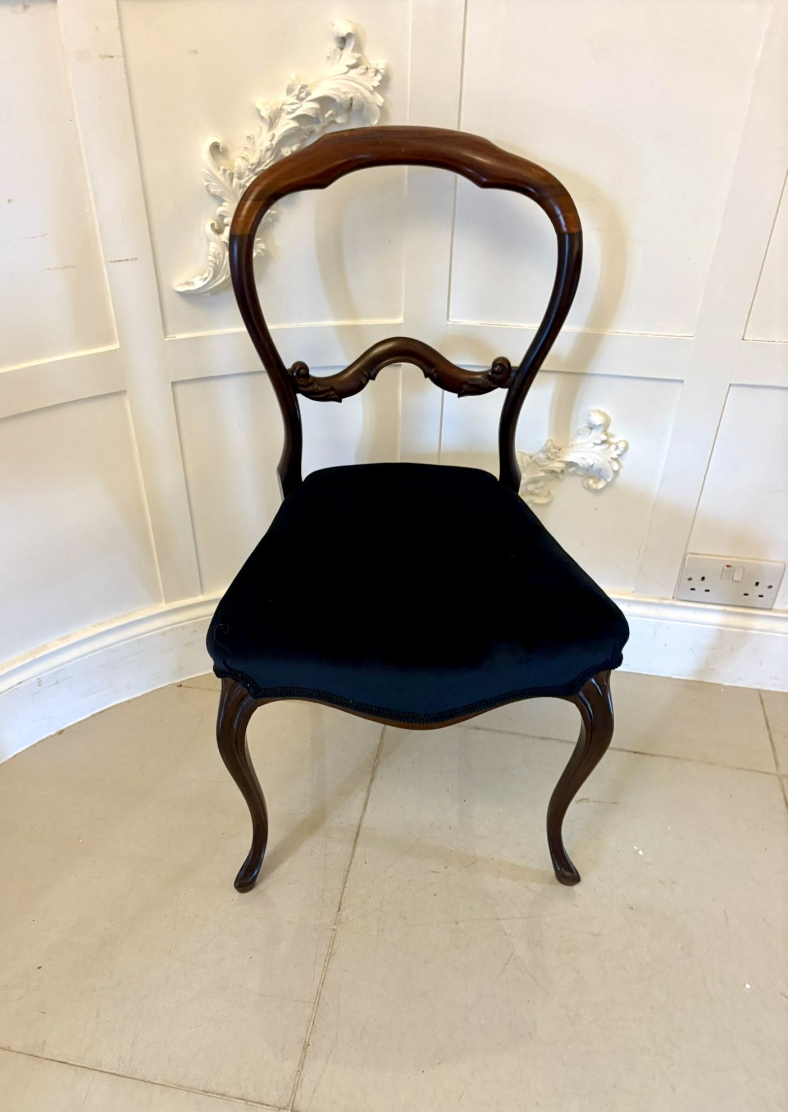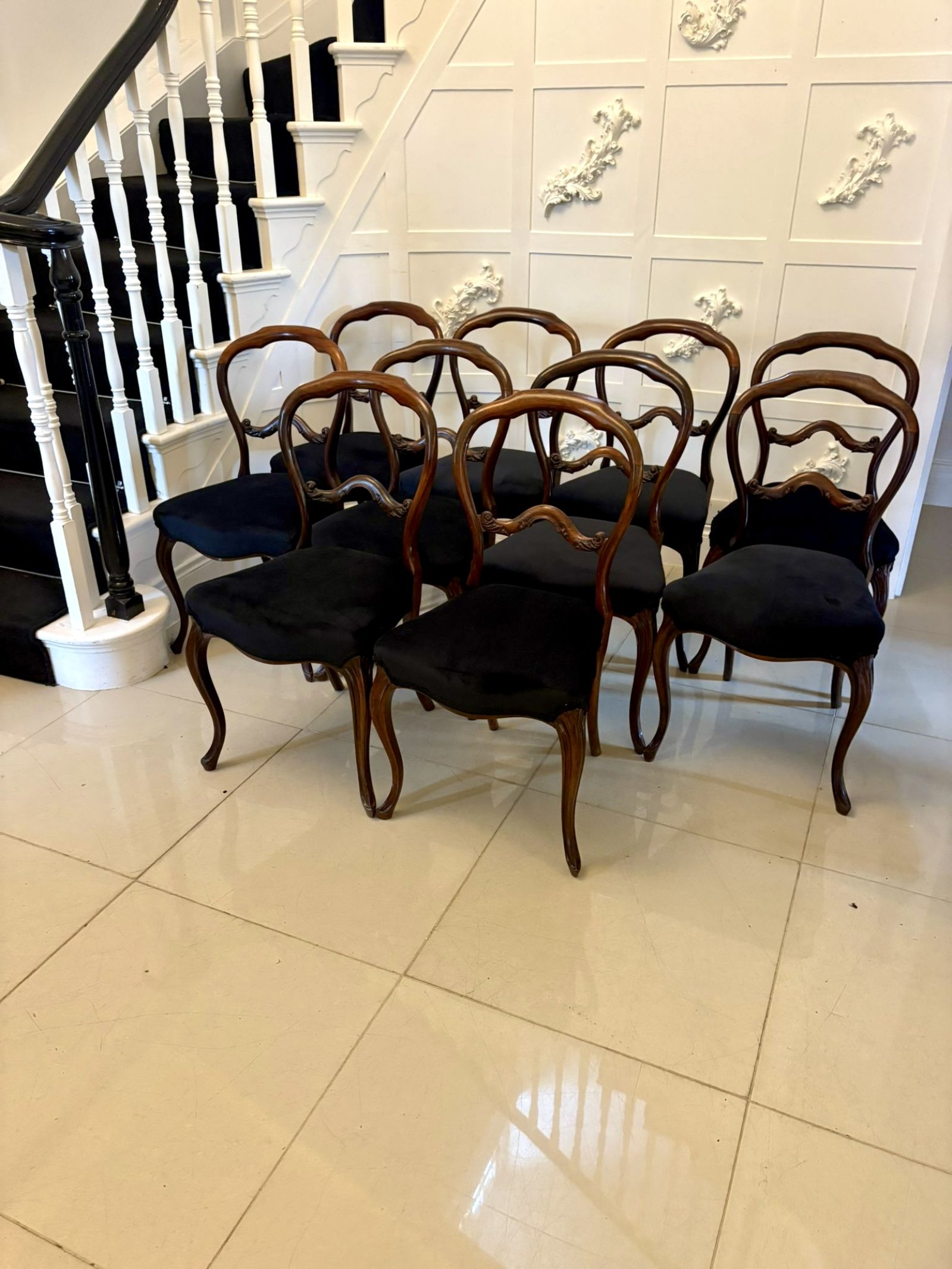 Superb quality set of ten antique Victorian rosewood dining chairs having a magnificent quality shaped rosewood back and centre splat, newly reupholstered serpentine shaped seats in a quality black velvet fabric standing on shaped cabriole legs to the front and outswept back legs.