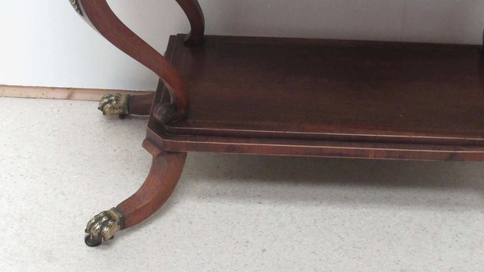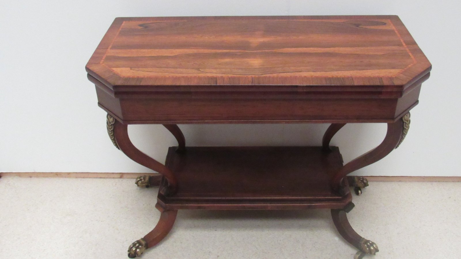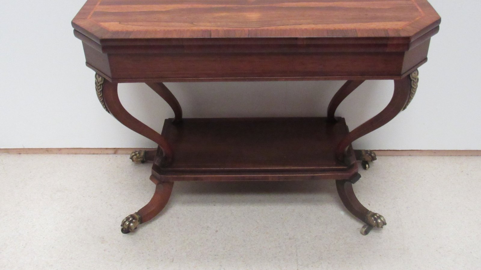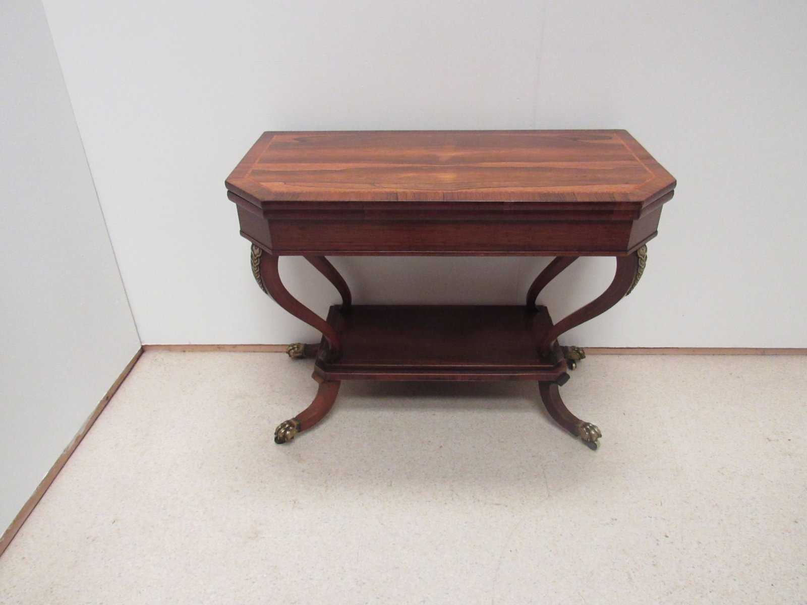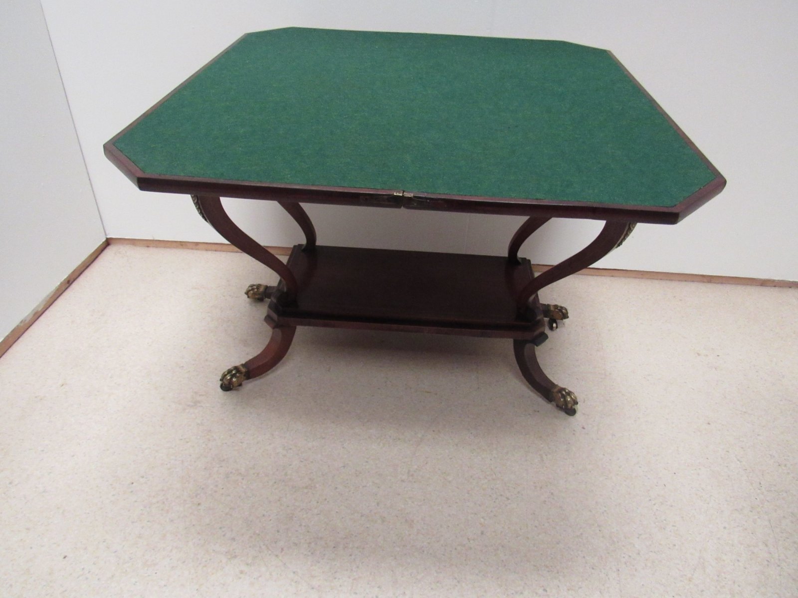 A most wonderful Regency card table .The well figured top raised on bold shaped legs leading to a under tier with this raised by sabre legs ,these with ormolu mounts and lovely ormolu toes .The top opening to reveal a green baize .The top with a deep crossbanded top. A most beautiful card table .