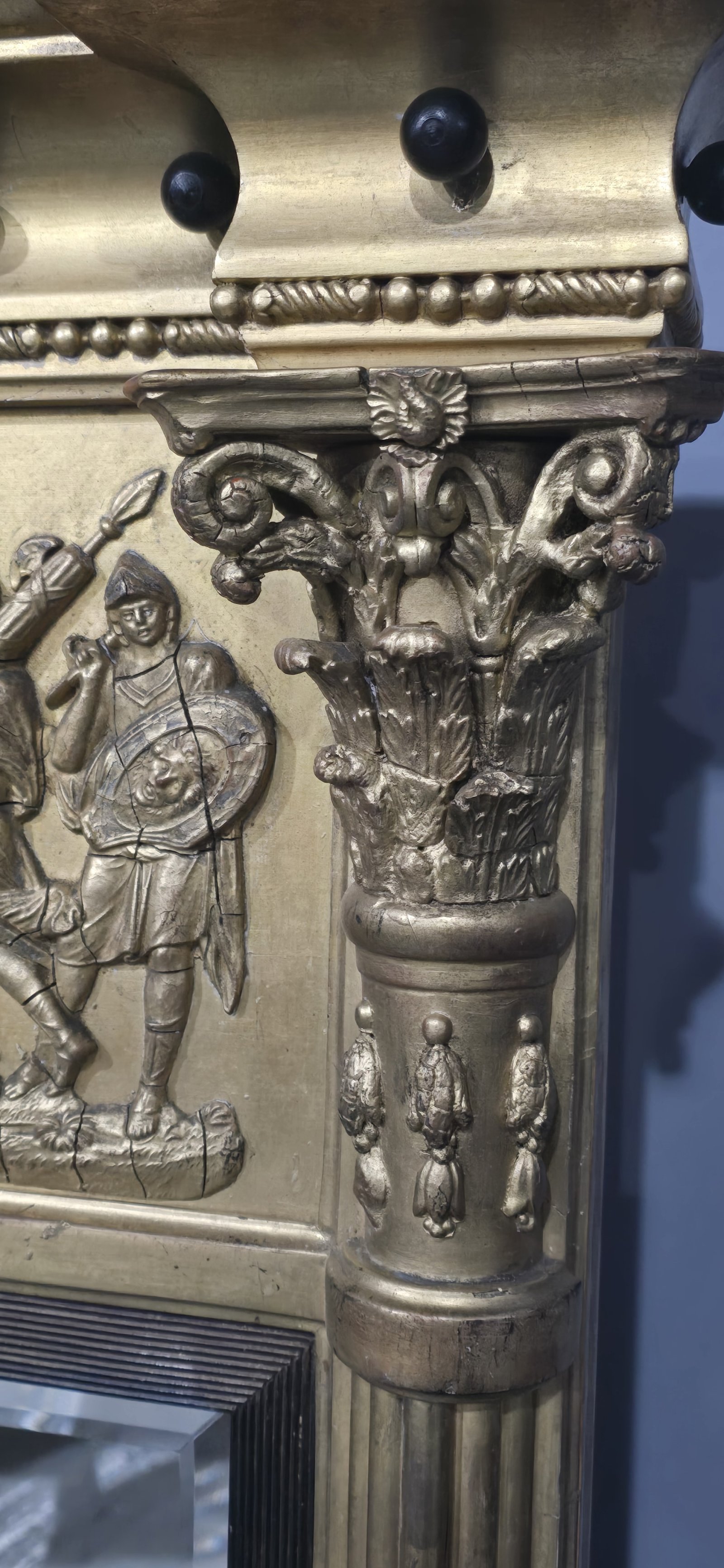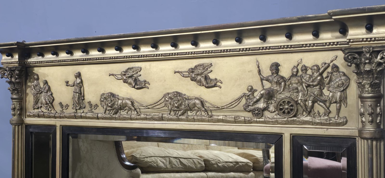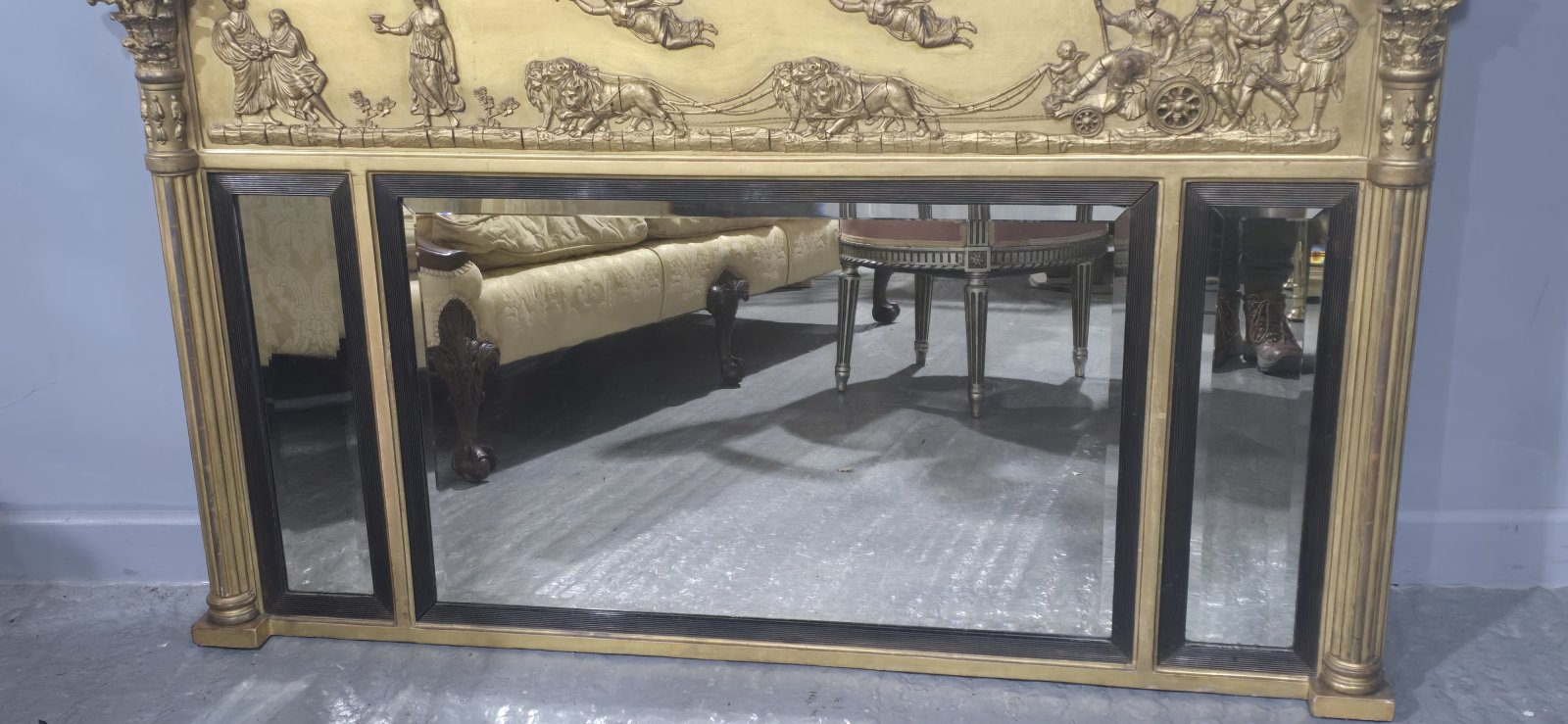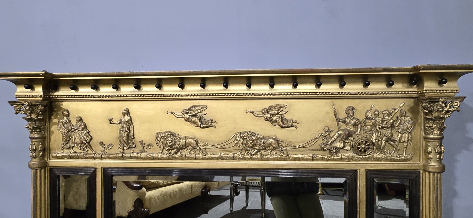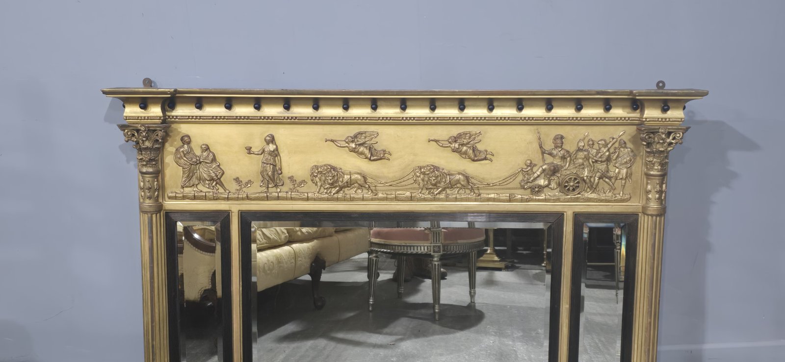 A very good Regency gilt triple plate mirror, bevelled mirrors, Mars being pulled by a charriot, black balls, cointhium columns, in excellent overall condition.
