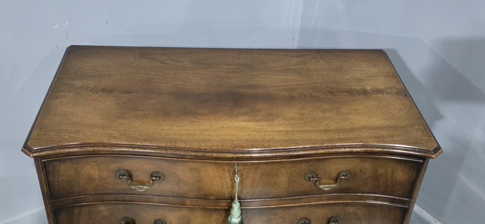 A very fine oak lined Georgian style serpentine mahogany chest of four drawers by Maples, brass swan necked handles, standing on outswept bracket feet, in overall an excellent colour and in excellent condition.