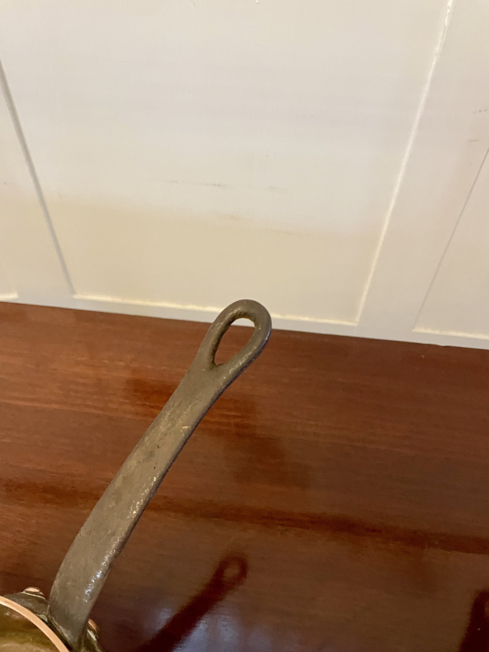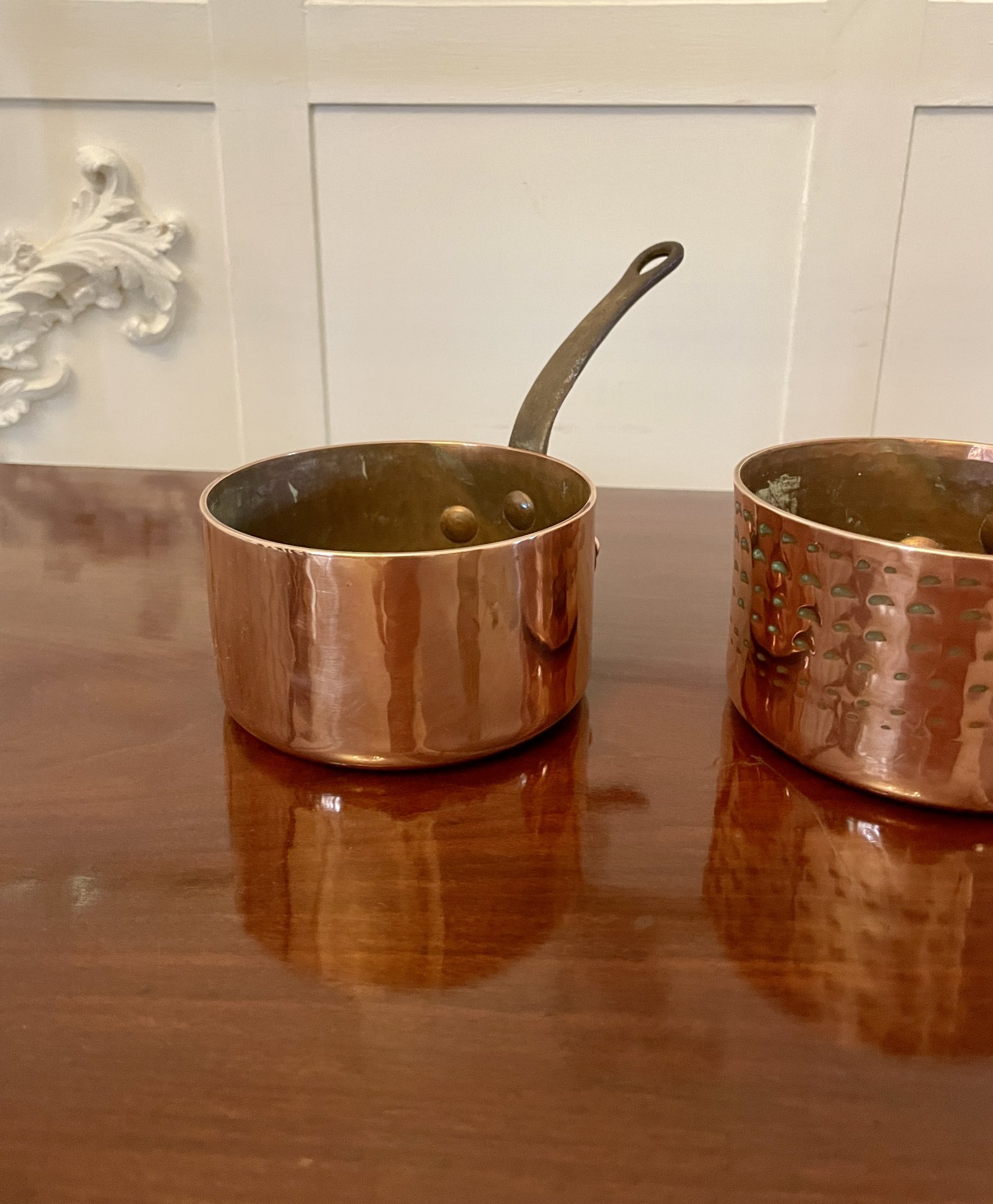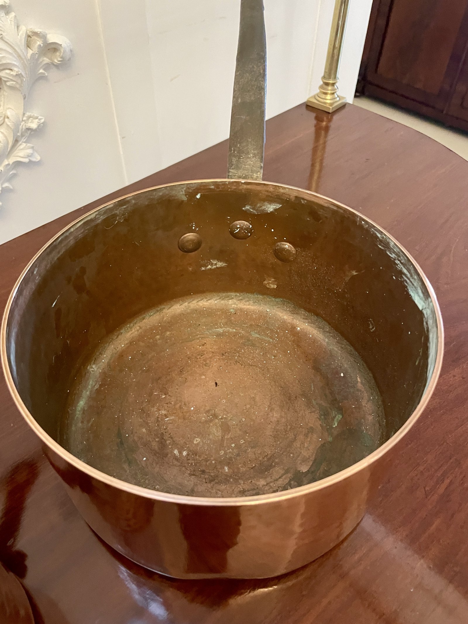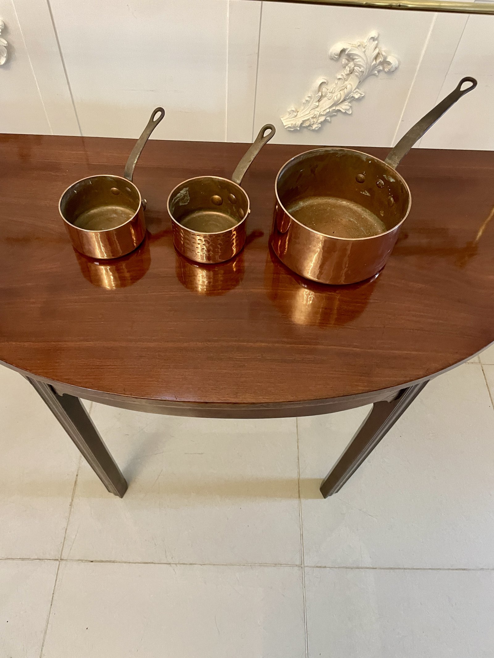 Three antique Victorian copper pans of circular form having a copper base, iron handles with copper rivets and hanging holes. They are heavier than the average copper saucepan