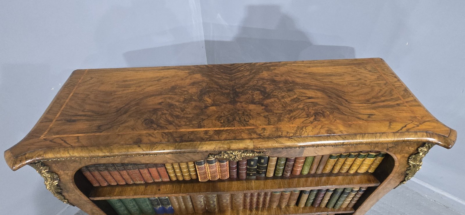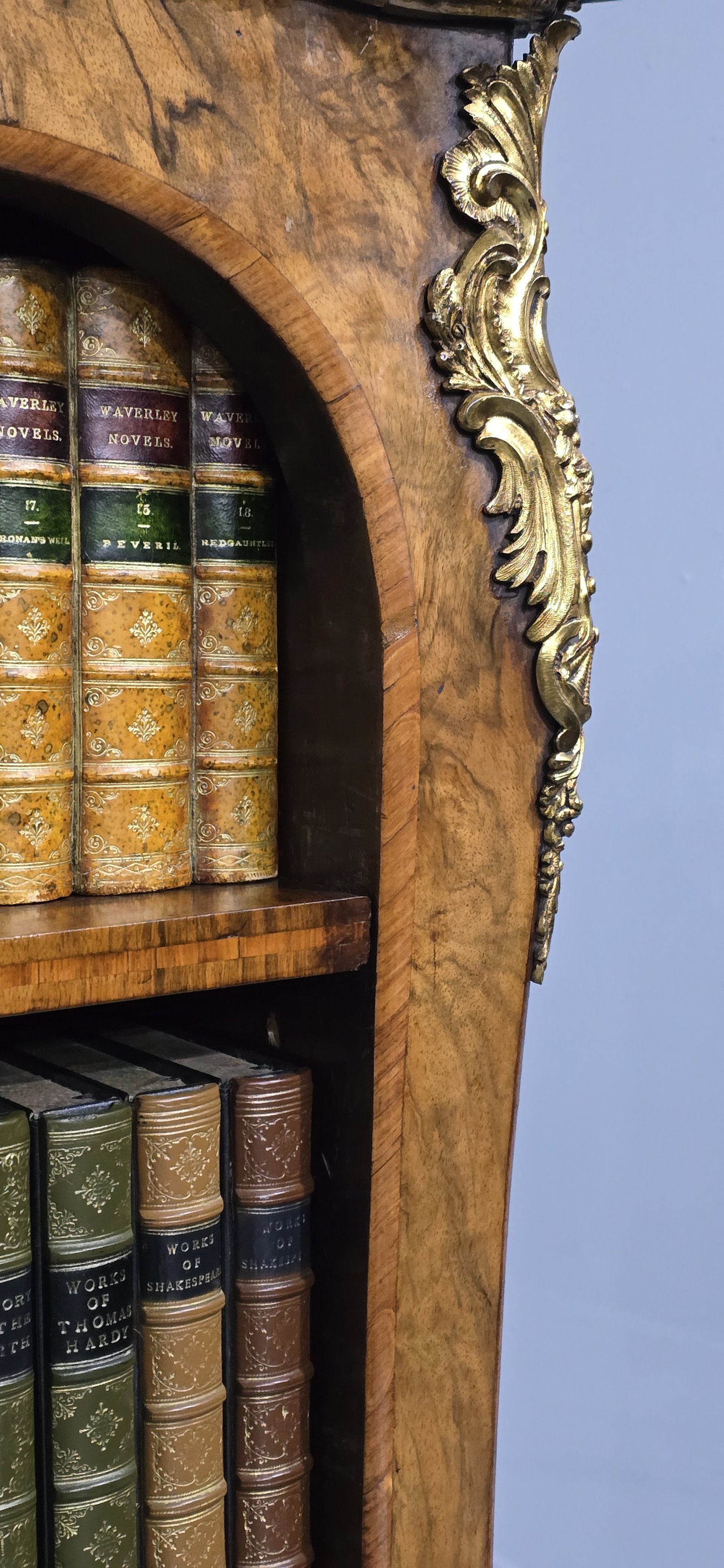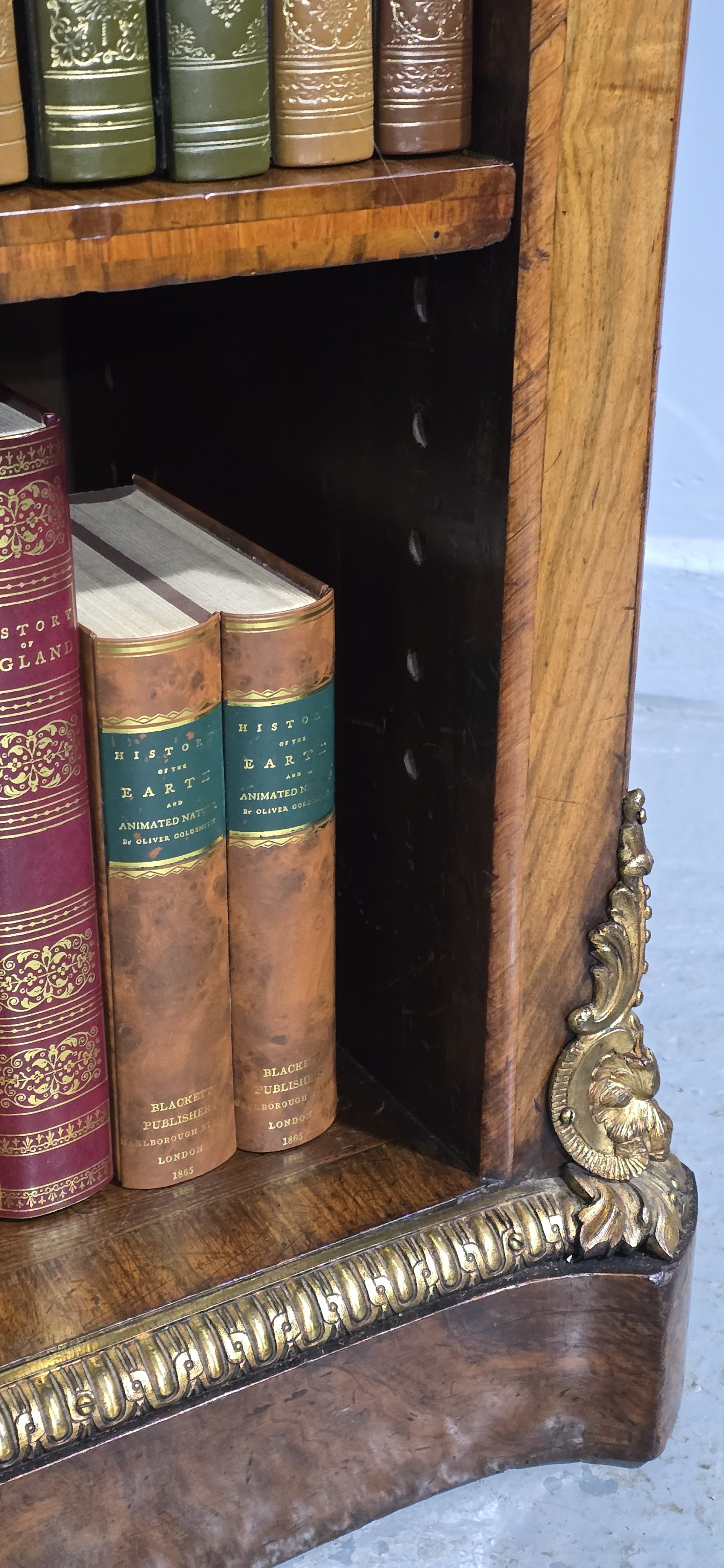 Superb quality English figured walnut concave sided and ormolu mounted open adjustable library bookcase, two adjustable shelves, in overall very good condition.