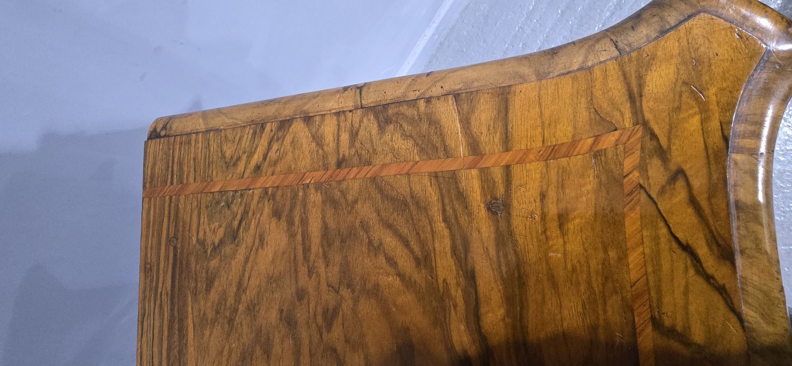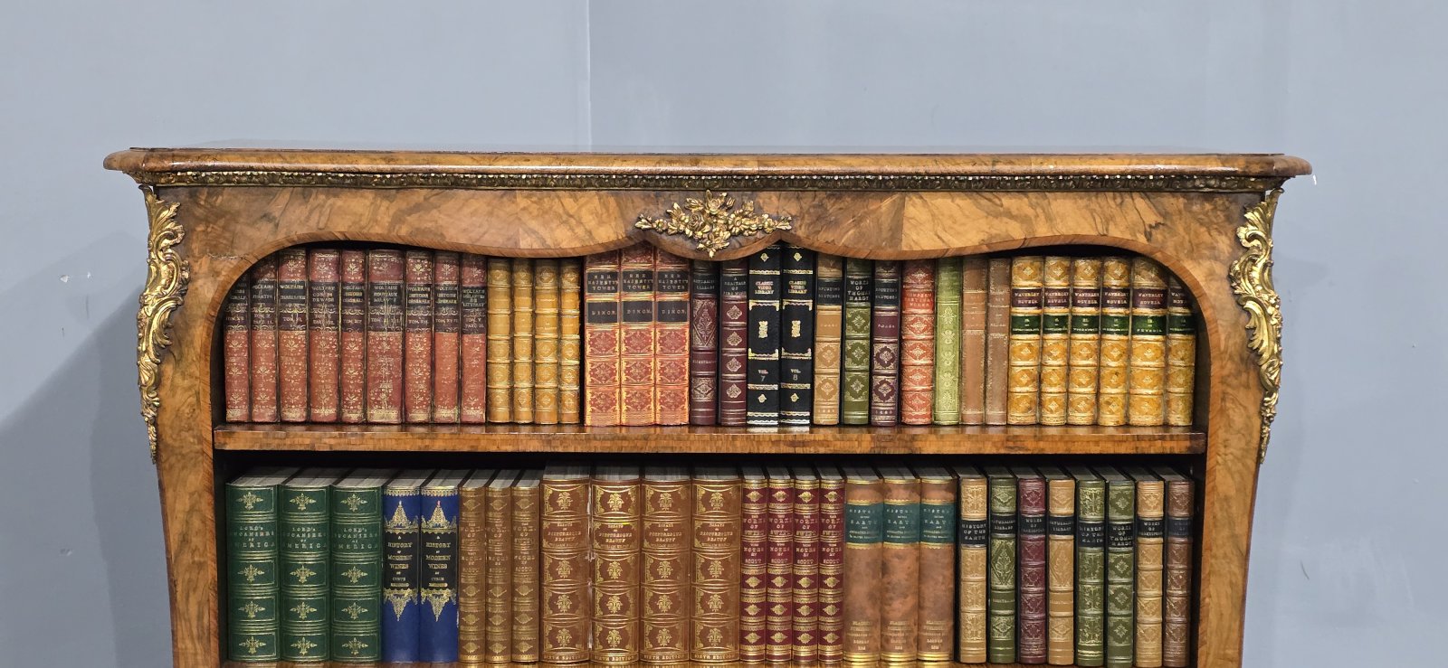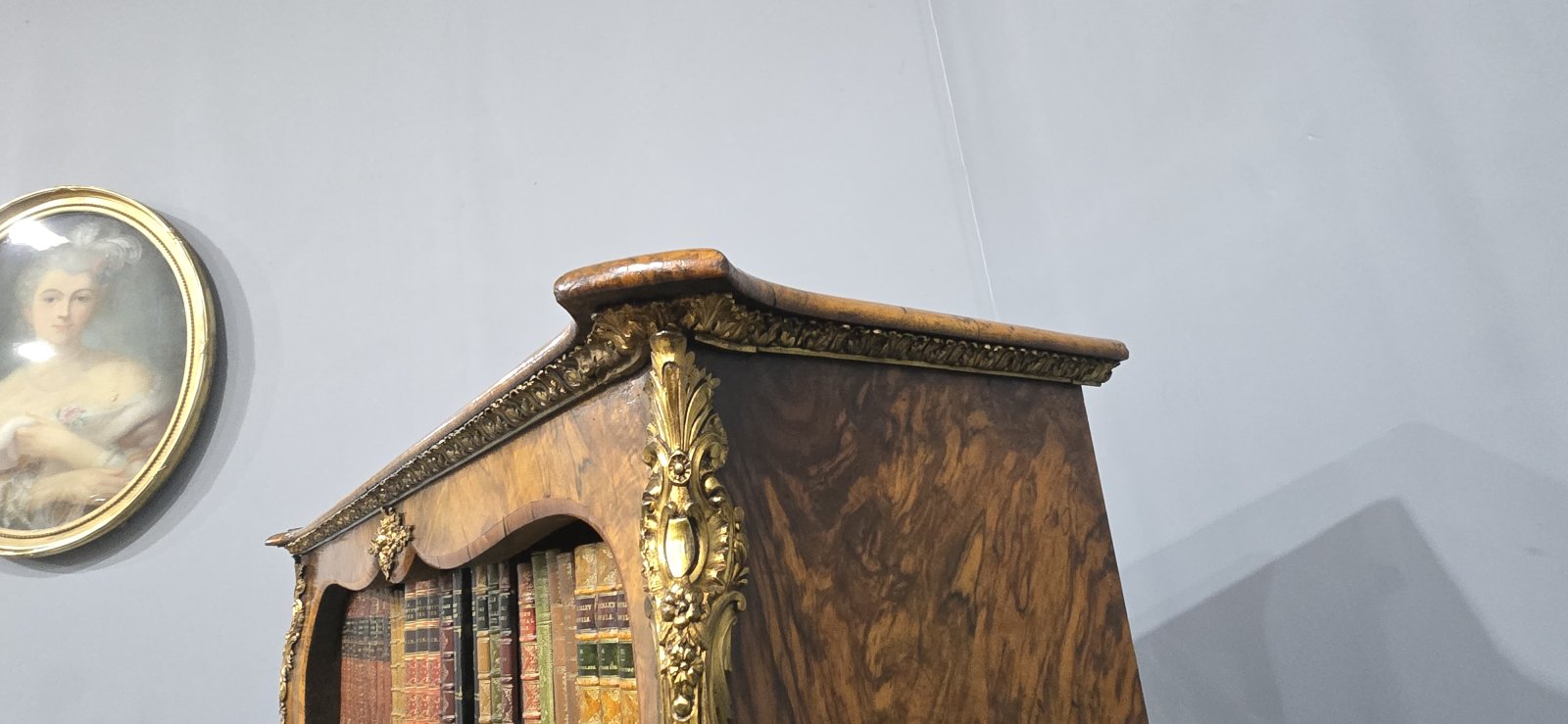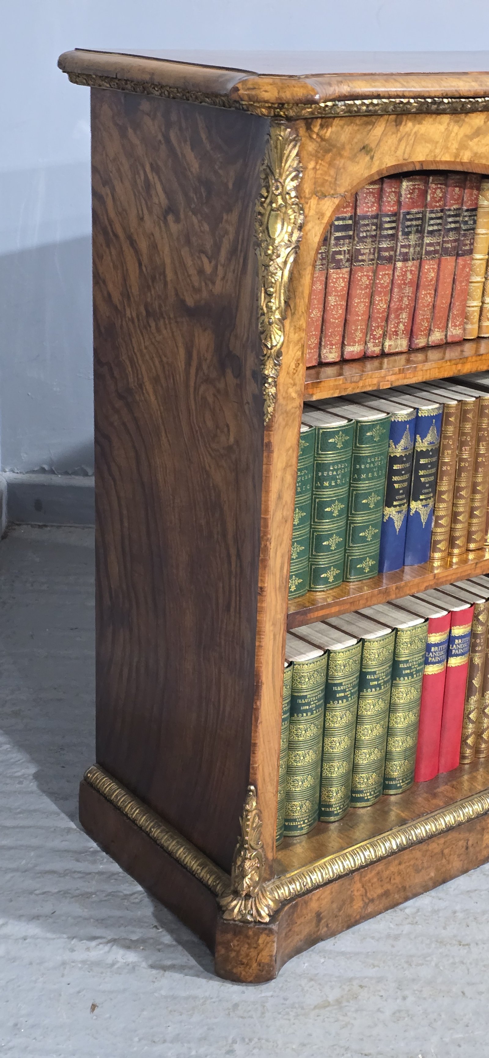 Superb quality English figured walnut concave sided and ormolu mounted open adjustable library bookcase, two adjustable shelves, in overall very good condition.