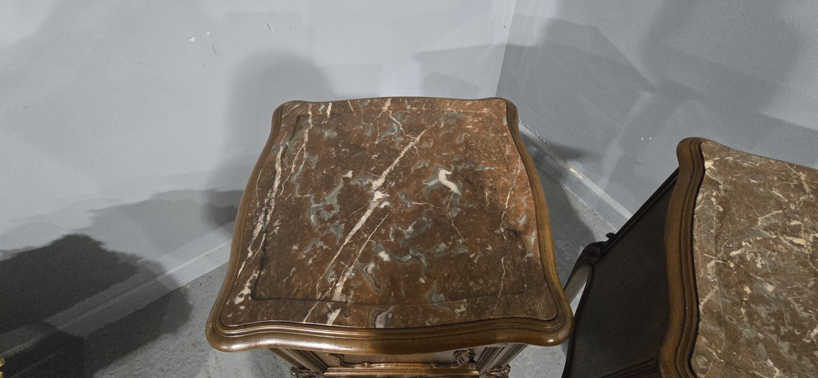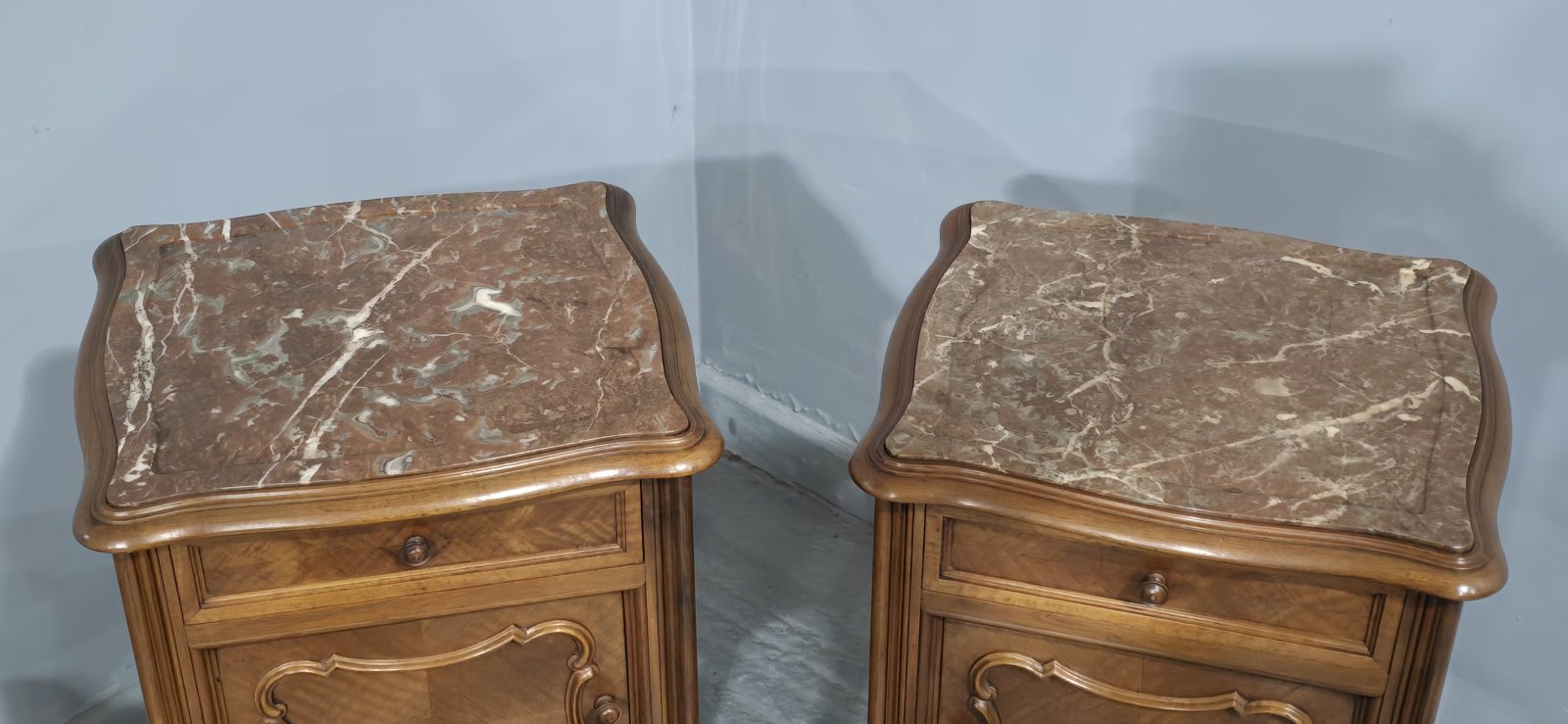 Very nice pair of French walnut bedside lamp tables, lined with white marble, freestanding and in super overall colour and condition.