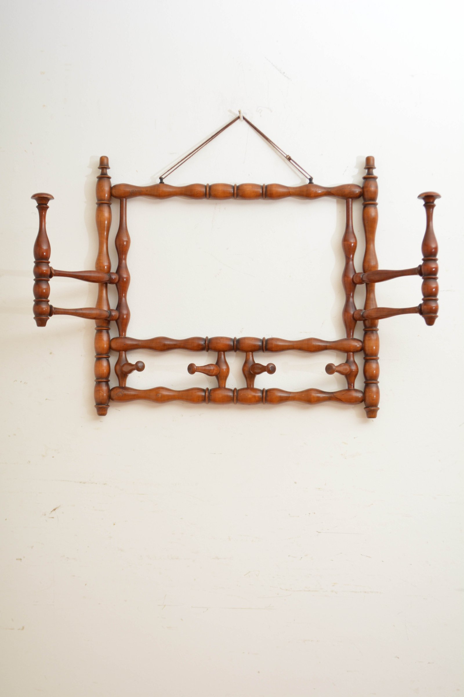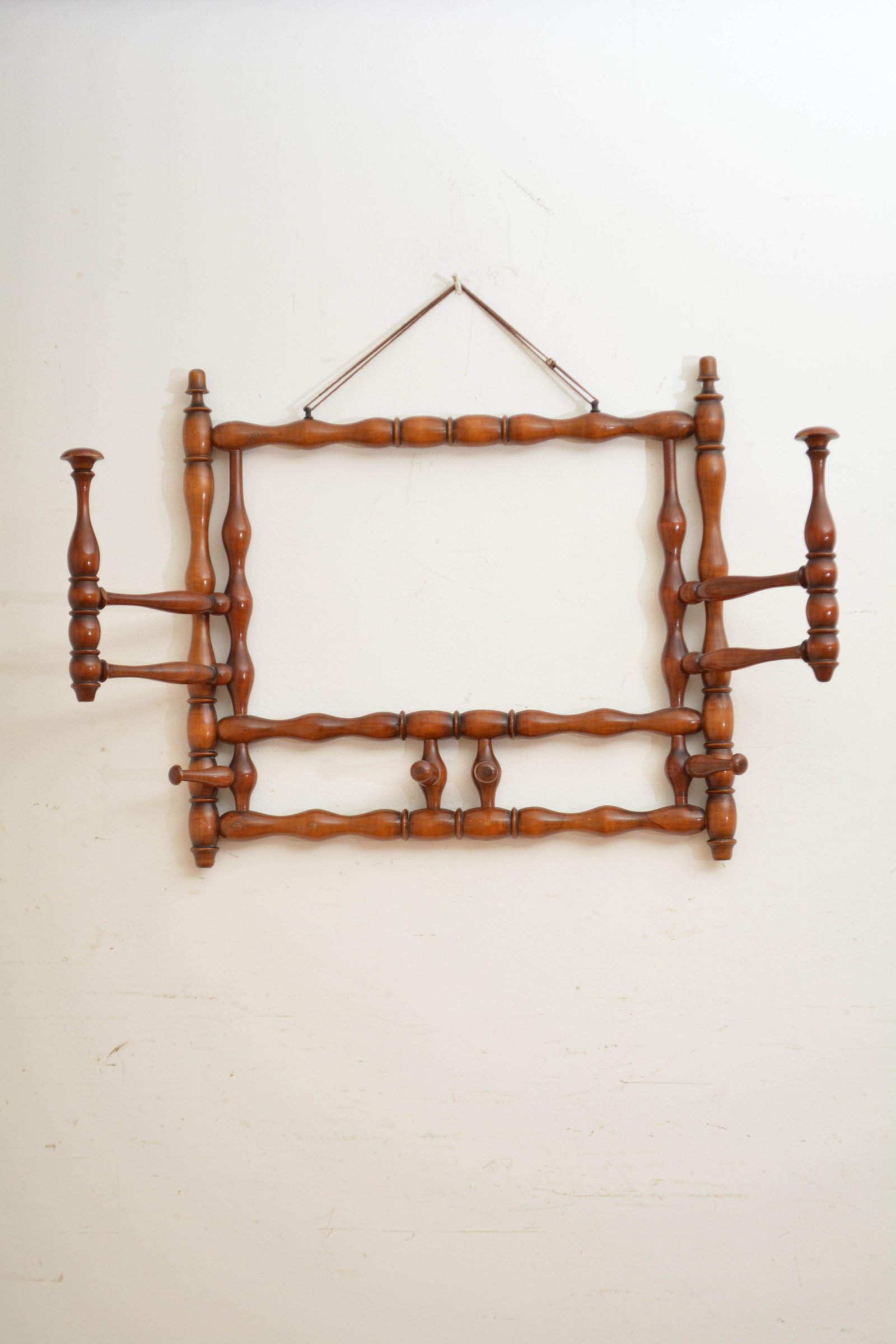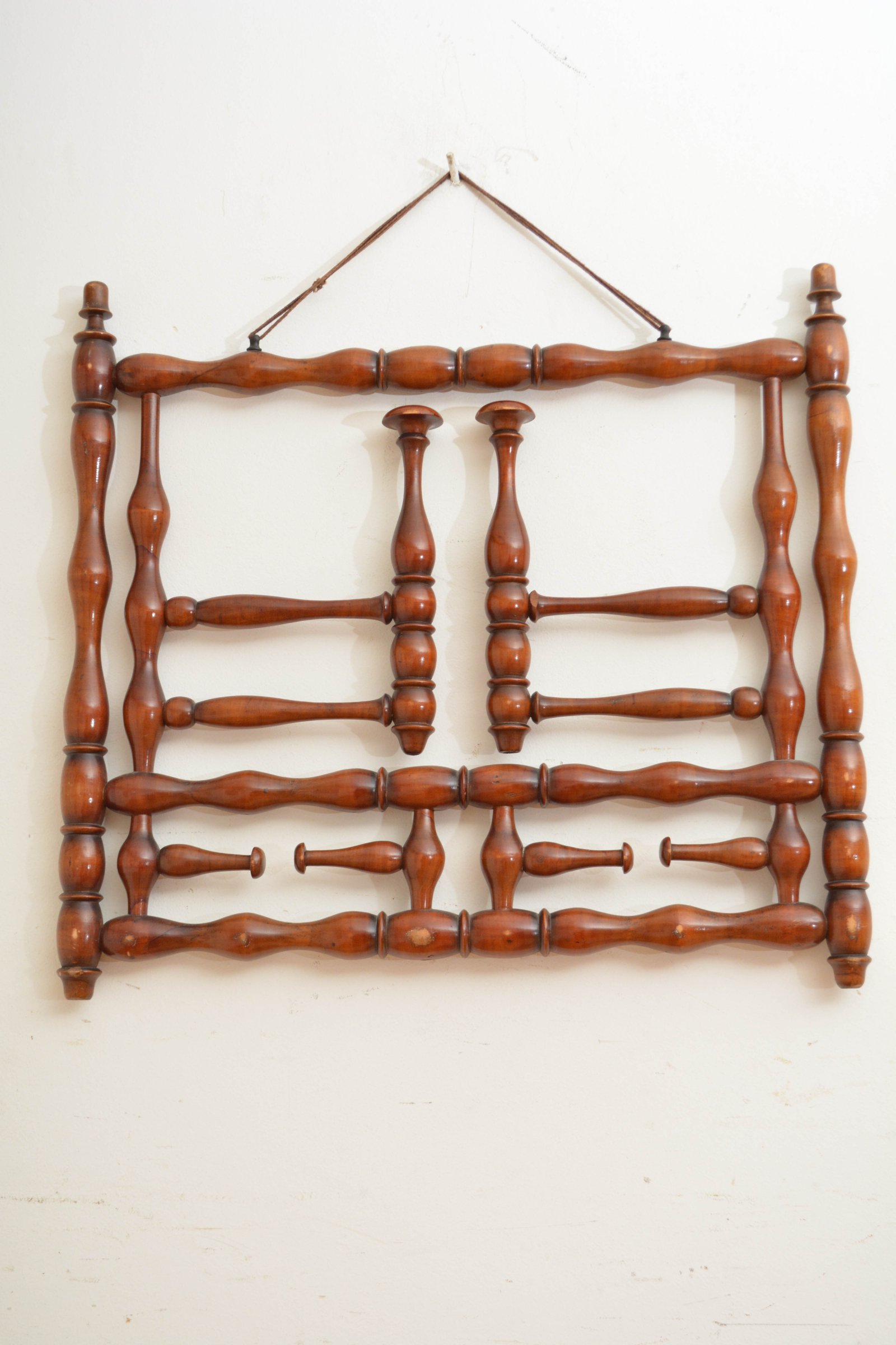 K0635 Stylish and unusual French bobbin coat and hat rack, having two large and four small swivelling hat and coat hooks. All in good working order and in home ready condition. No woodworm, sturdy, no breaks, cracks or old repairs. c1900