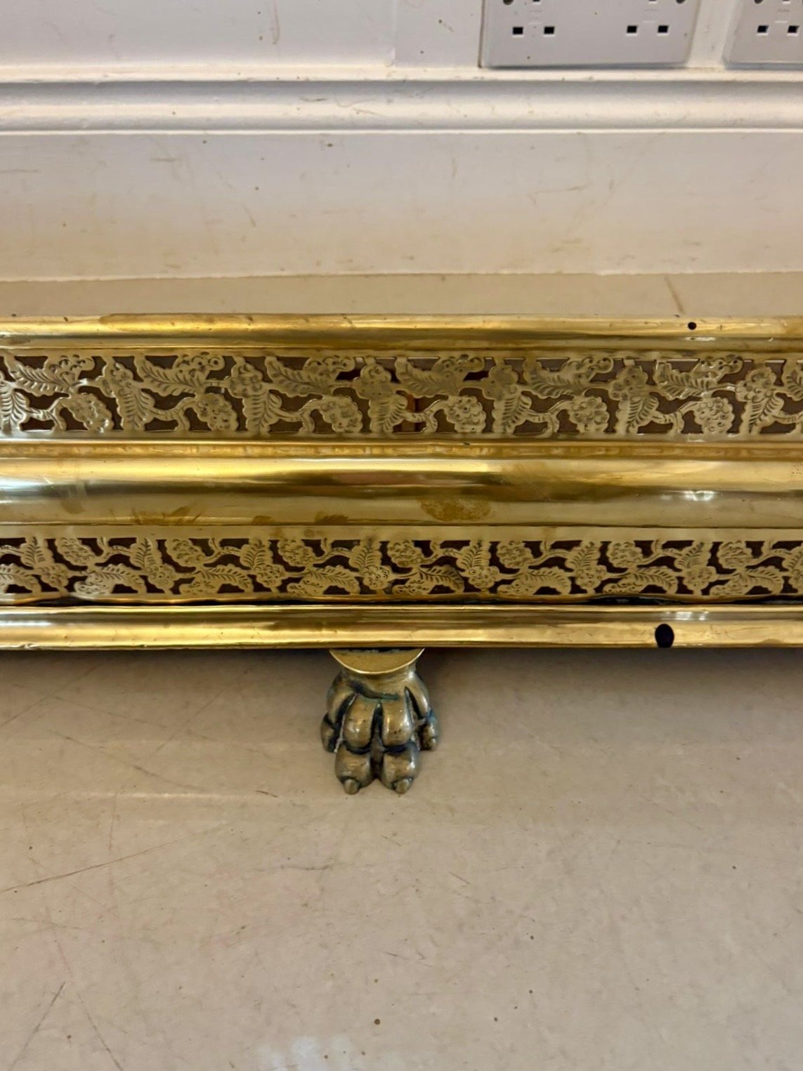 An unusual and highly decorative Regency brass fender distinguished by its elegant proportions and the survival of its original accompanying fire irons, an increasingly rare feature. The fender is of rectangular form, enriched with finely worked decorative bands and raised on classic paw feet, giving it both presence and refinement.