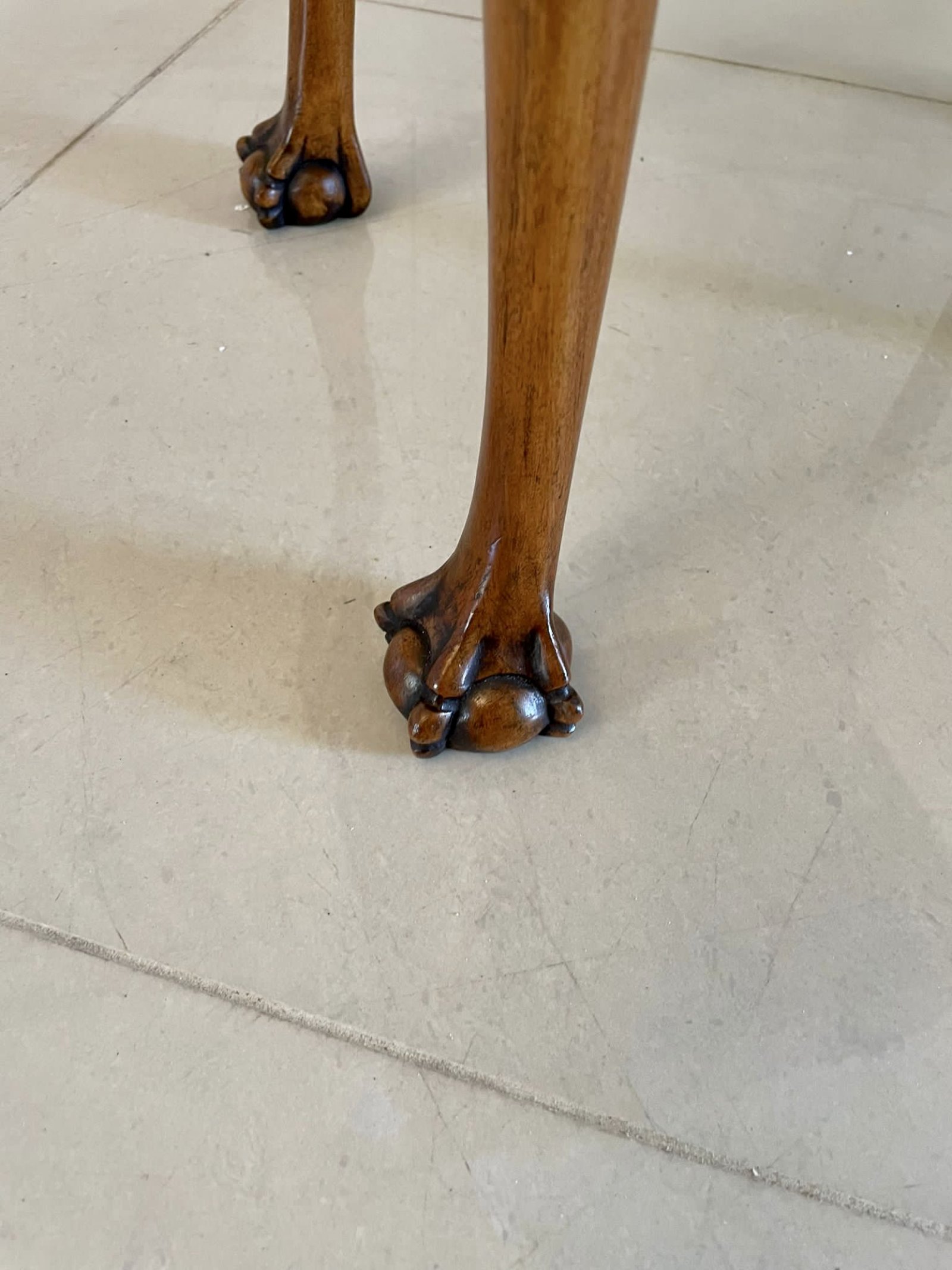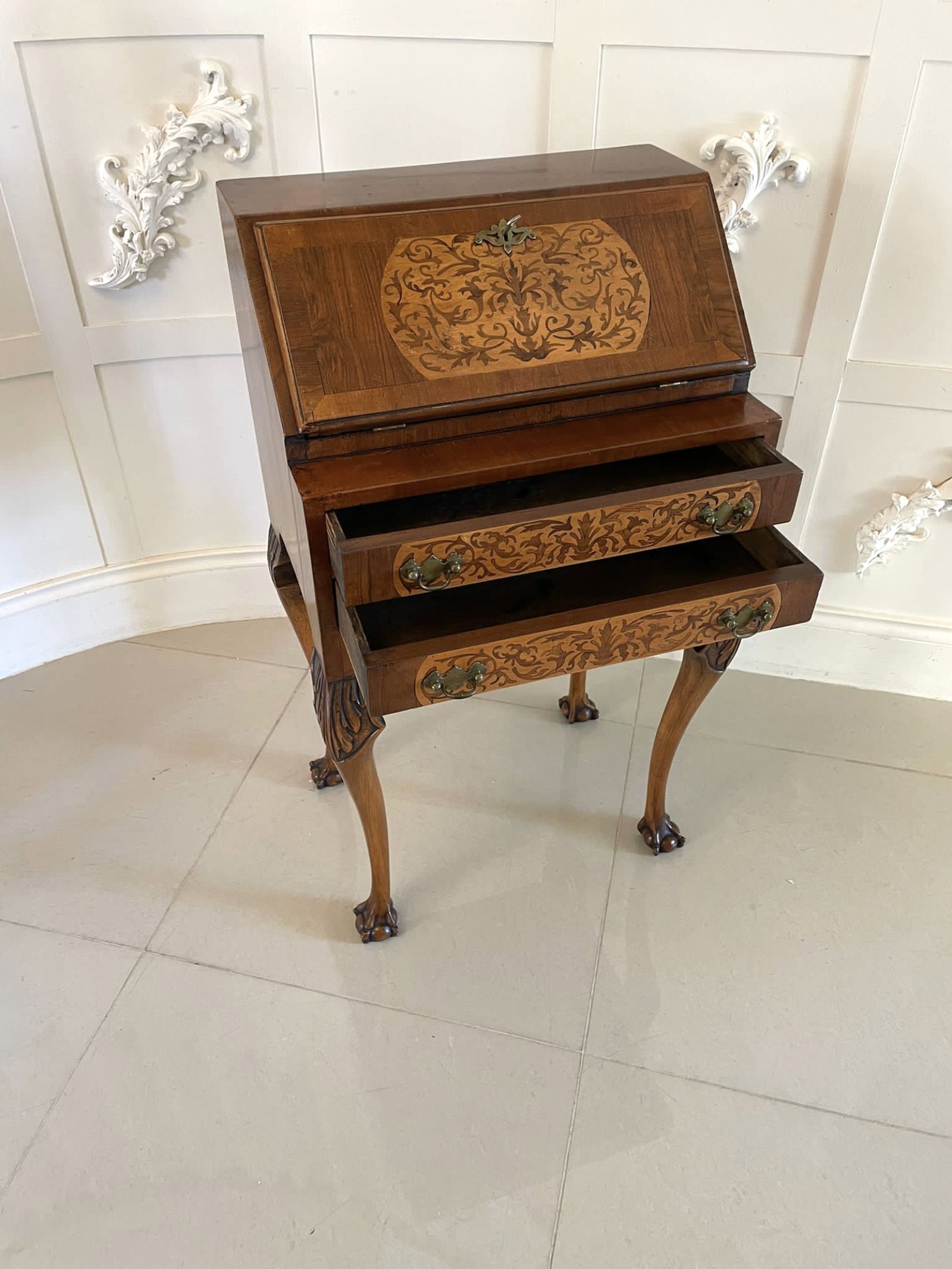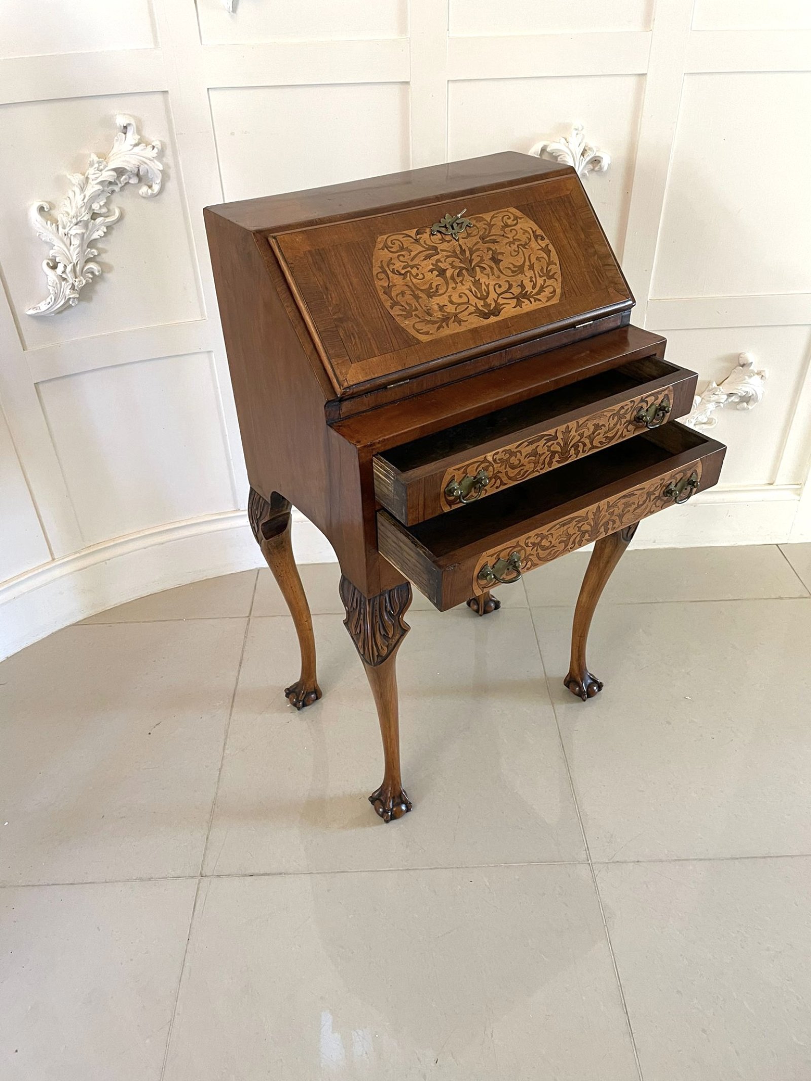 Unusual Antique burr walnut marquetry inlaid bureau having a quality burr walnut rectangular top above a pretty crossbanded marquetry inlaid fall opening to reveal a fitted interior consisting of drawers and pigeon holes above two long marquetry inlaid drawers with original brass handles. It stands on lovely shaped carved walnut cabriole legs with claw and ball feet and has the original key.