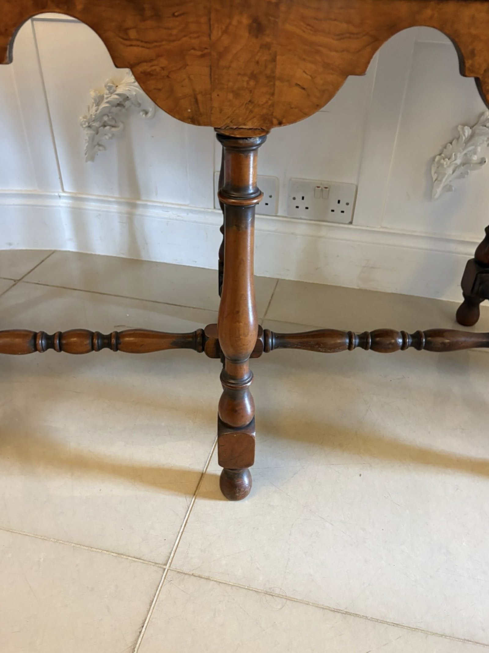 Unusual antique Edwardian quality burr walnut dresser base having a quality burr walnut rectangular shaped top with a moulded edge above three burr walnut drawers with original brass handles, attractive shaped apron supported by eight elegant turned tapering columns standing on turned feet united by lovely turned stretchers.