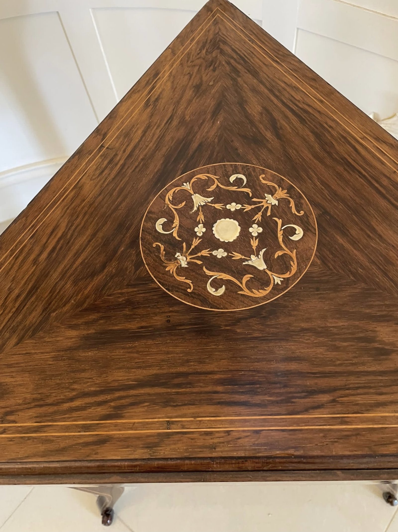 Unusual Antique Edwardian quality rosewood inlaid drop leaf centre table having a quality attractive rosewood inlaid top with three shaped rosewood prettily inlaid drop leaves supported by three square tapering inlaid legs with shaped feet united by a shaped inlaid undertier raised on original castors.