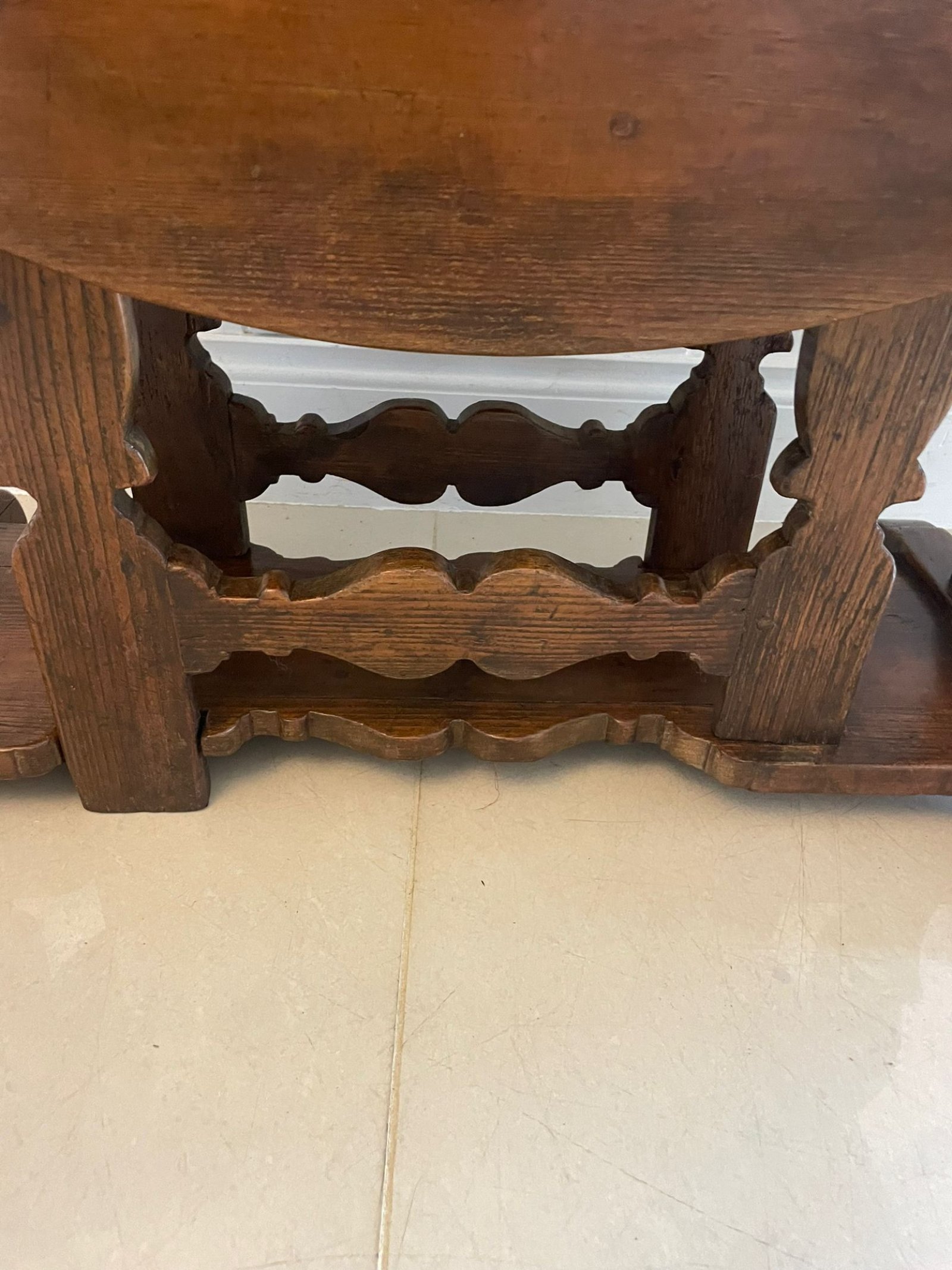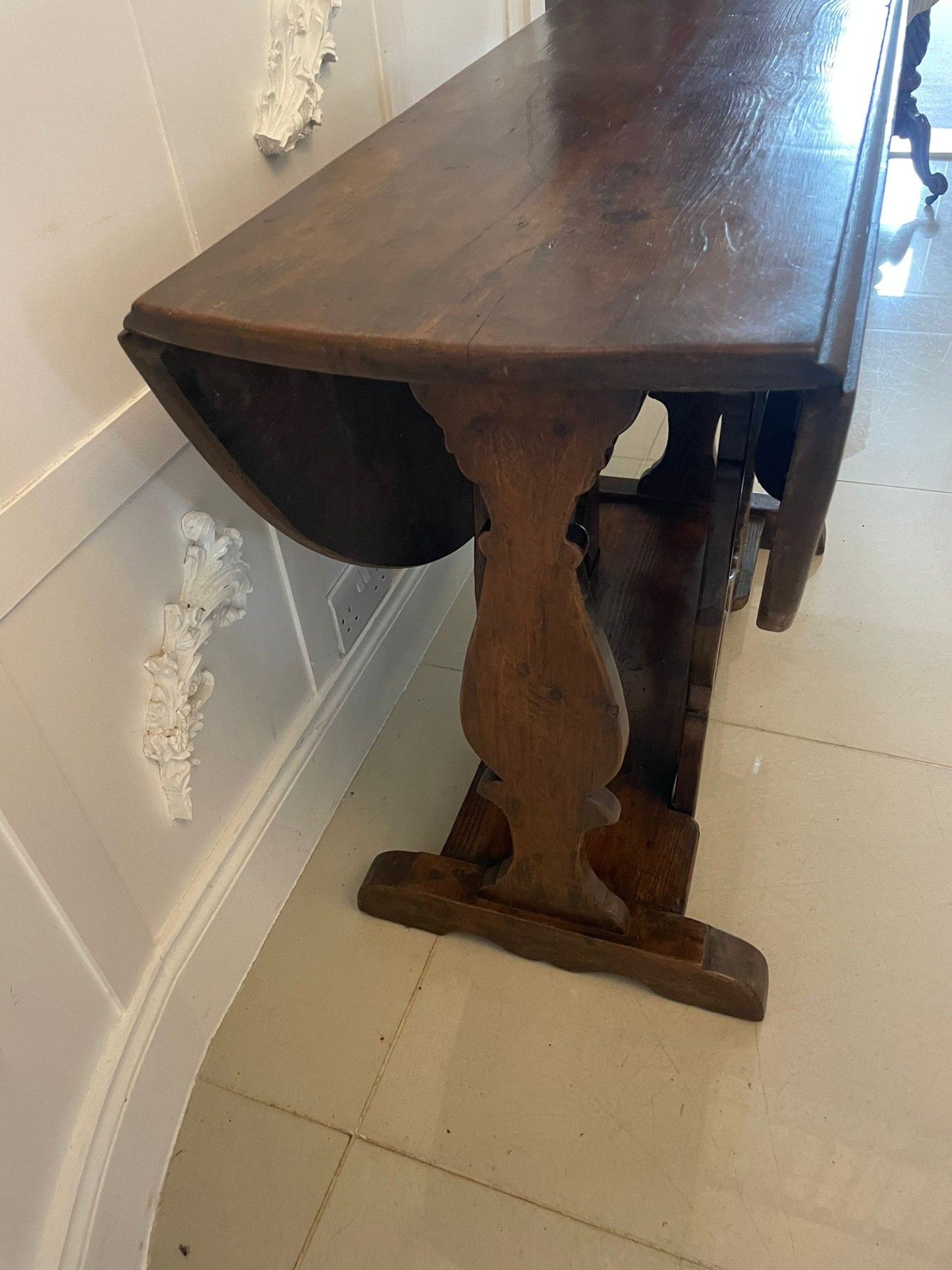 Unusual Antique George III pine drop leaf table Having a pine top with two oval drop leaves supported by shaped ends and two unusual shaped pine gate legs raised on block feet united by a shaped stretcher