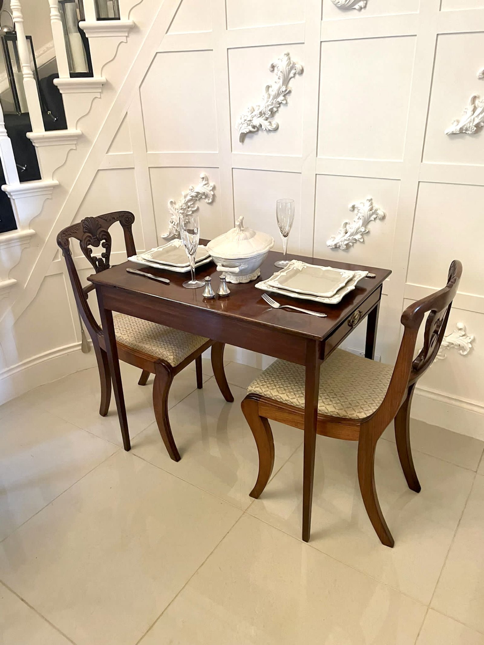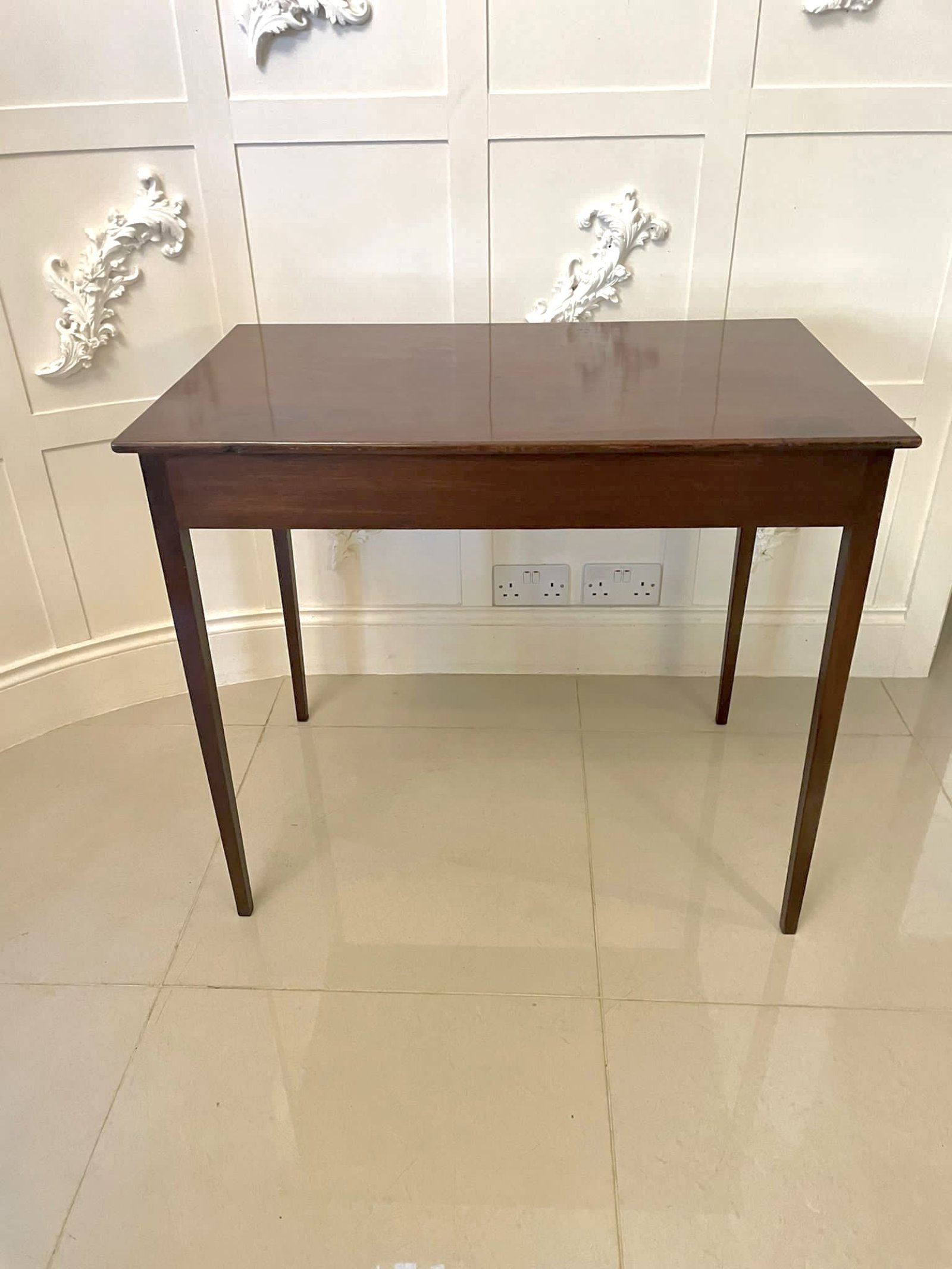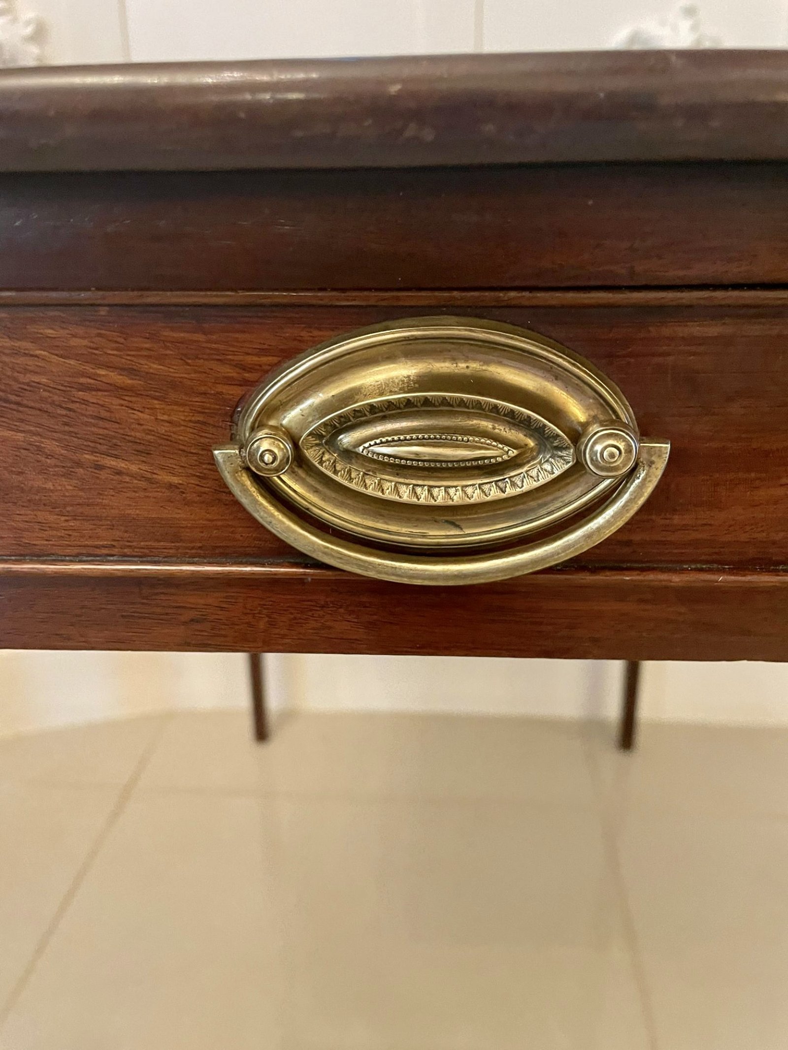 Unusual Antique George III quality mahogany freestanding side table having a quality mahogany top with a thumb moulded edge with a drawer to each side with original brass oval handles and standing on square tapering legs.