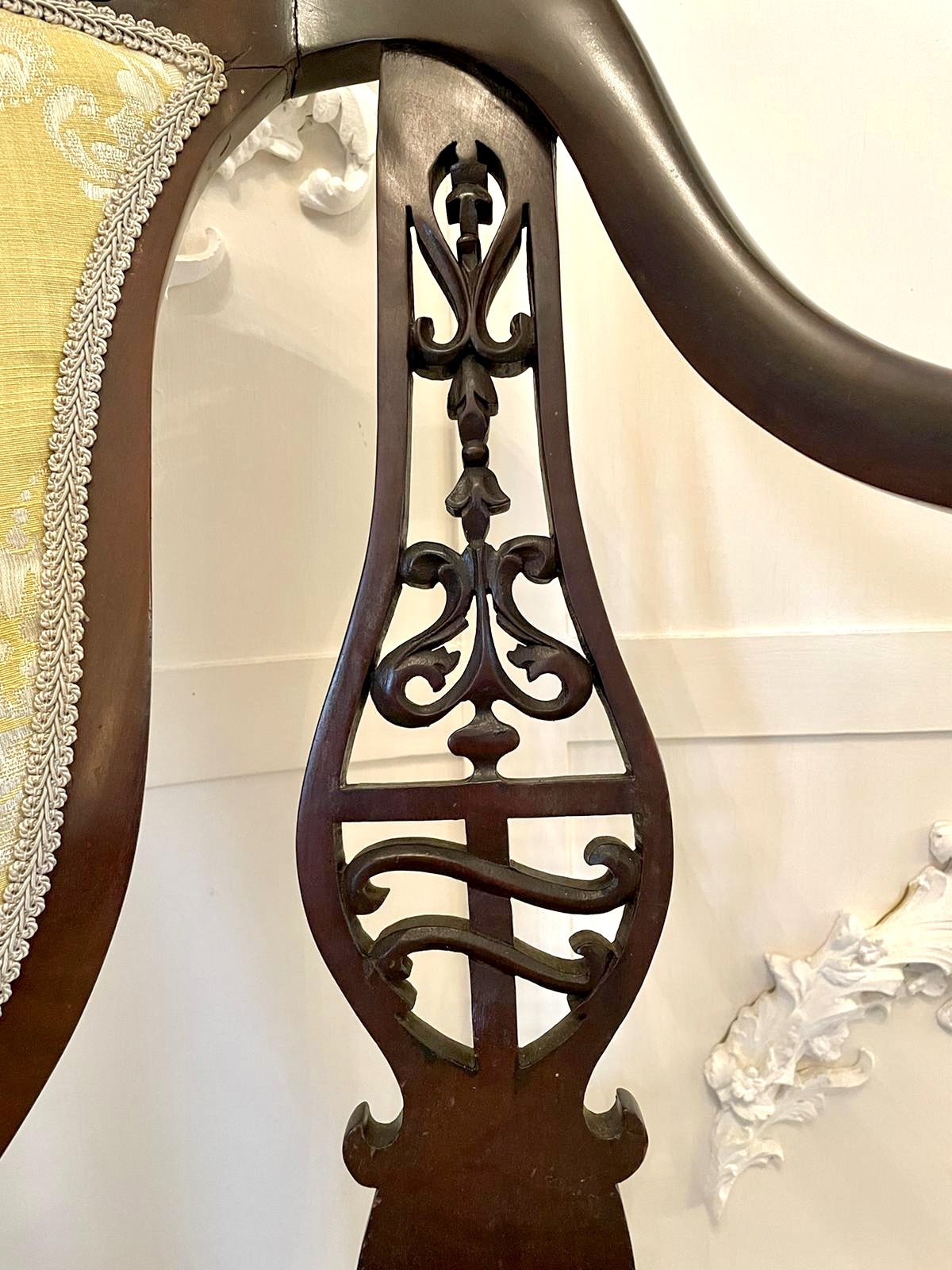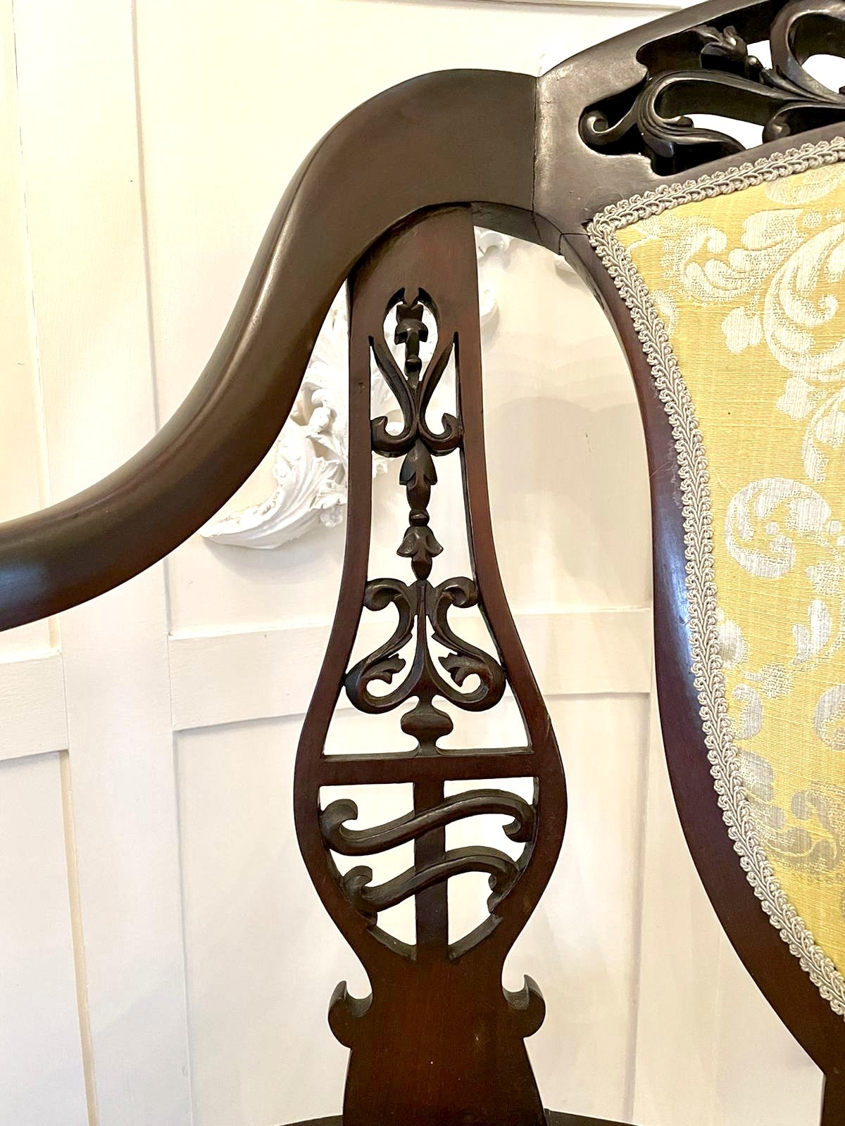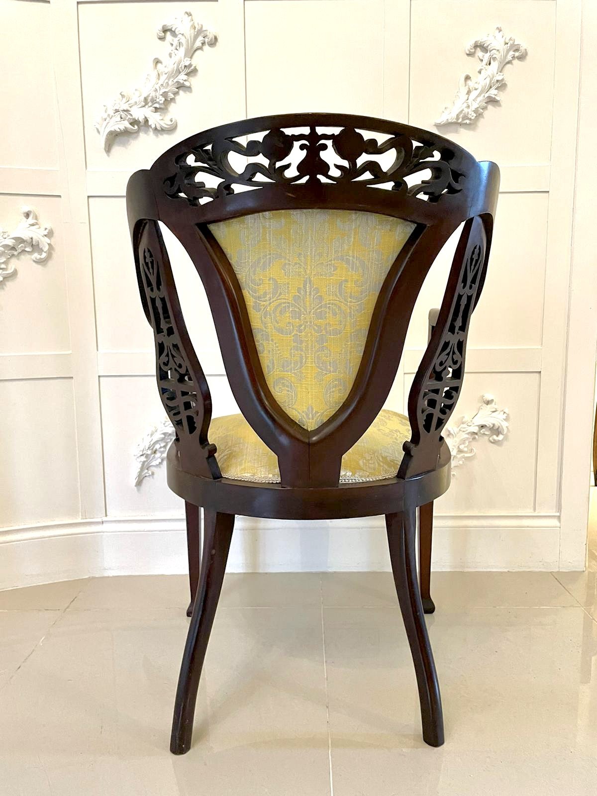 Unusual antique Victorian carved mahogany armchair having the most magnificent carved, pierced mahogany shaped top and two carved pierced mahogany shaped splats. It boasts pretty shaped open arms with unusual turned supports and raised on square tapering legs to the front with elegant shaped feet and out swept back legs. The seat and back have been newly reupholstered in a quality fabric.