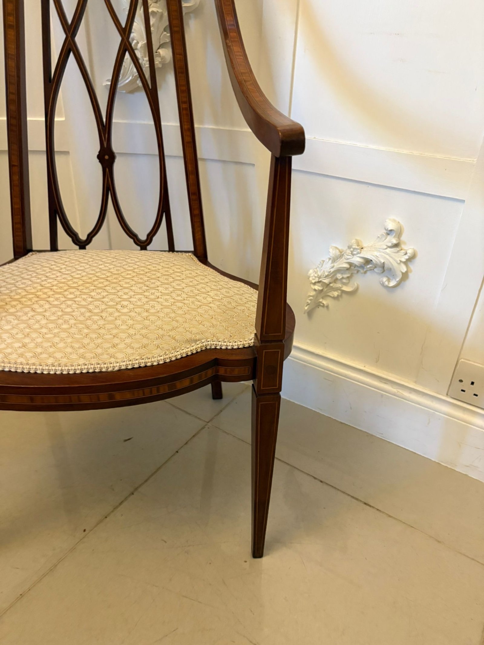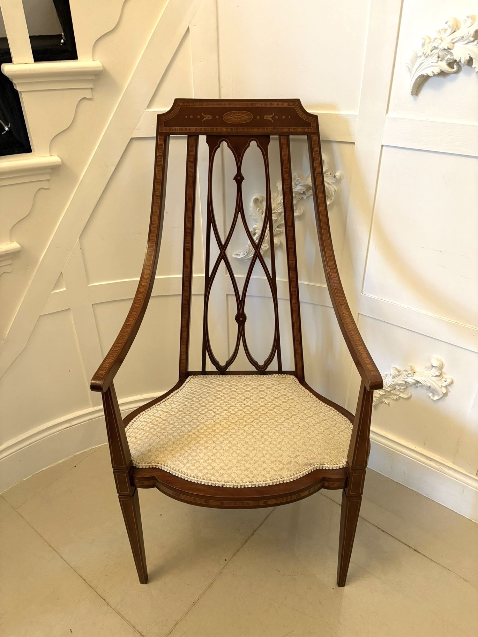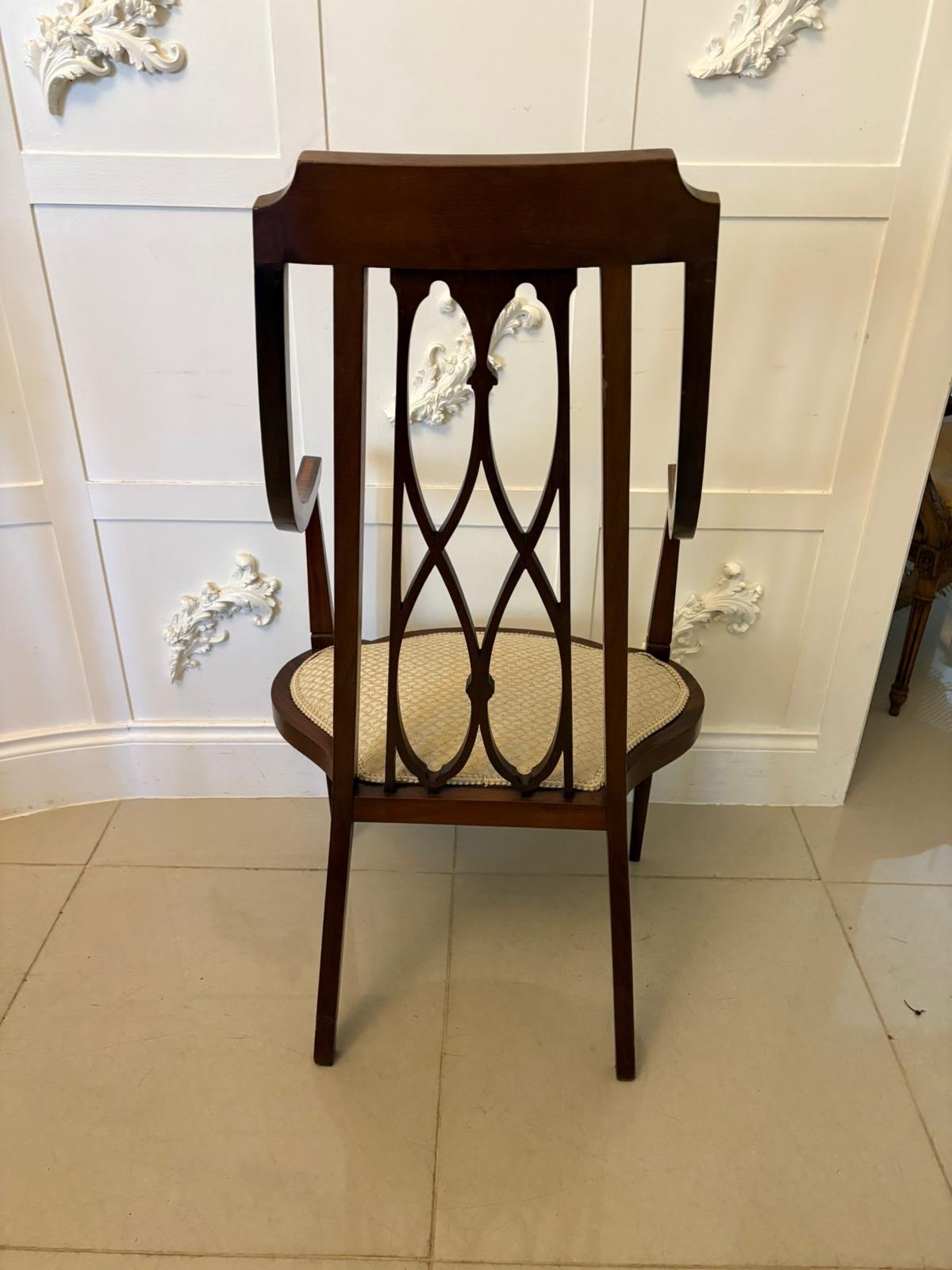 Unusual Victorian inlaid mahogany armchair having a shaped top rail with satinwood inlay and unusual pretty shaped open arms with satinwood inlay. The shaped pierced centre splat has been beautifully inlaid also in satinwood. This exceptional inlay continues to the shaped frieze and to the front of the elegant square tapering front legs, the back legs being outswept. Newly re-upholstered in a quality stylish fabric.