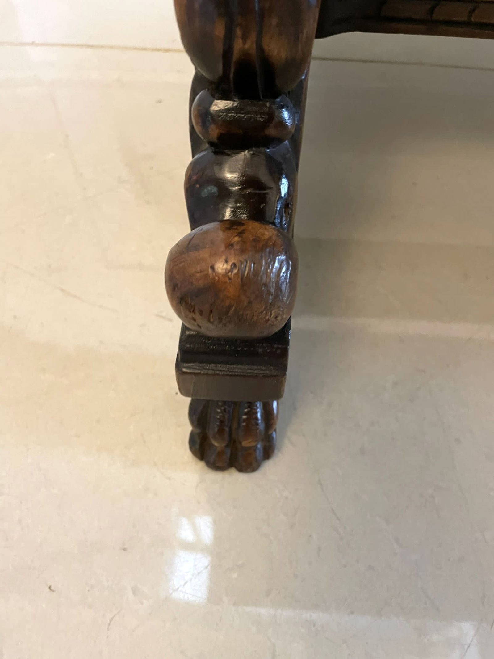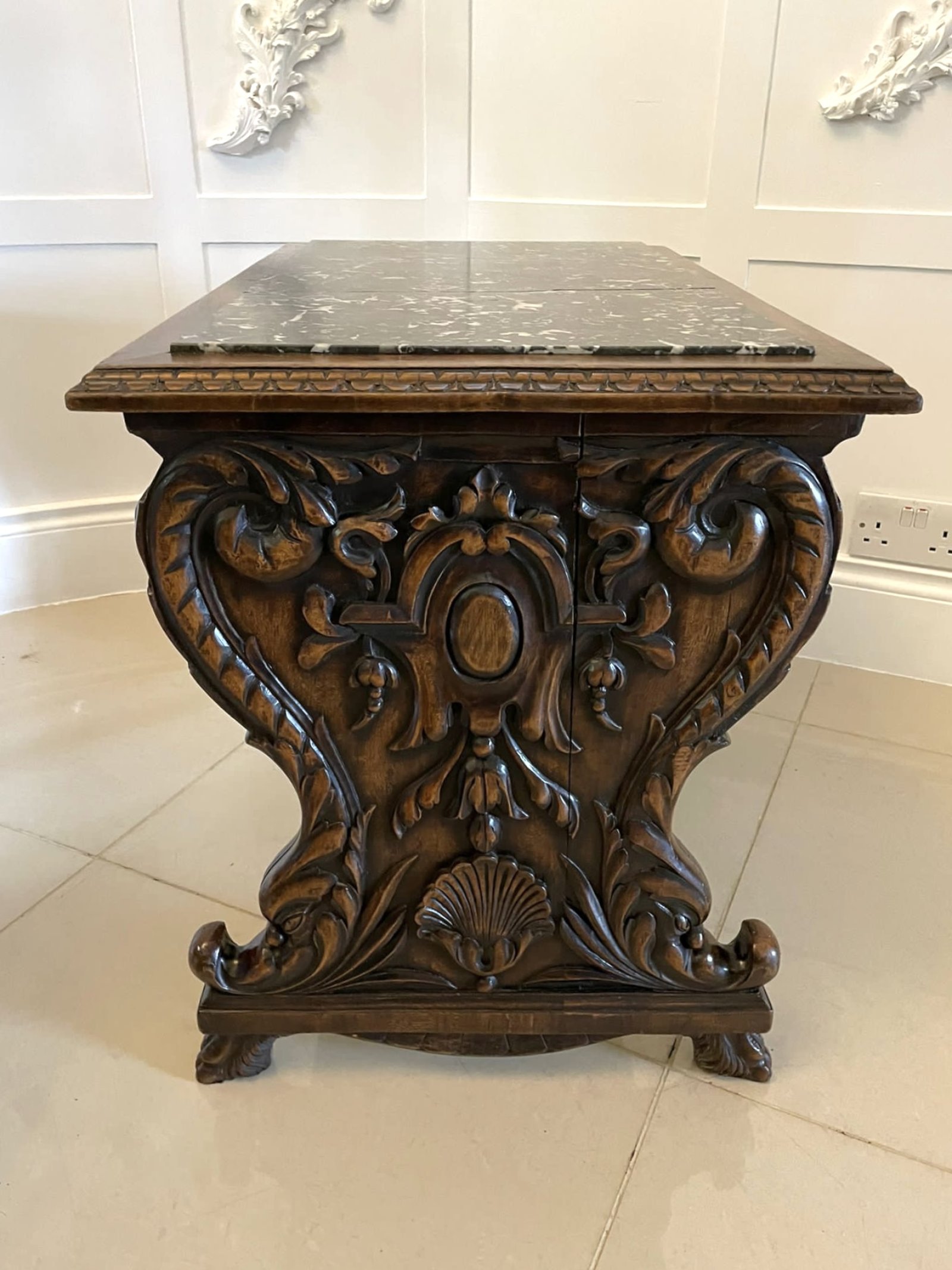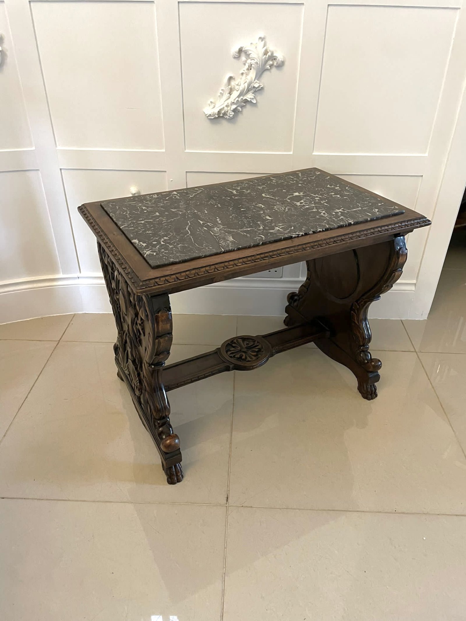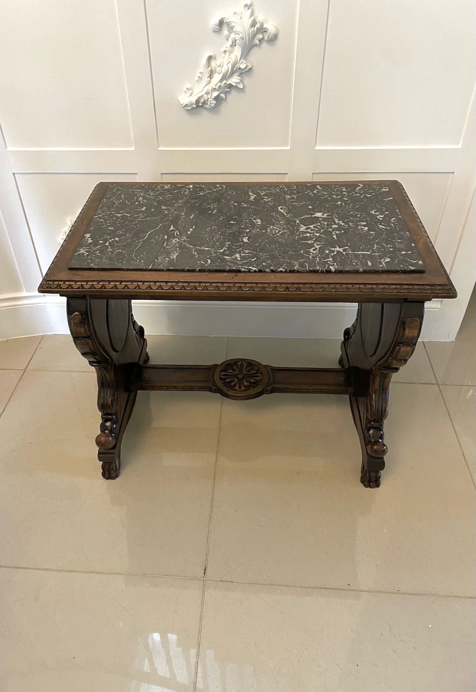 Unusual Antique Victorian quality carved walnut and marble top Italian coffee table having a rectangular shaped carved walnut top with a lovely marble insert supported by fantastic carved walnut shaped supports raised on carved walnut claw feet and united by a carved walnut shaped stretcher