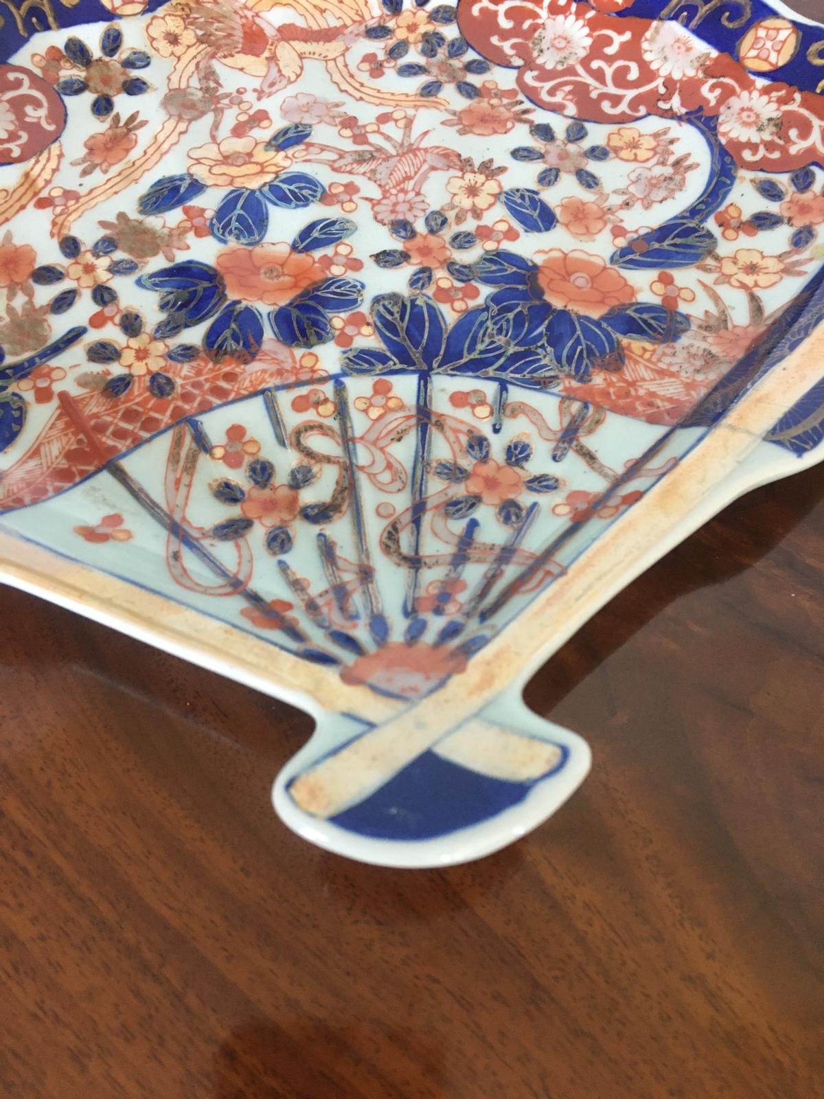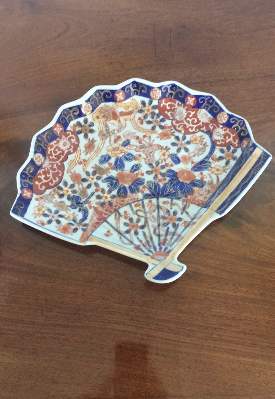 Unusual Imari style fan shaped plate having wonderfully vivid red, blue and gold coloured decoration.