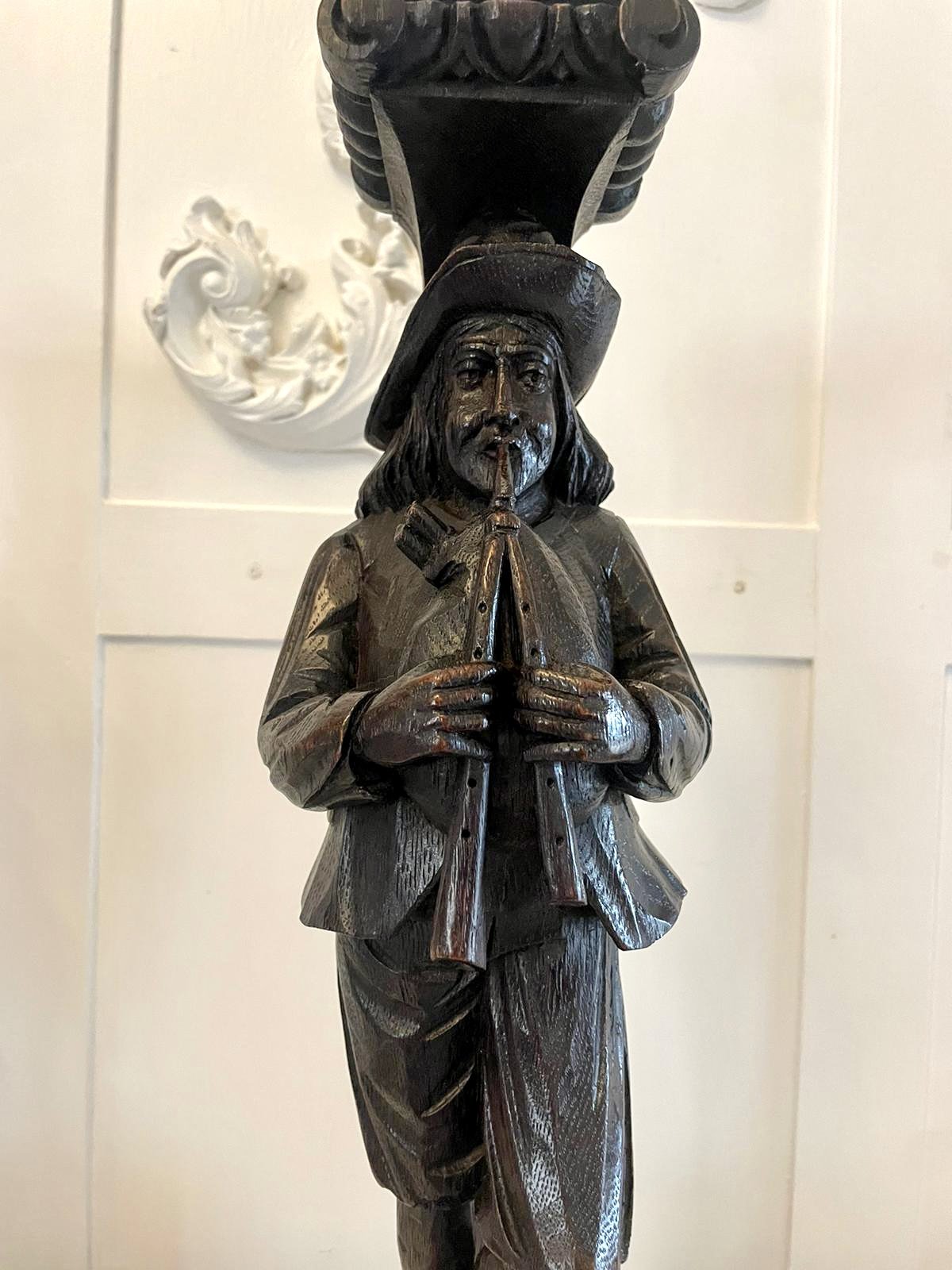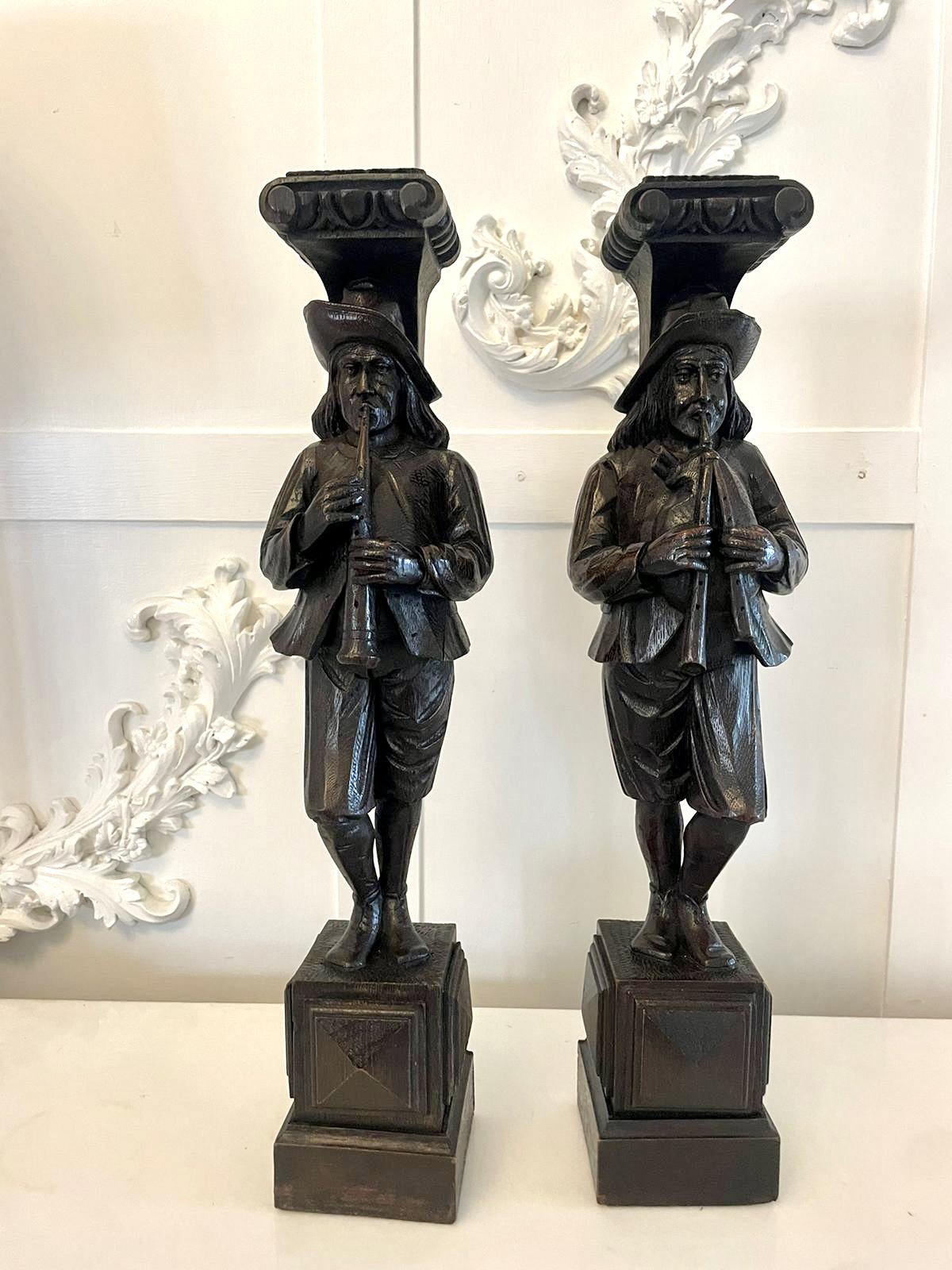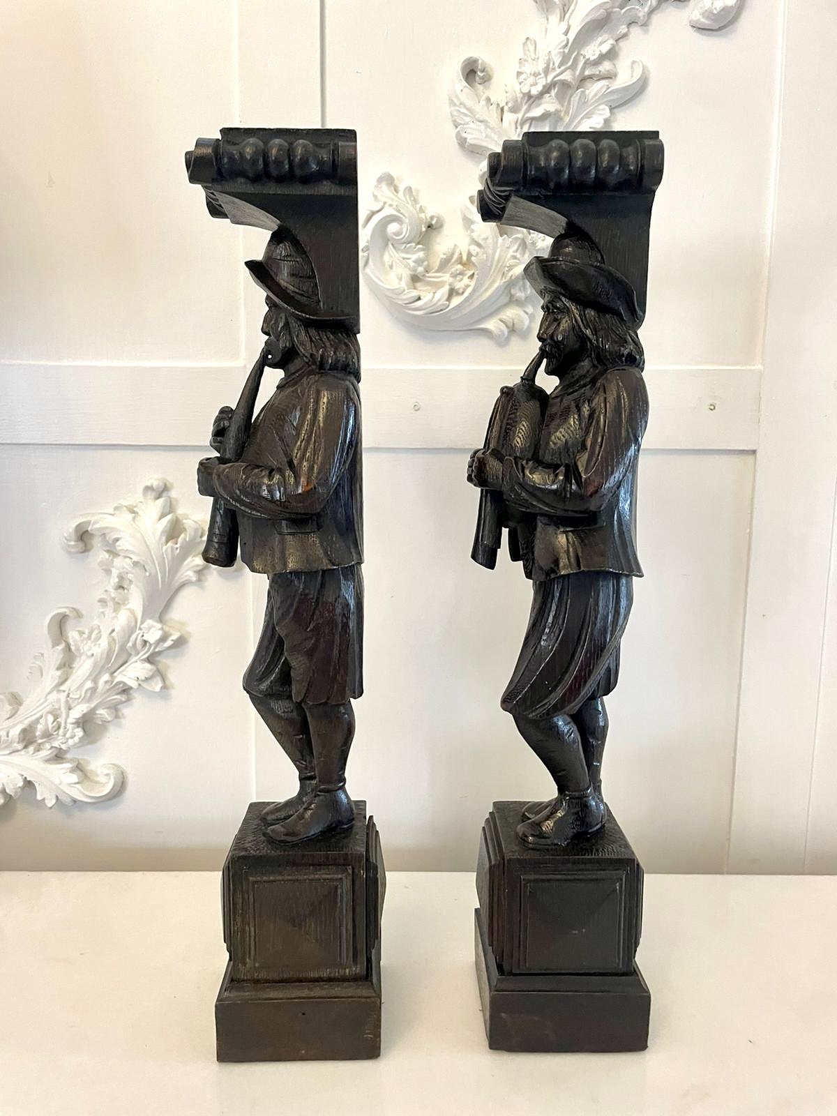 Unusual pair of antique Victorian quality carved oak figures of two gentlemen dressed in period costumes playing a musical instrument and standing on square bases