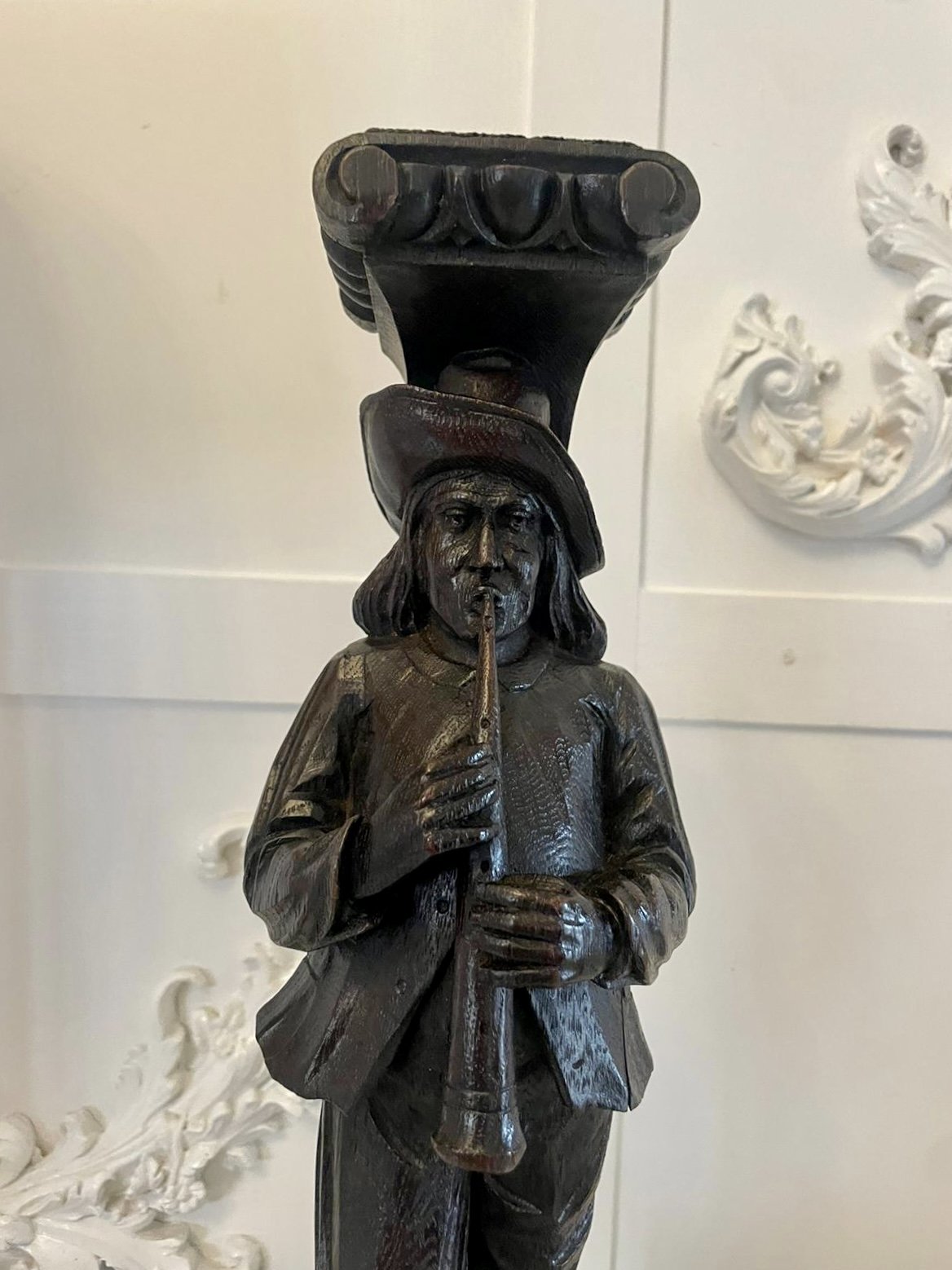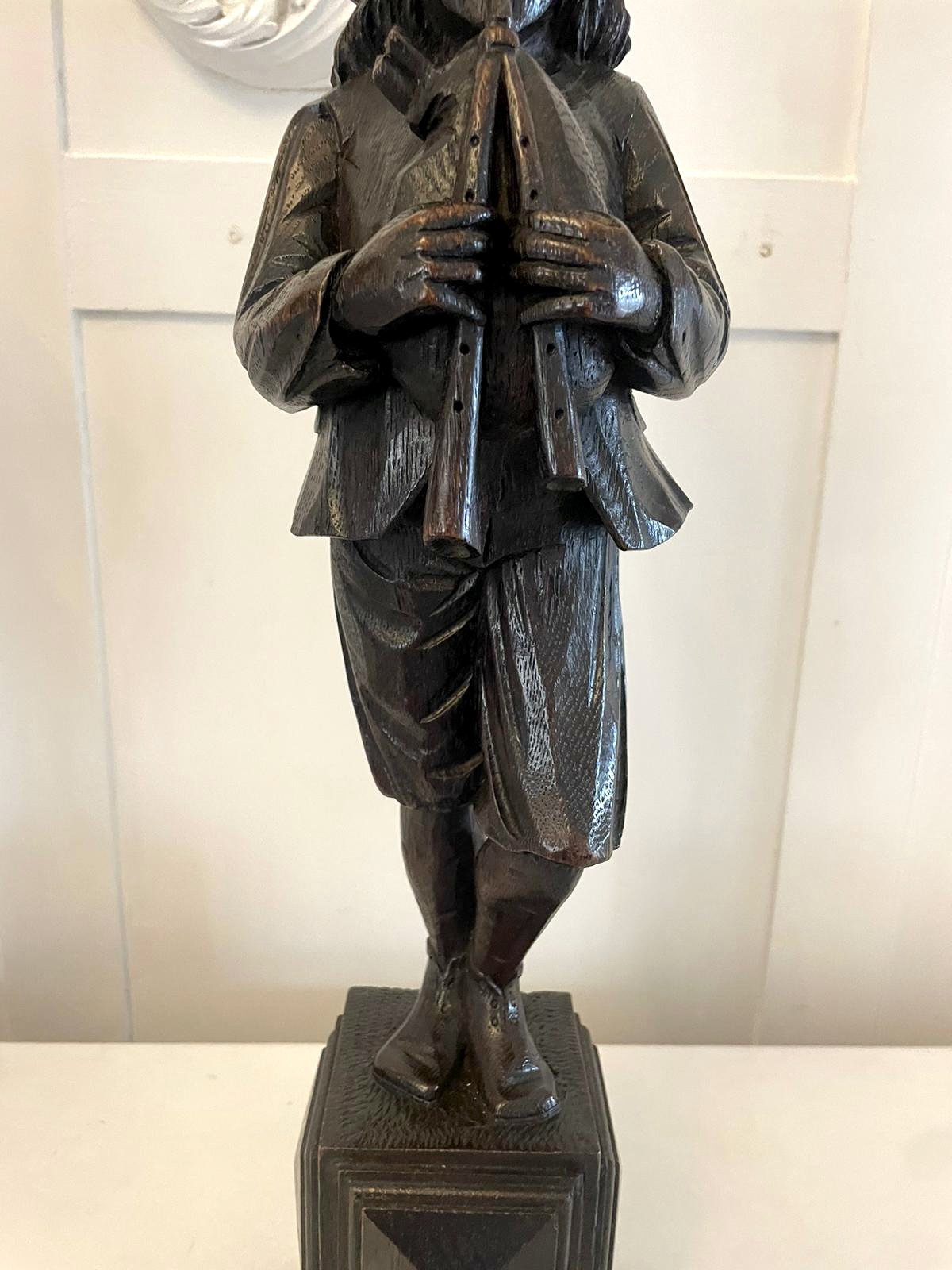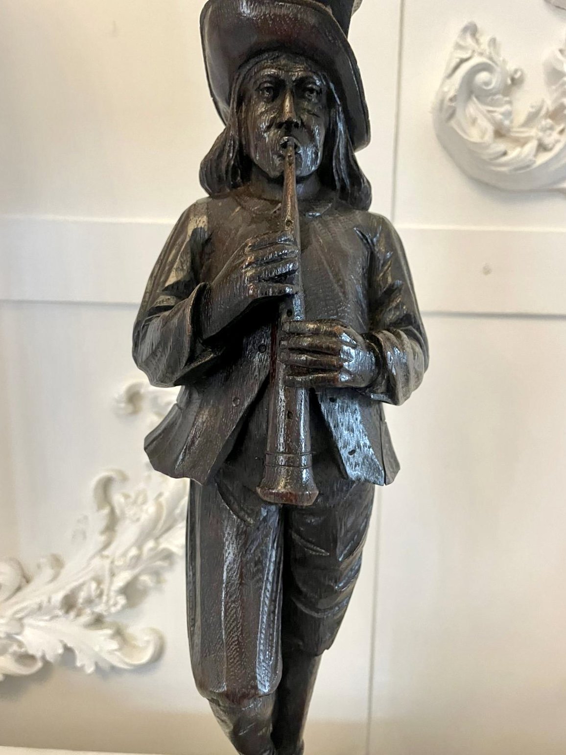 Unusual pair of antique Victorian quality carved oak figures of two gentlemen dressed in period costumes playing a musical instrument and standing on square bases