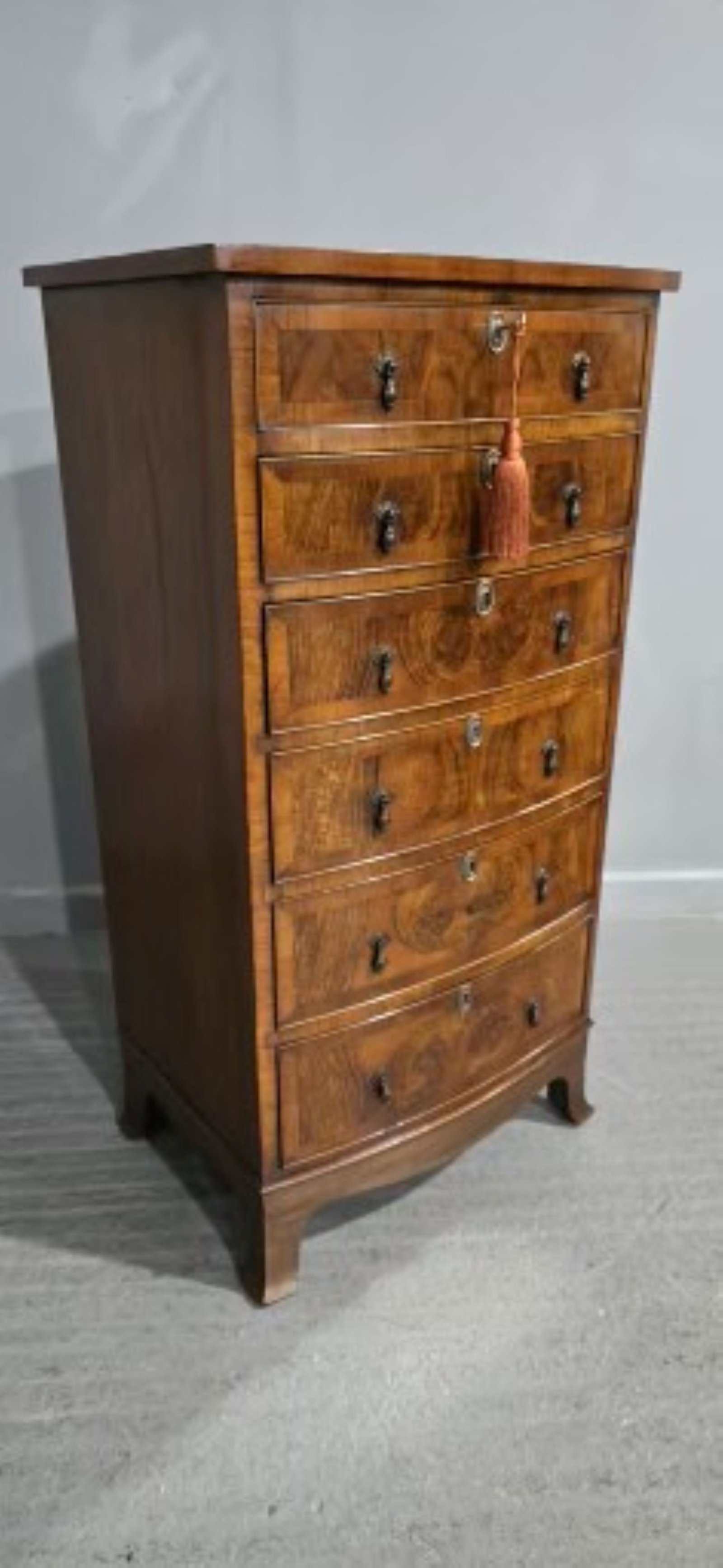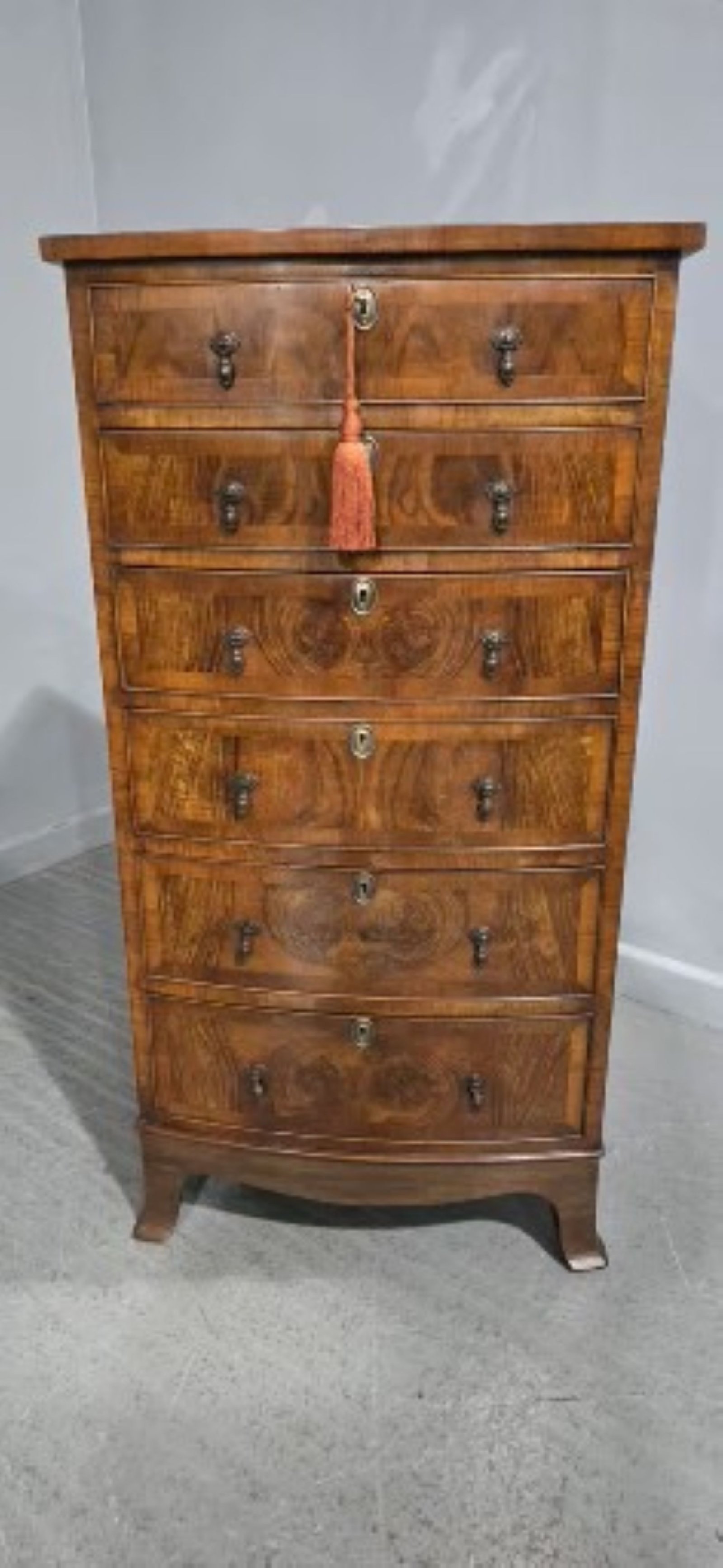 See shipping detailsA very good tall Queen Anne style burr walnut bowed chest of drawers, six graduated drawers with locks, standing on spayed bracket feet, oak lined throughout, very good colour and condition.