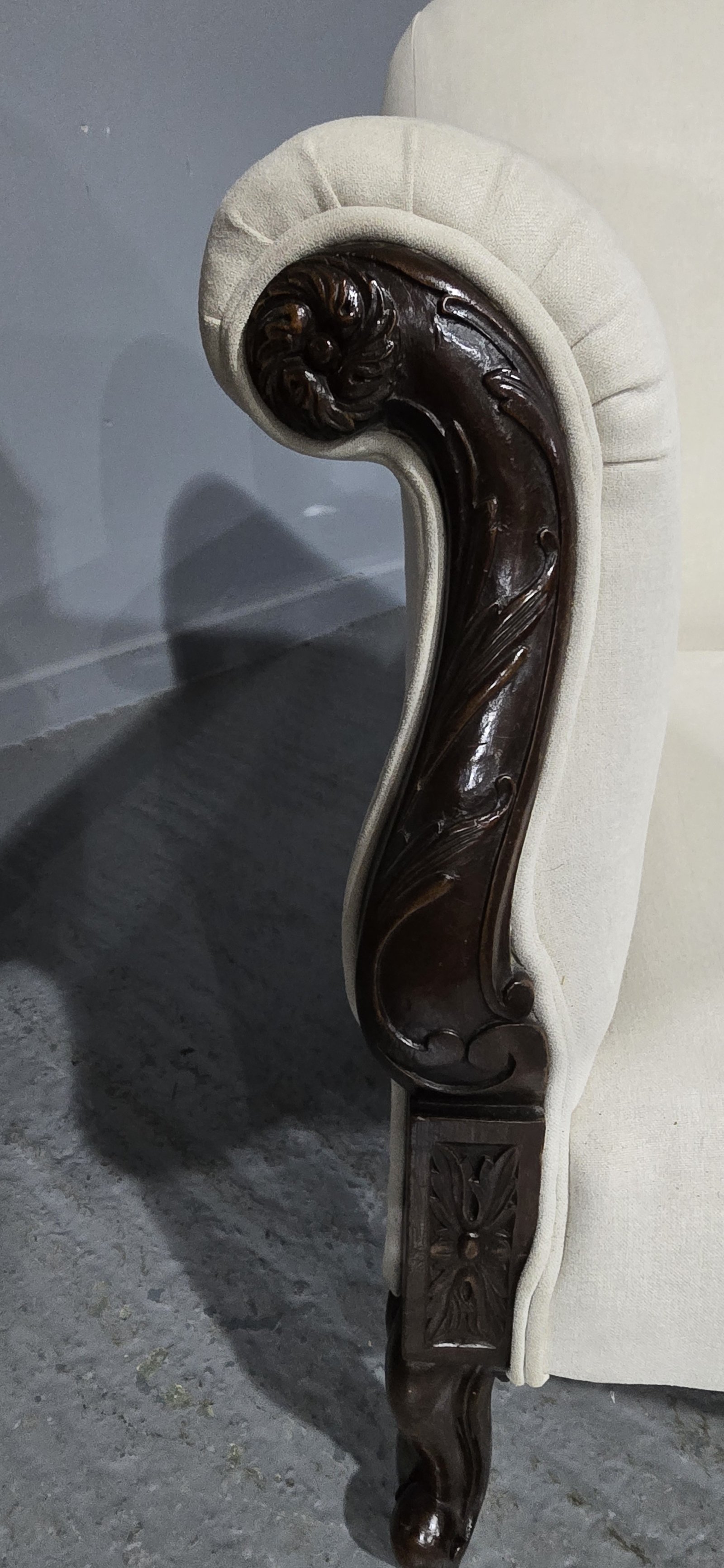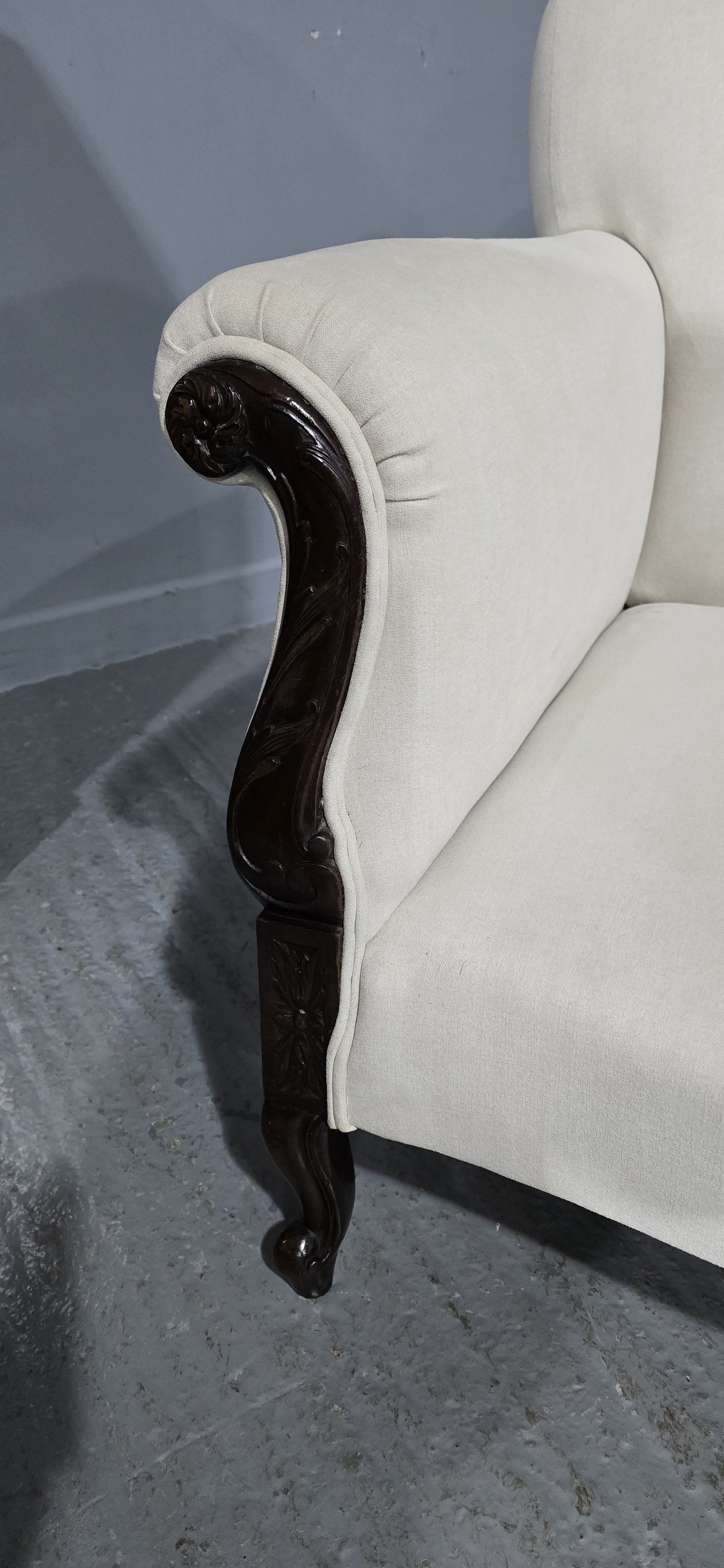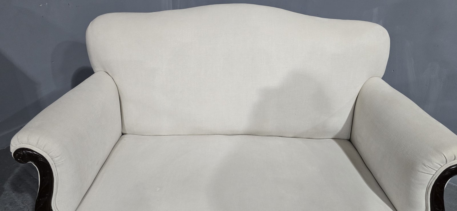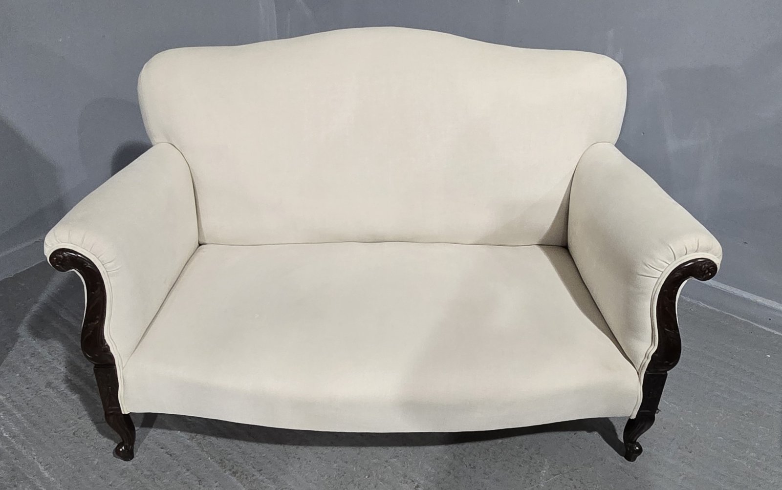 A very good cream plush upholstered two seater couch with a mahogany frame, with curved arms and standing on small cabriole legs. In overall very nice condition.