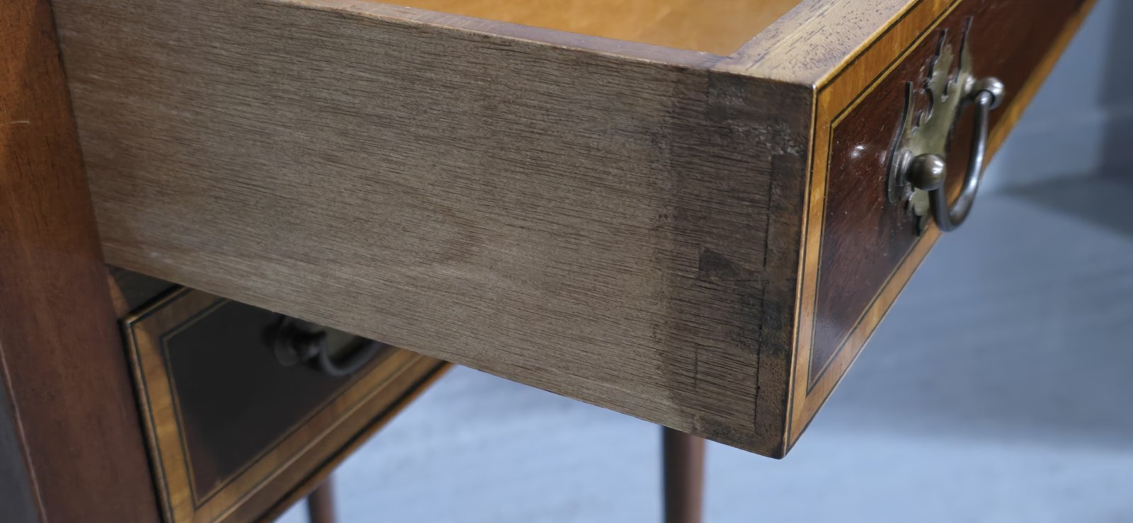 A very pretty and lovely quality Edwardian mahogany two drawer side table with satin wood banding, brass plate handles, small gallery, in overall excellent colour and condition.