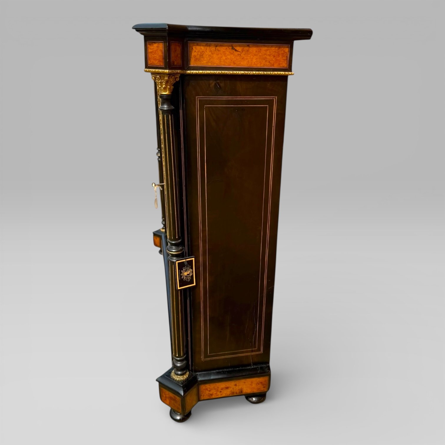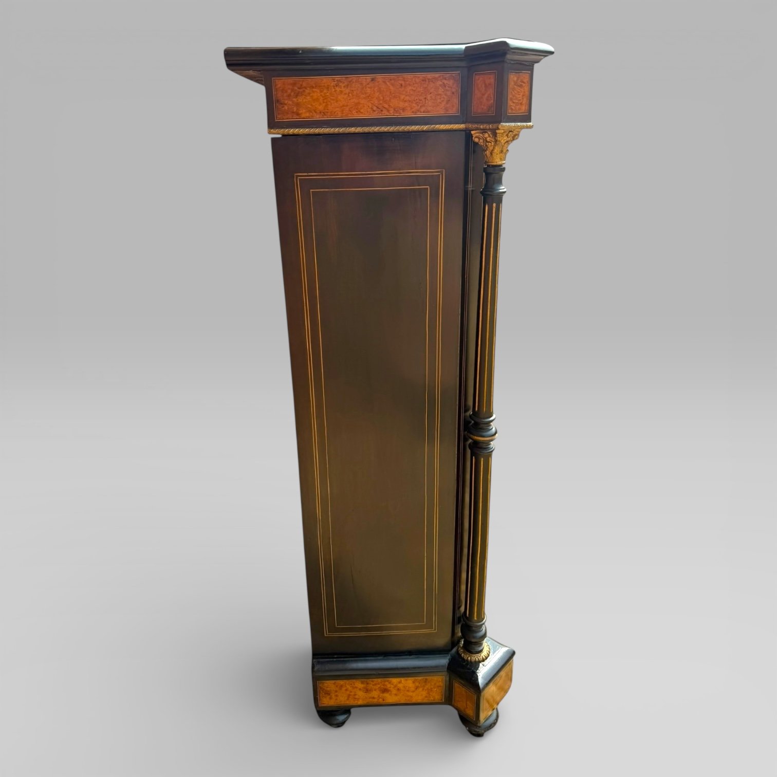 A Victorian amboyna and ebonised pier cabinet in the Aesthetic Movement style, circa 1870–1890. The cabinet is fitted with a pair of glazed doors, flanked by ebonised and gilt-carved pilasters, and opens to an interior with three fabric-lined shelves and mirrored back. The exterior is embellished with brass mounts and fine inlay borders, the whole raised on four turned toupie feet.