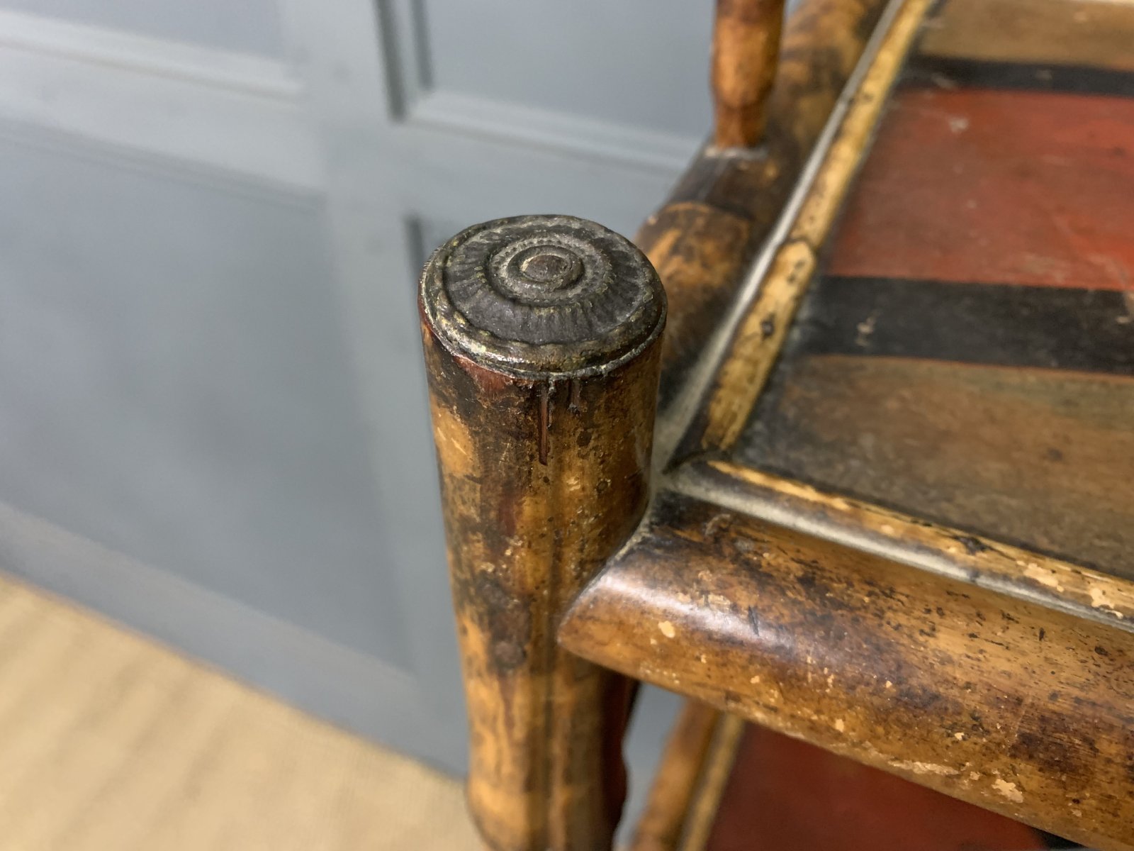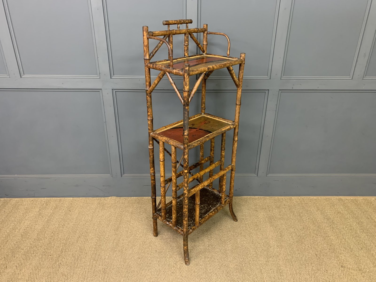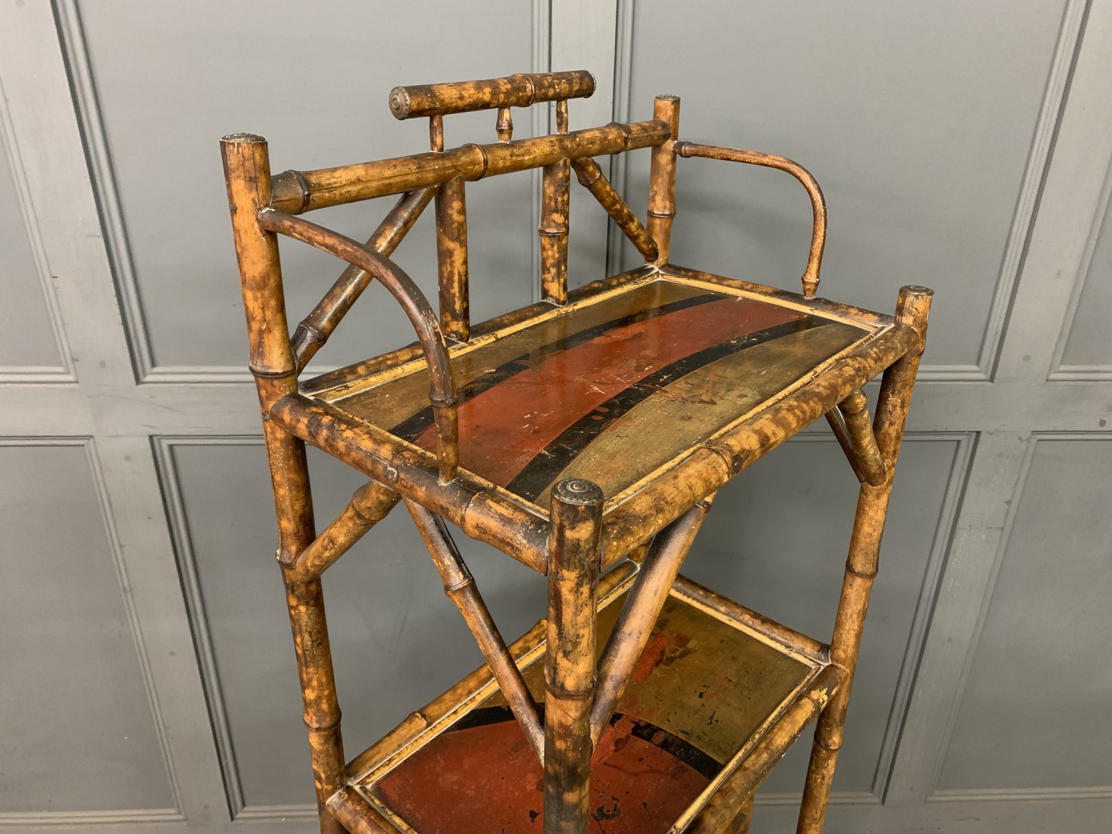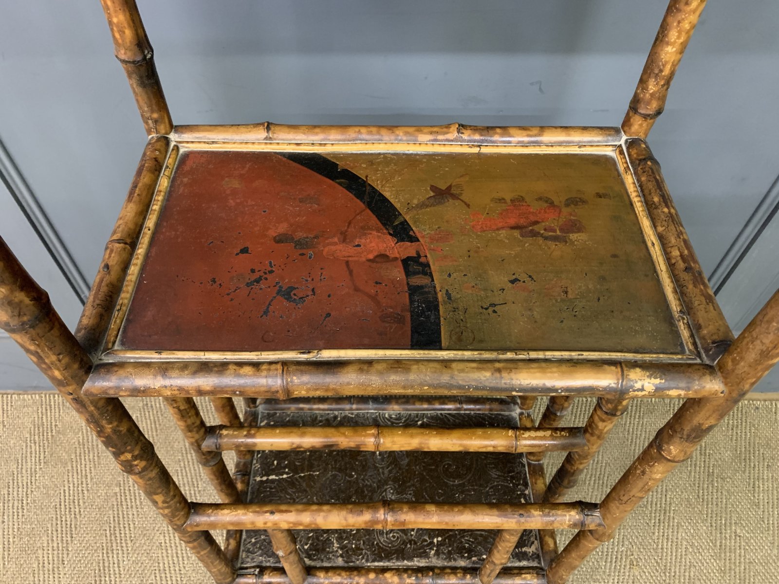 A lovely decorative Victorian period bamboo canterbury whatnot. Well constructed in bamboo with decorative lacquered panels and an embossed leather panel to the base. Offered for sale in good antique condition with some minor imperfections.