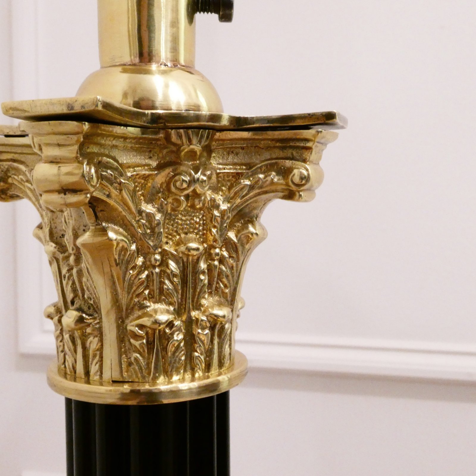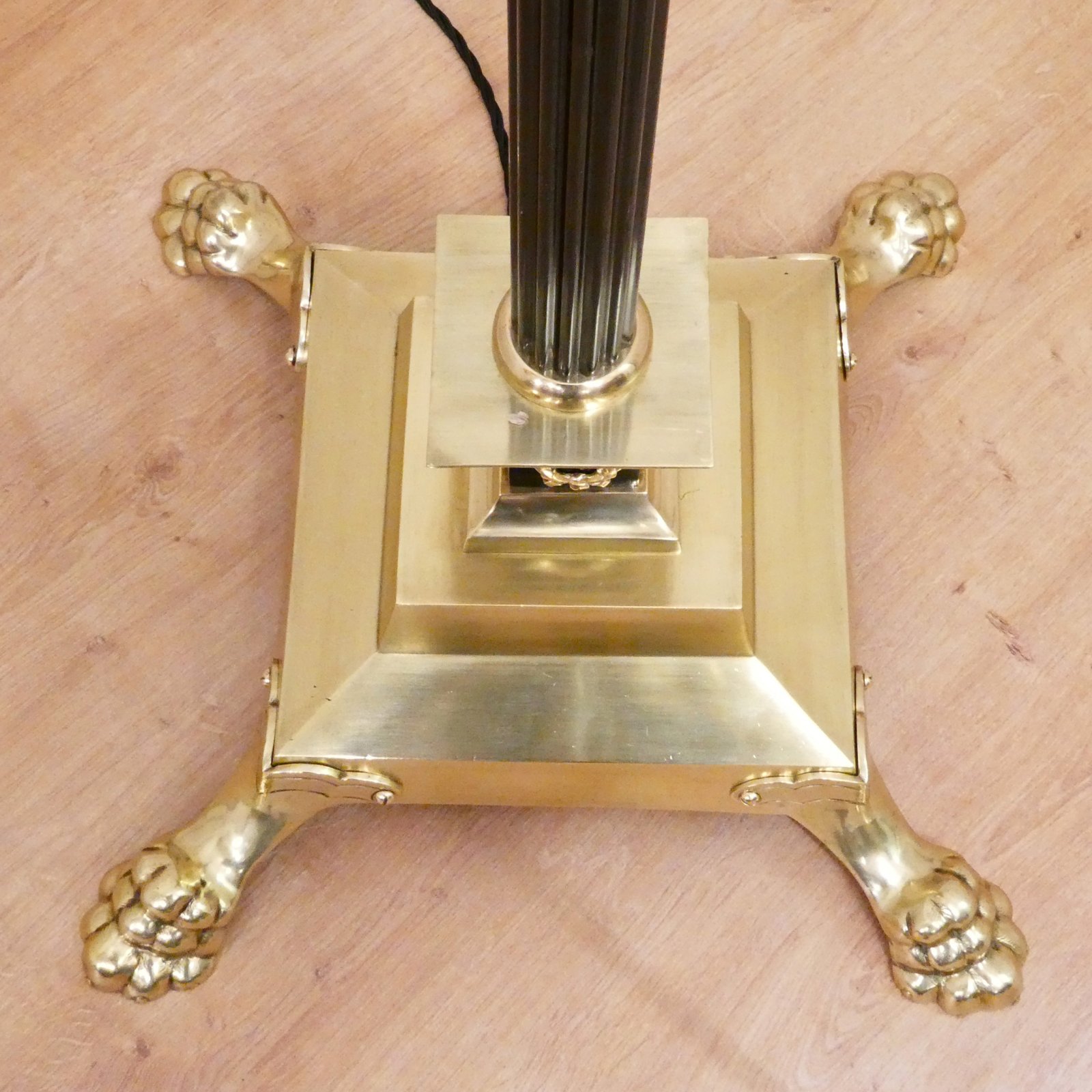 An extremely good quality Victorian brass Corinthian column antique standard floor lamp with ebonised reeded central column and decorative foliate design capital. The lamp has a square stepped base with ebonised detail and laurel leaf wreaths, terminating to lions paw feet.