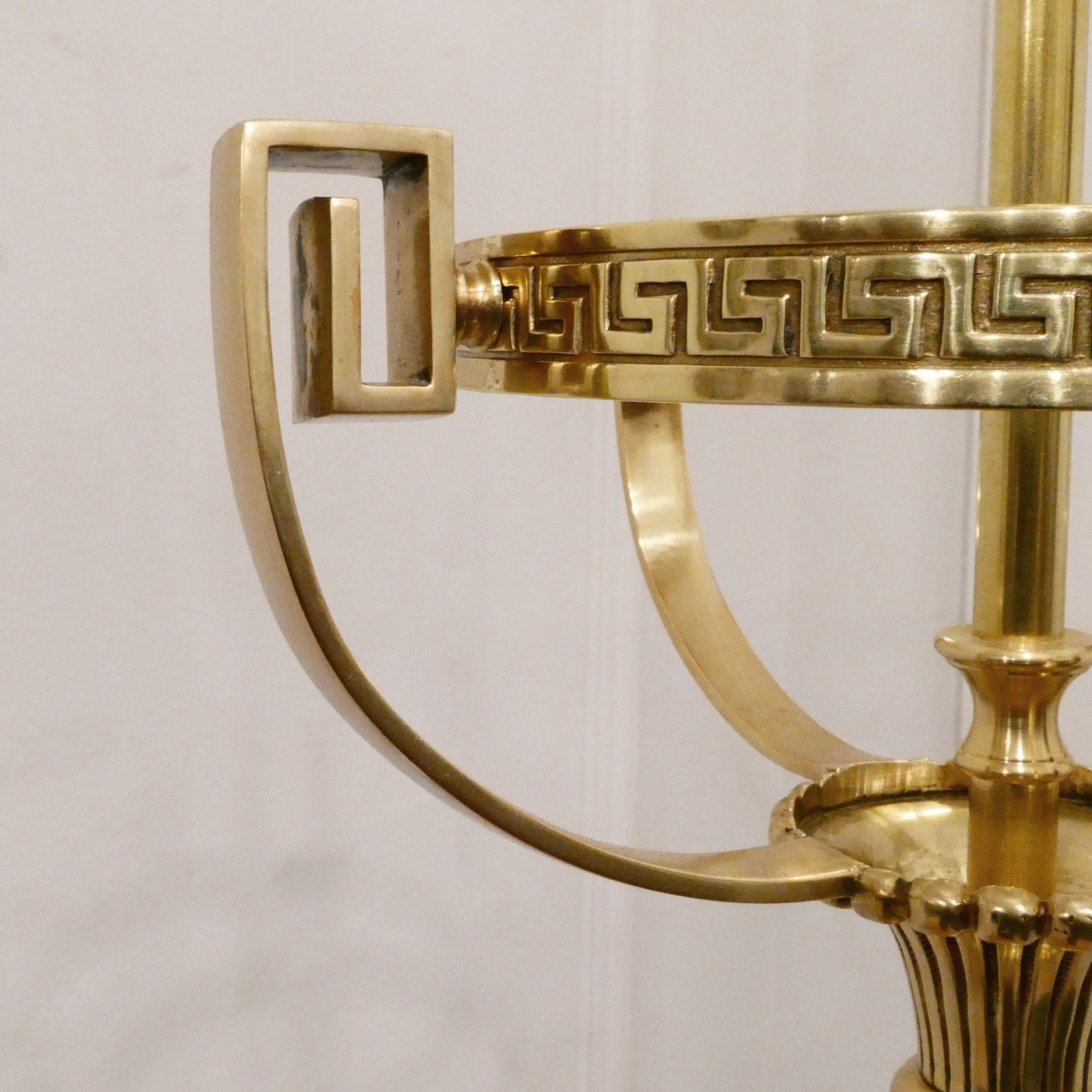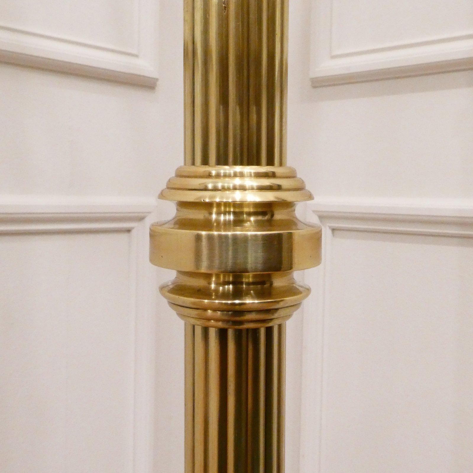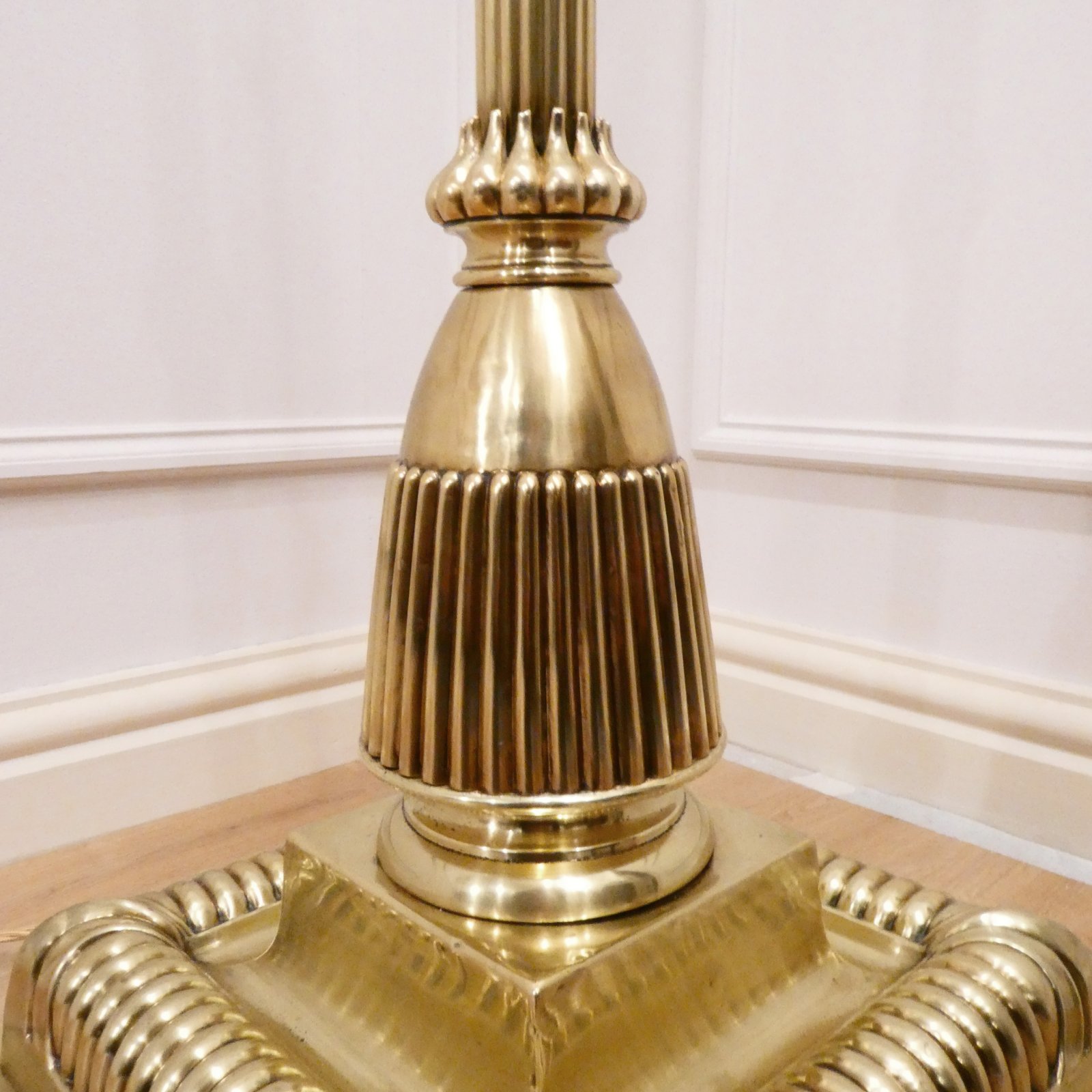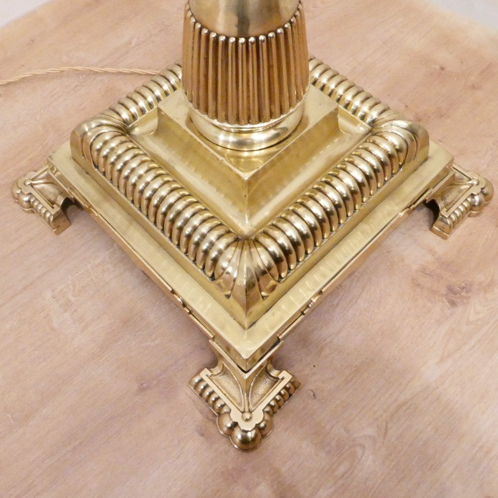 A Victorian brass antique standard floor lamp with central fluted column and Greek key design to the top, terminating to square base with further fluted design, standing on decorative shaped feet.