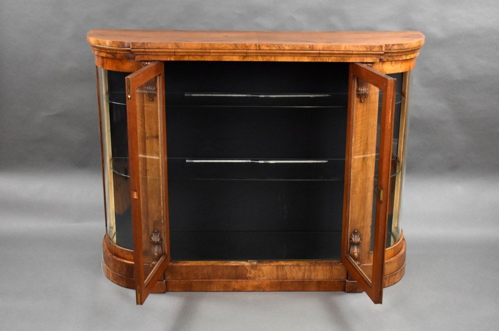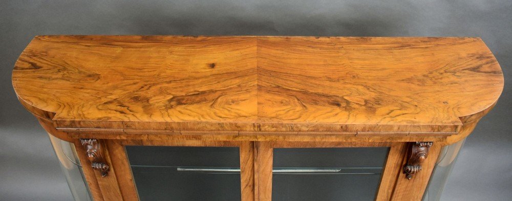 For sale is a Victorian burr walnut credenza, having glass doors and bowed ends, standing on a plinth base. This piece remains in very good condition.